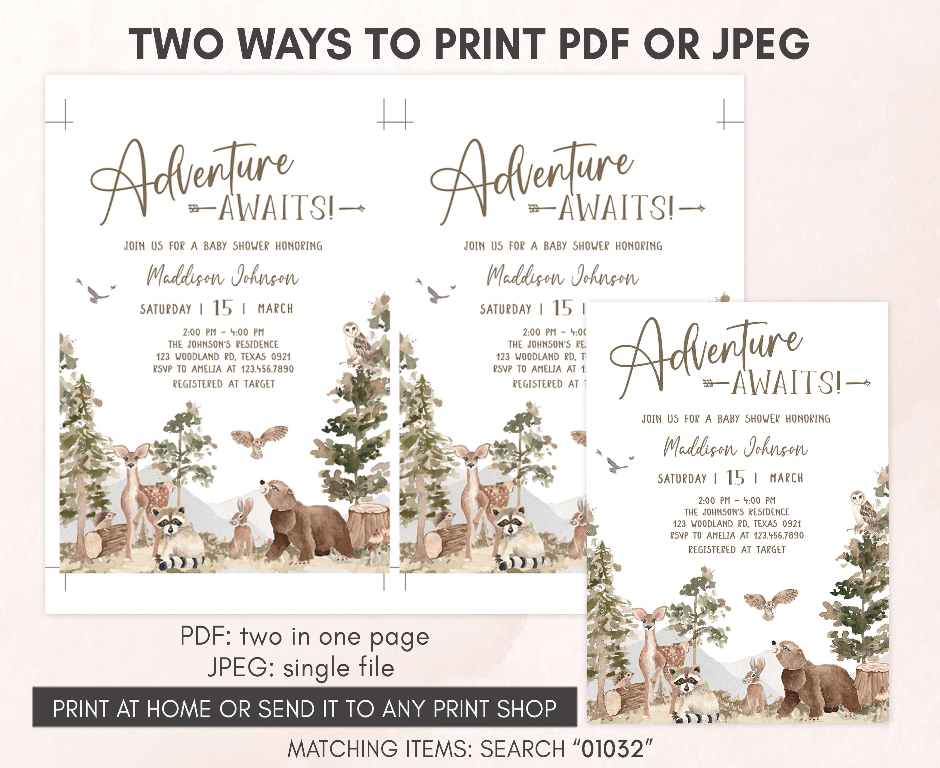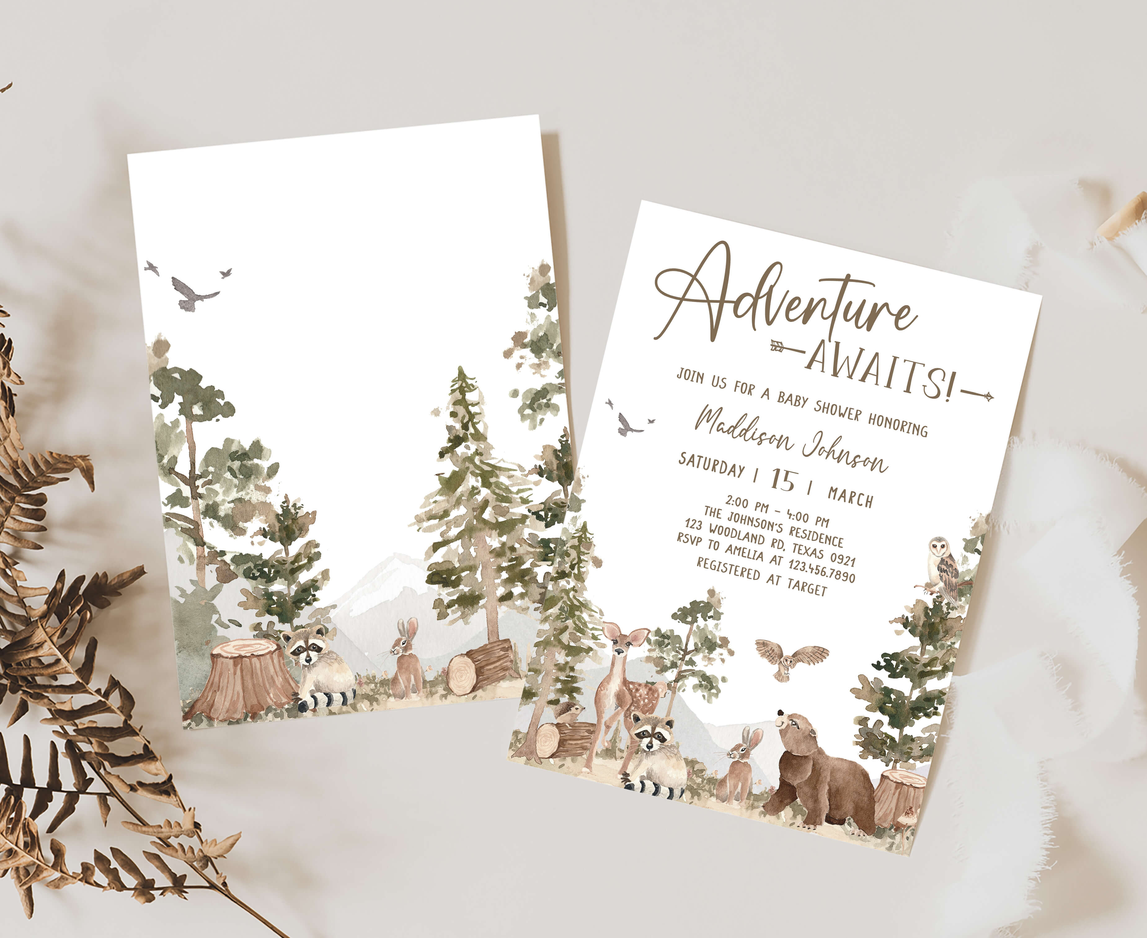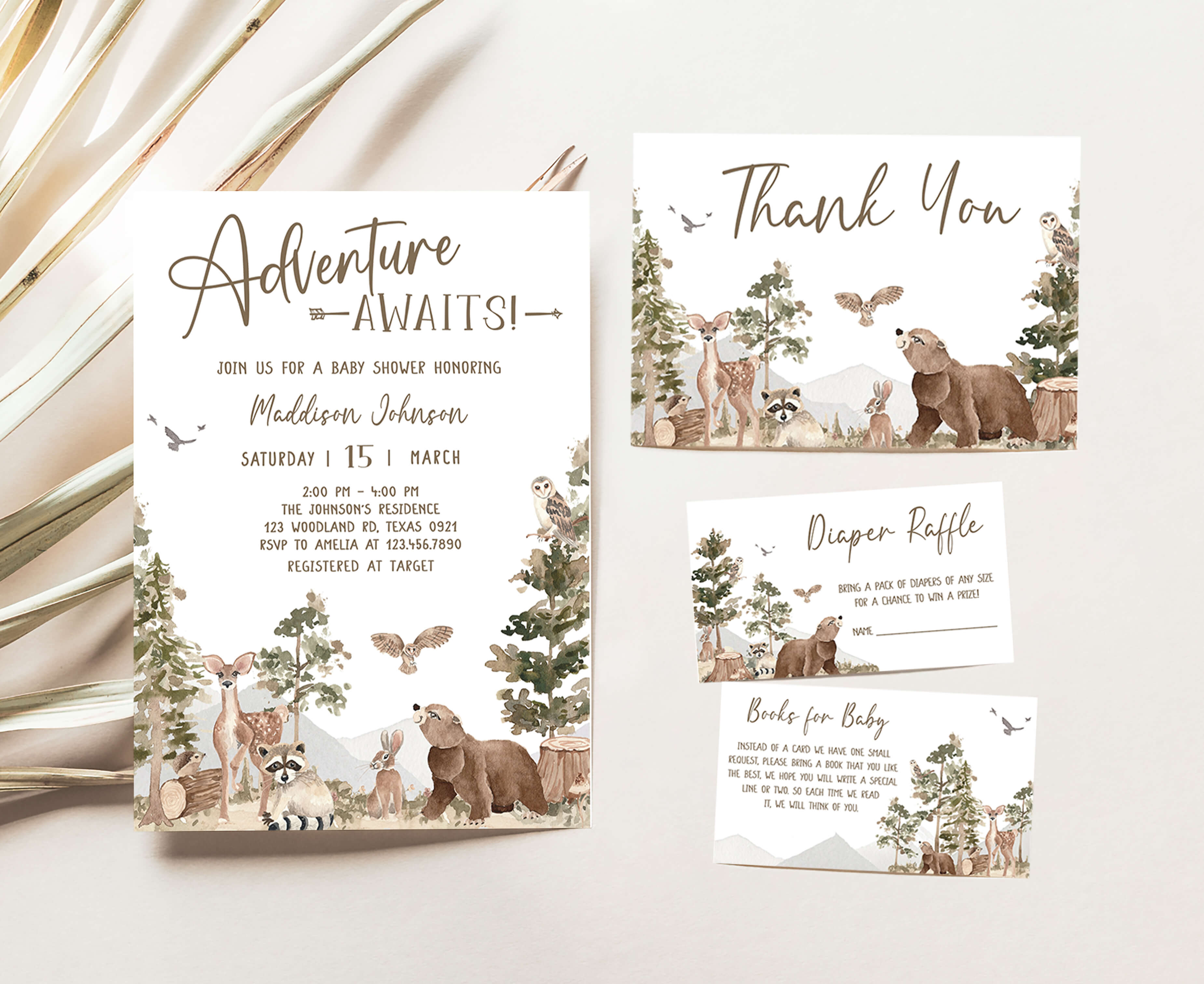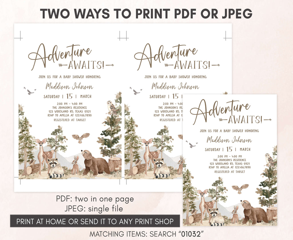 Celebrate with your guests at your Rustic Outdoor Baby Shower Party using our delightful Adventure Awaits Baby Shower Invitation Bundle. This Forest Animals Baby Shower Invite is the ideal choice to tone for an Outdoor-themed celebration.