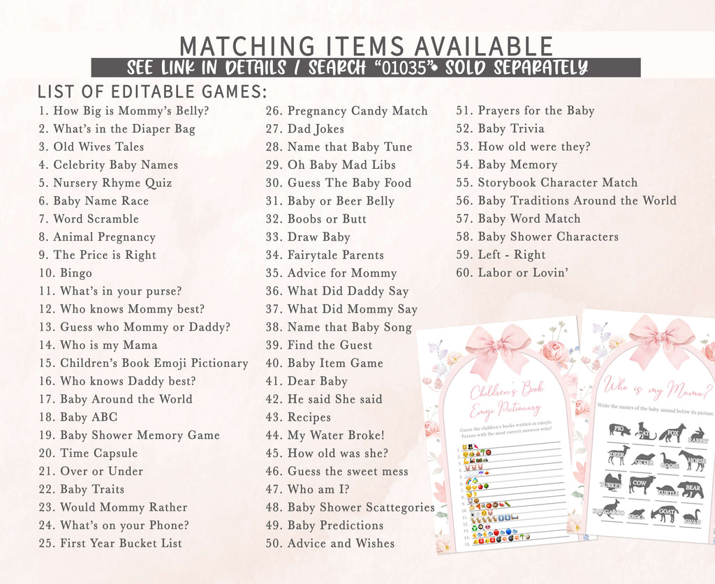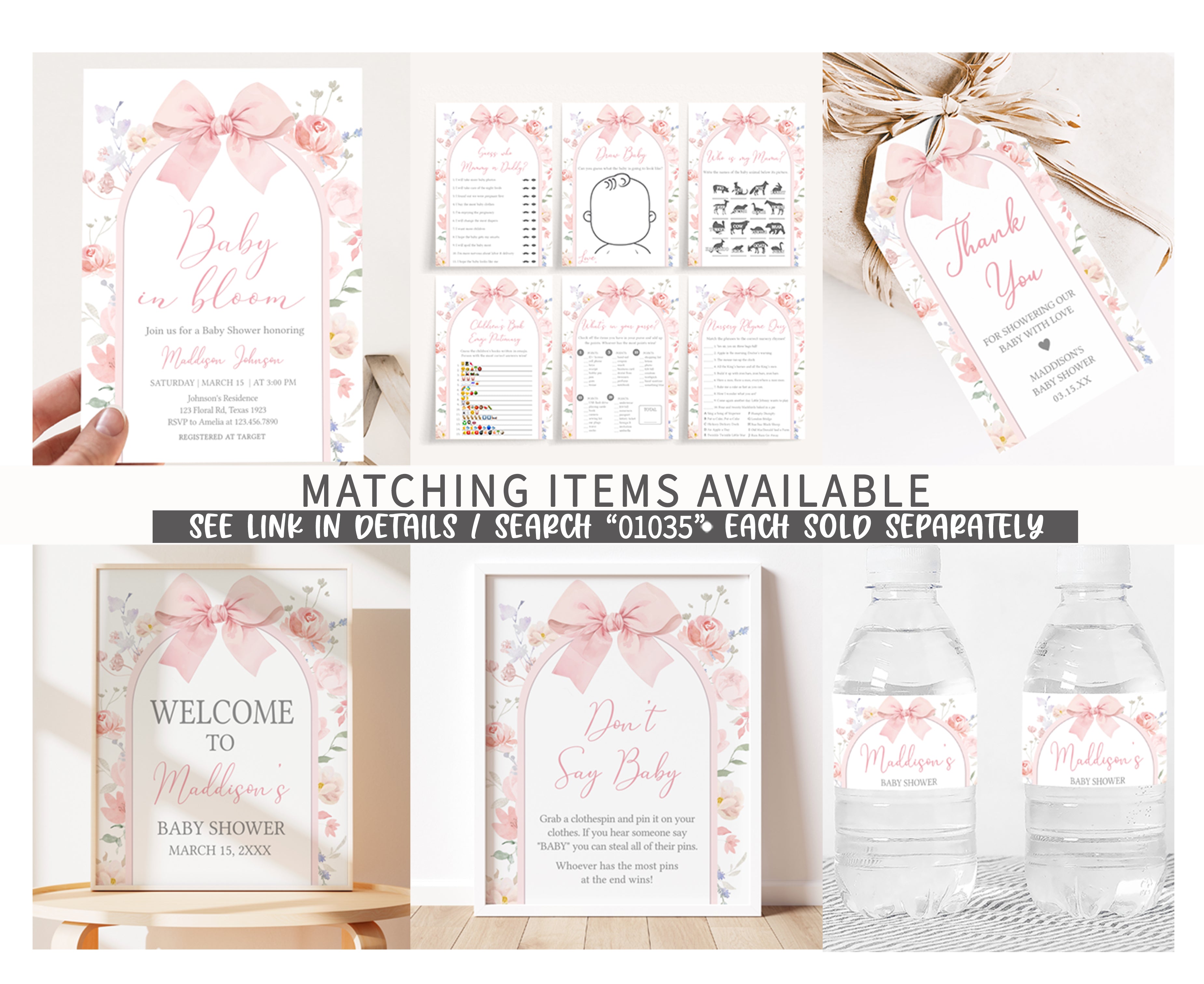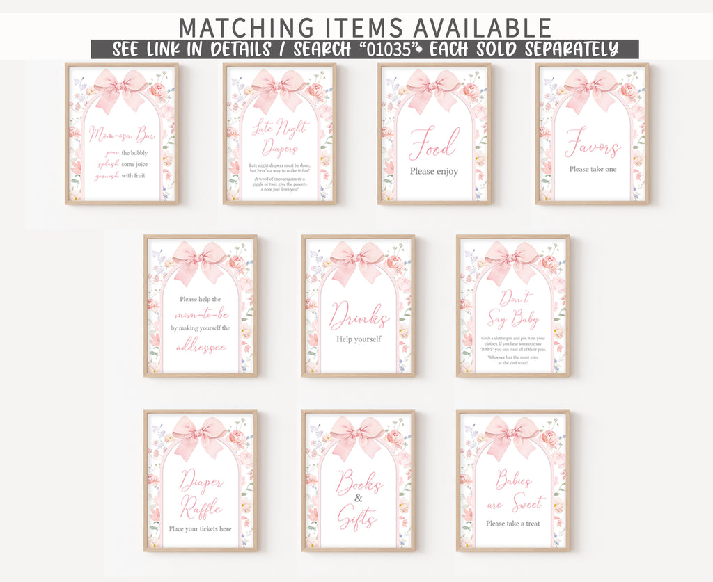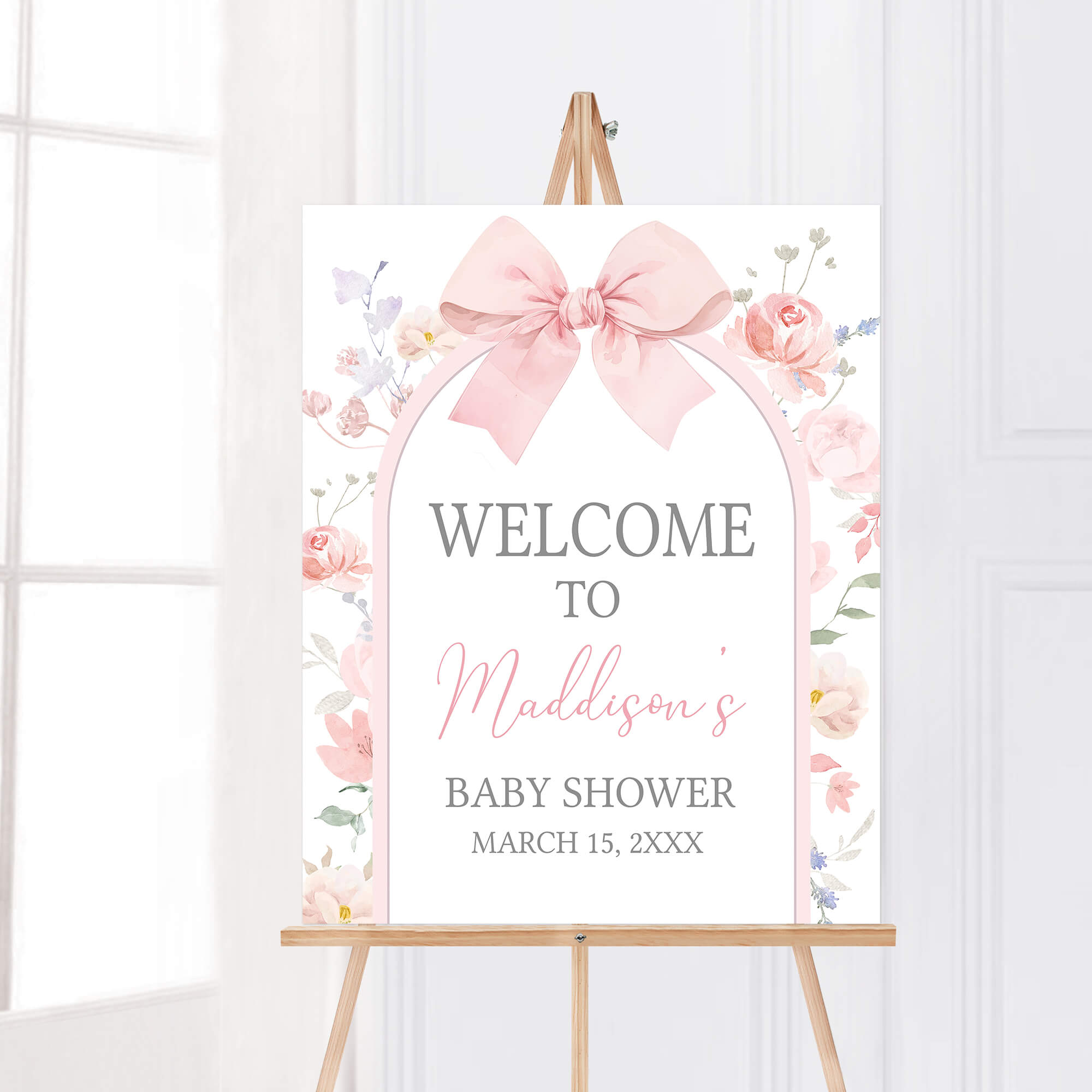 Elevate the charm of your Spring Bow Baby Shower Party with the Pastel Flower Arch Welcome Sign Printable. With its blooming design, it effortlessly captivates attention and enhances the overall ambiance, playfully guiding your guests to the heart of the Pink Floral Ribbon Baby Shower celebration.