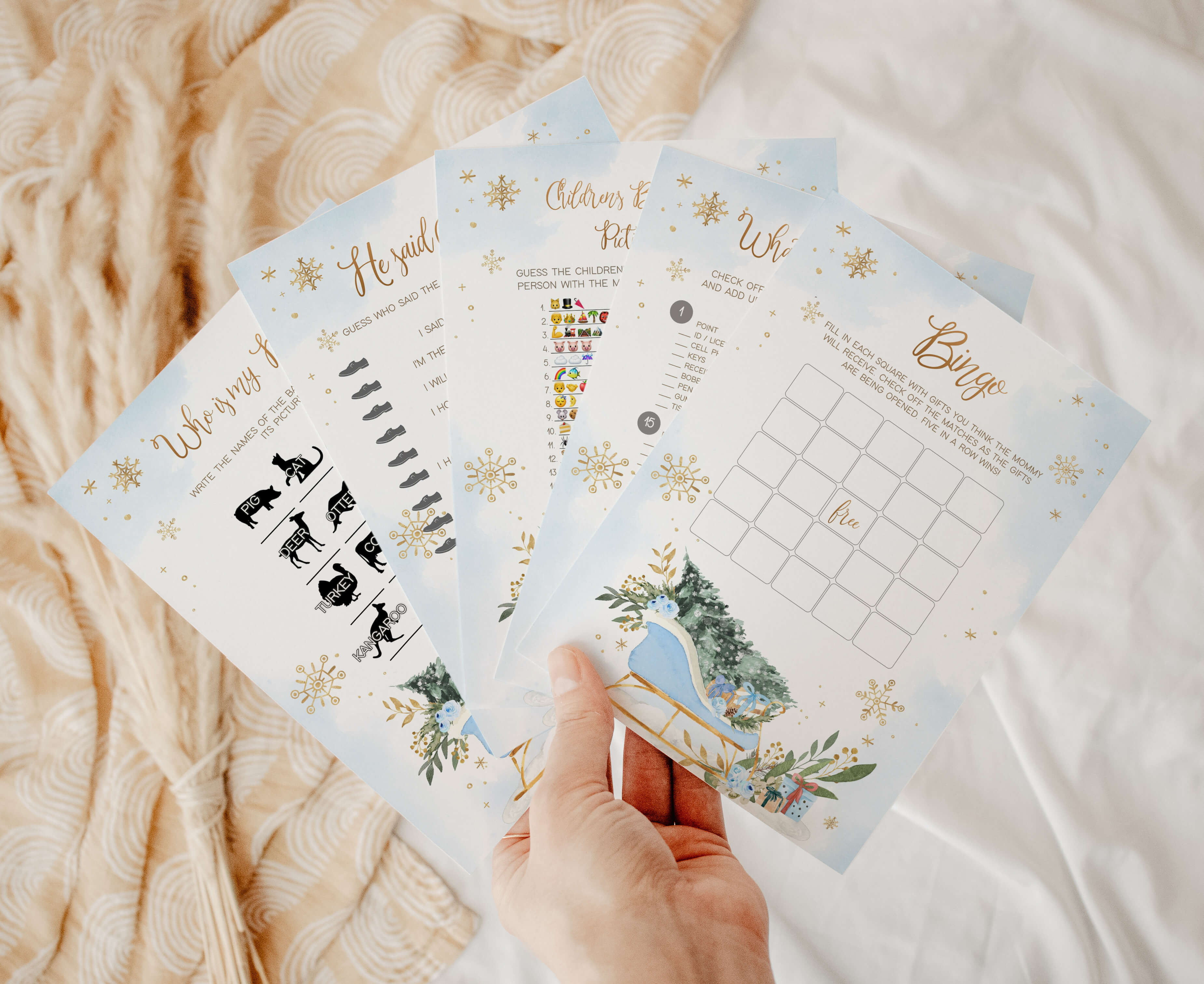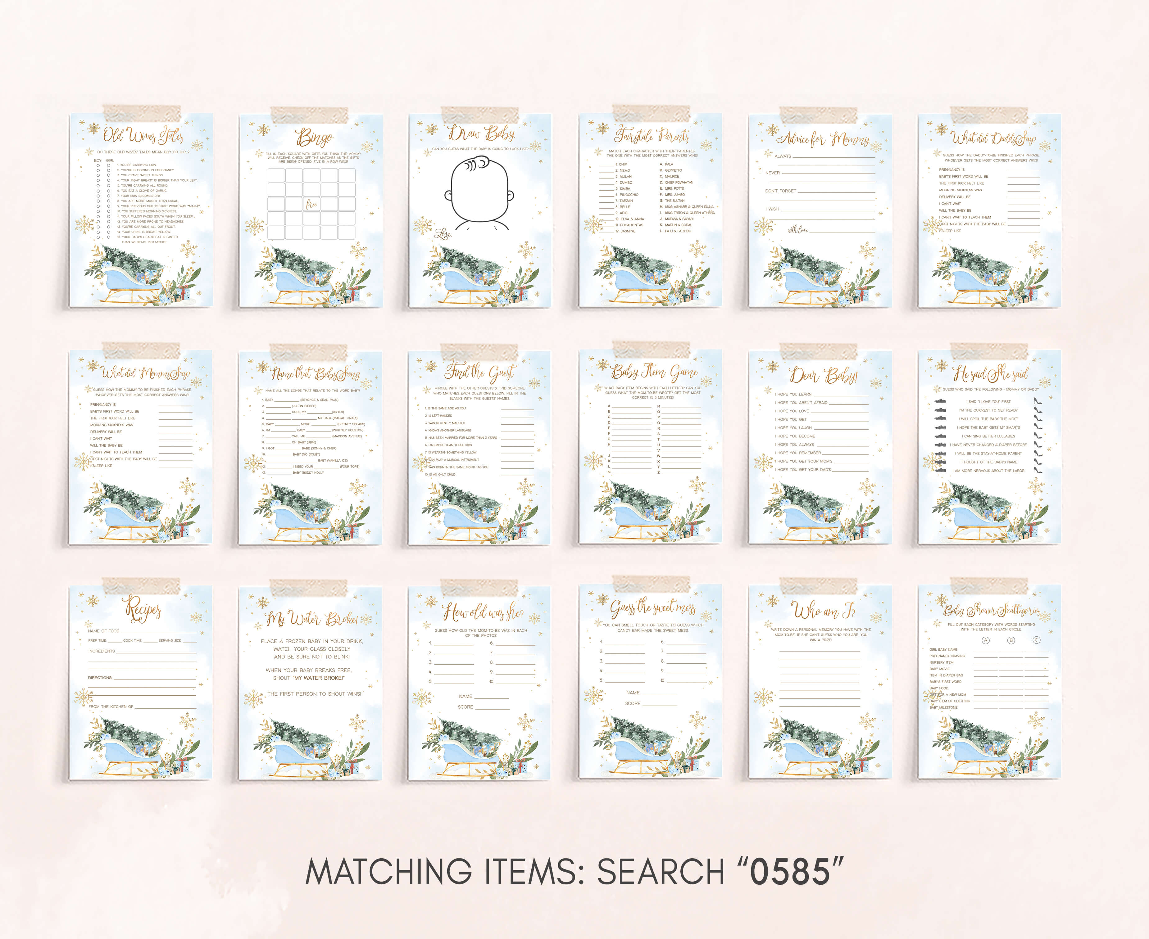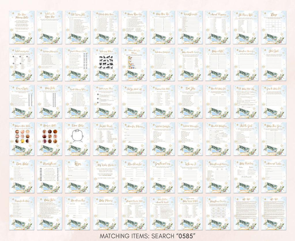 Make your Blue Winter Baby Shower Party a joyous and laughter-filled occasion with our charming Baby It’s Cold Outside Sleigh Games Set. Packed with heartwarming activities and entertaining challenges, these Blue Gold Snowflake Baby Shower Game Pack will infuse your celebration with unforgettable holiday moments, crafting cherished memories along the way.