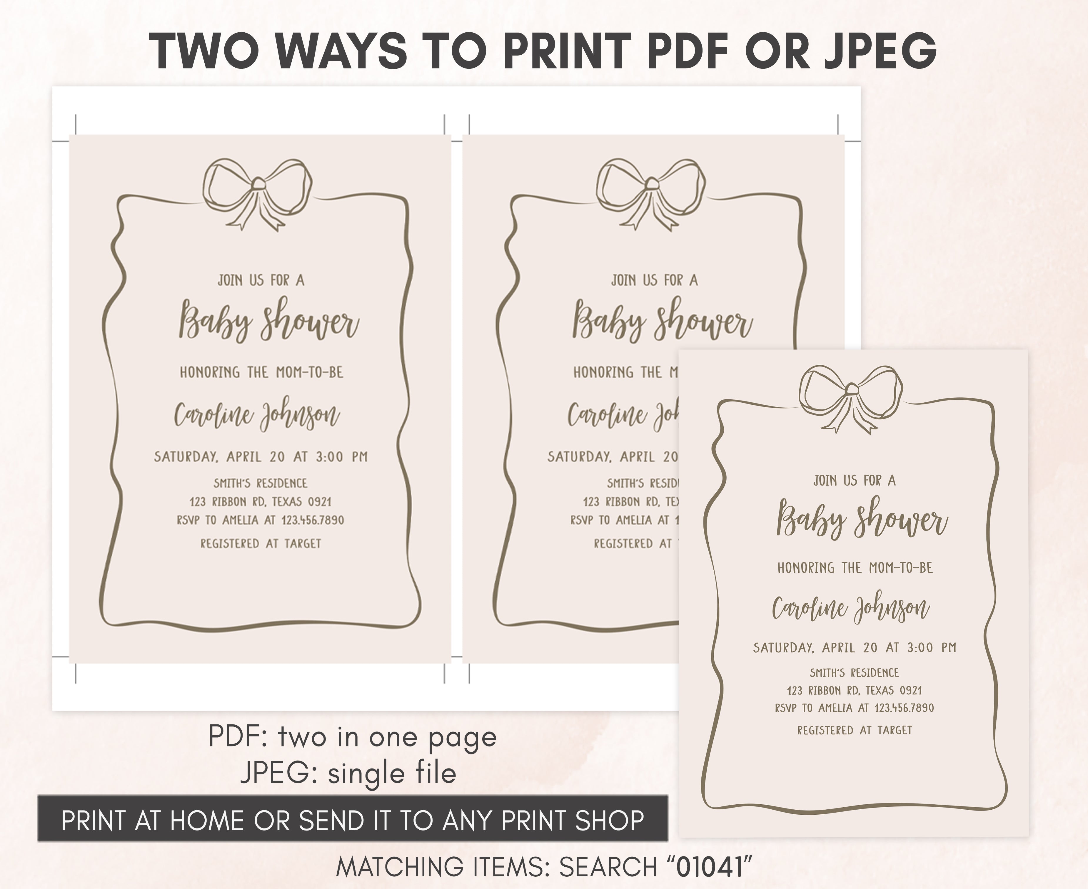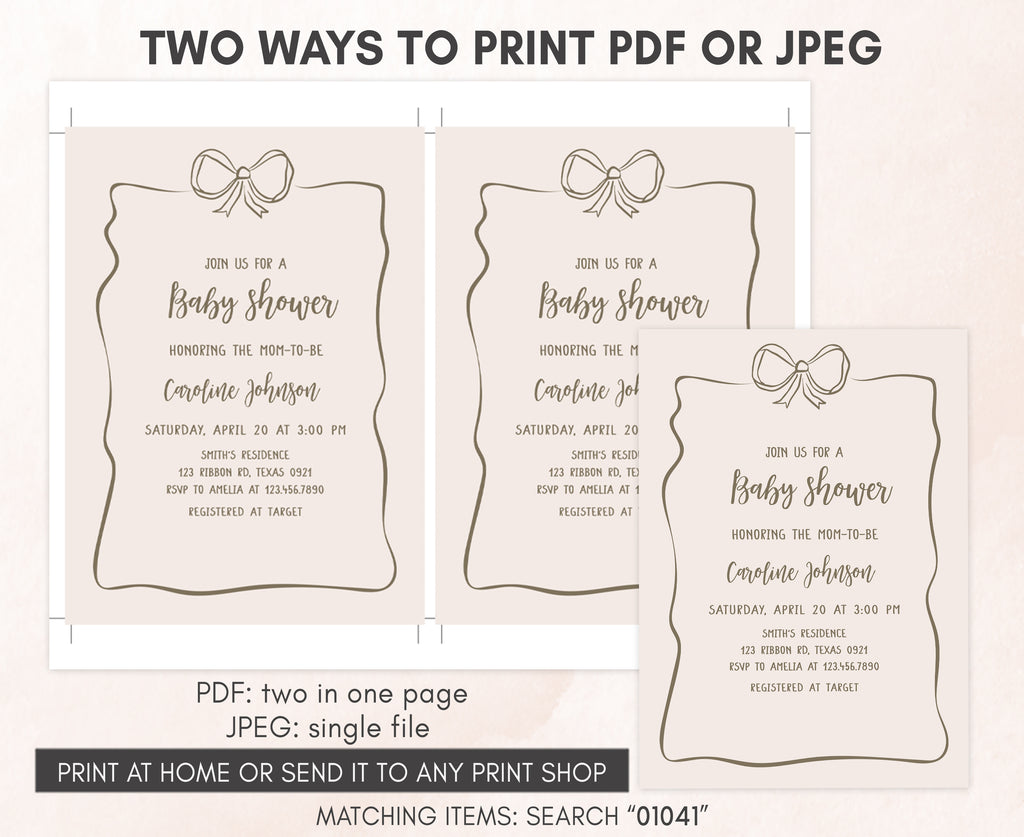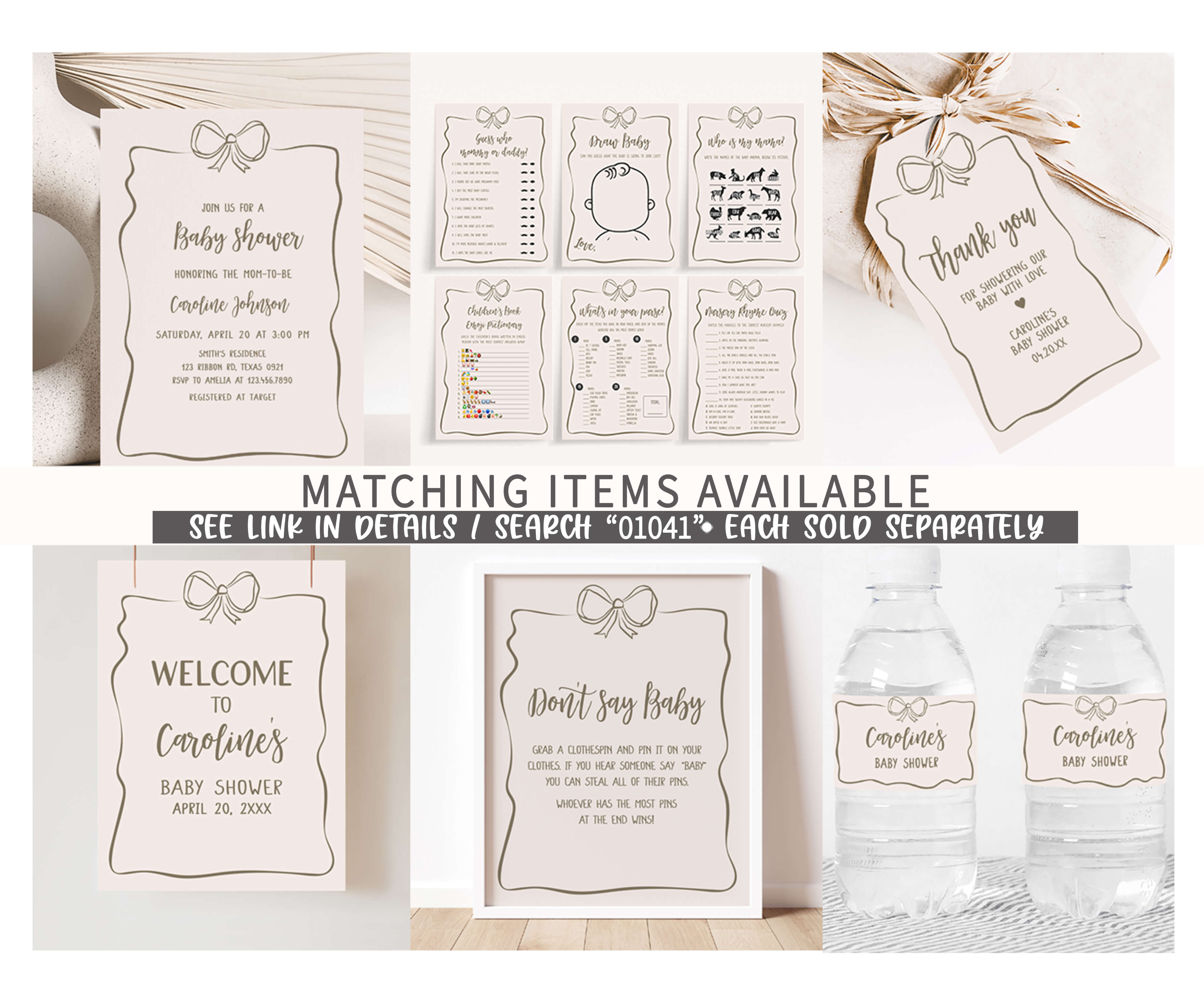 Celebrate with your guests at your Neutral Minimalist Baby Shower Party using our delightful Brown Coquette Ribbon Baby Shower Invitation Bundle. This Modern Bow Baby Shower Invite is the ideal choice to set the tone for a Minimalist-themed celebration.