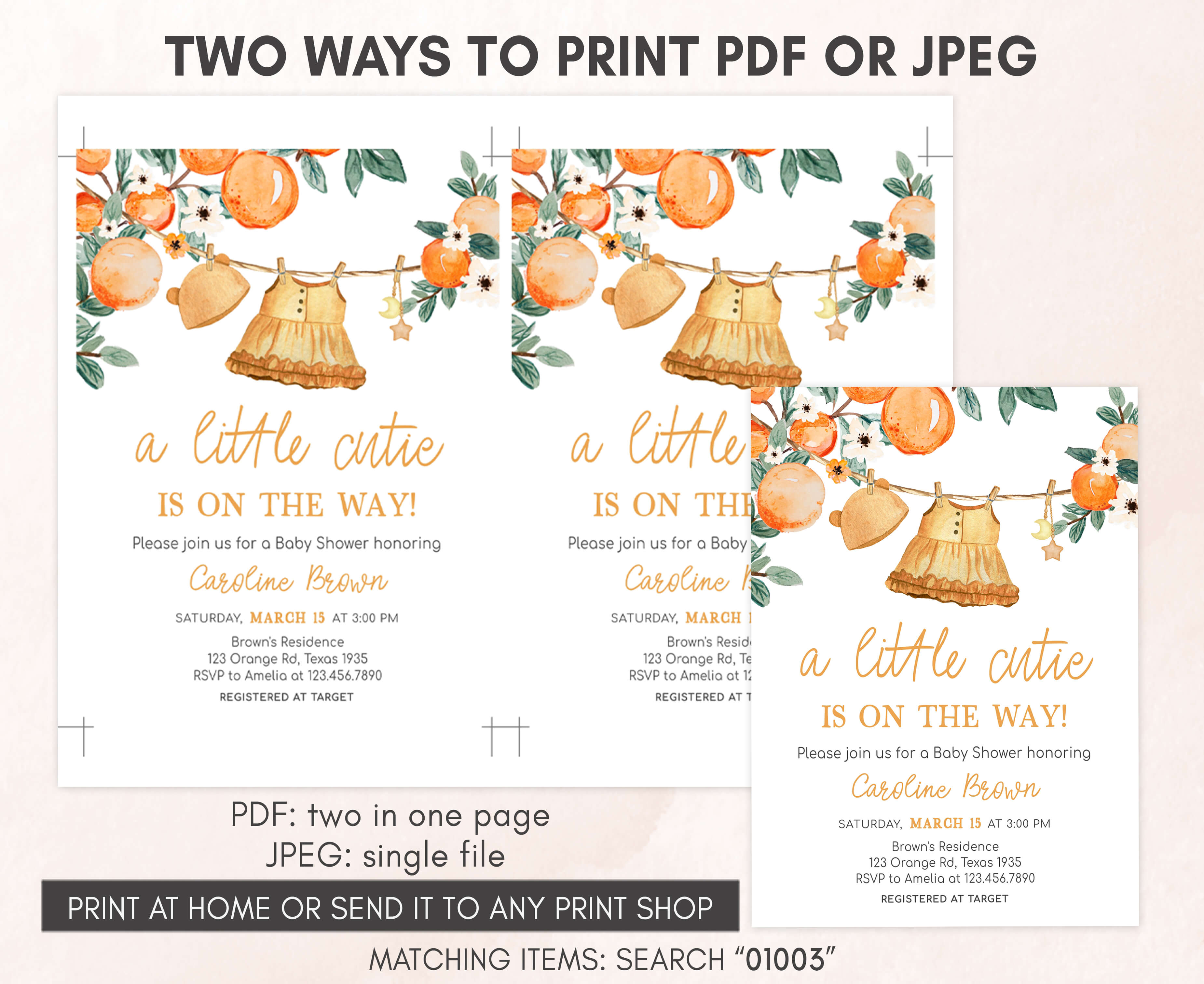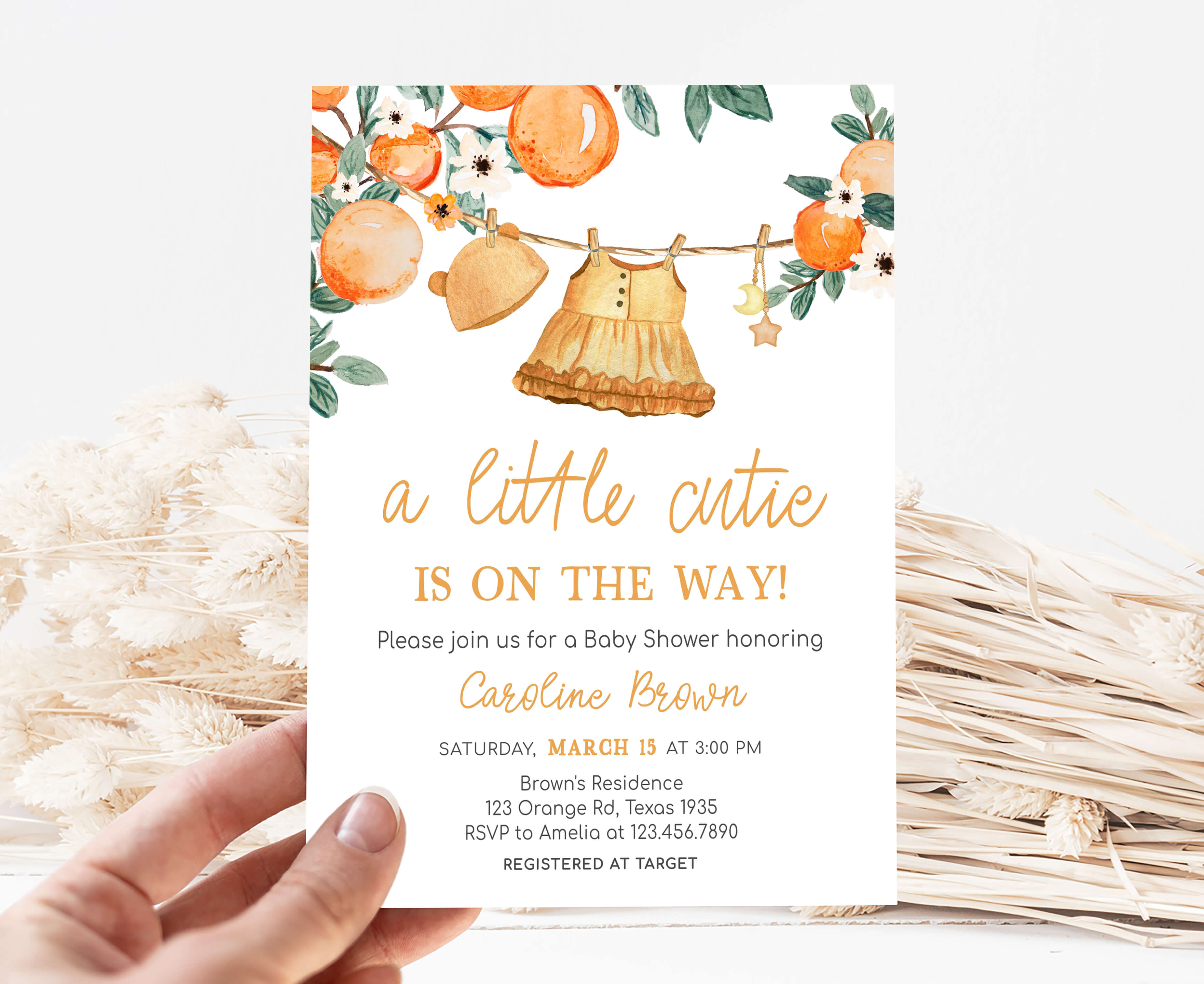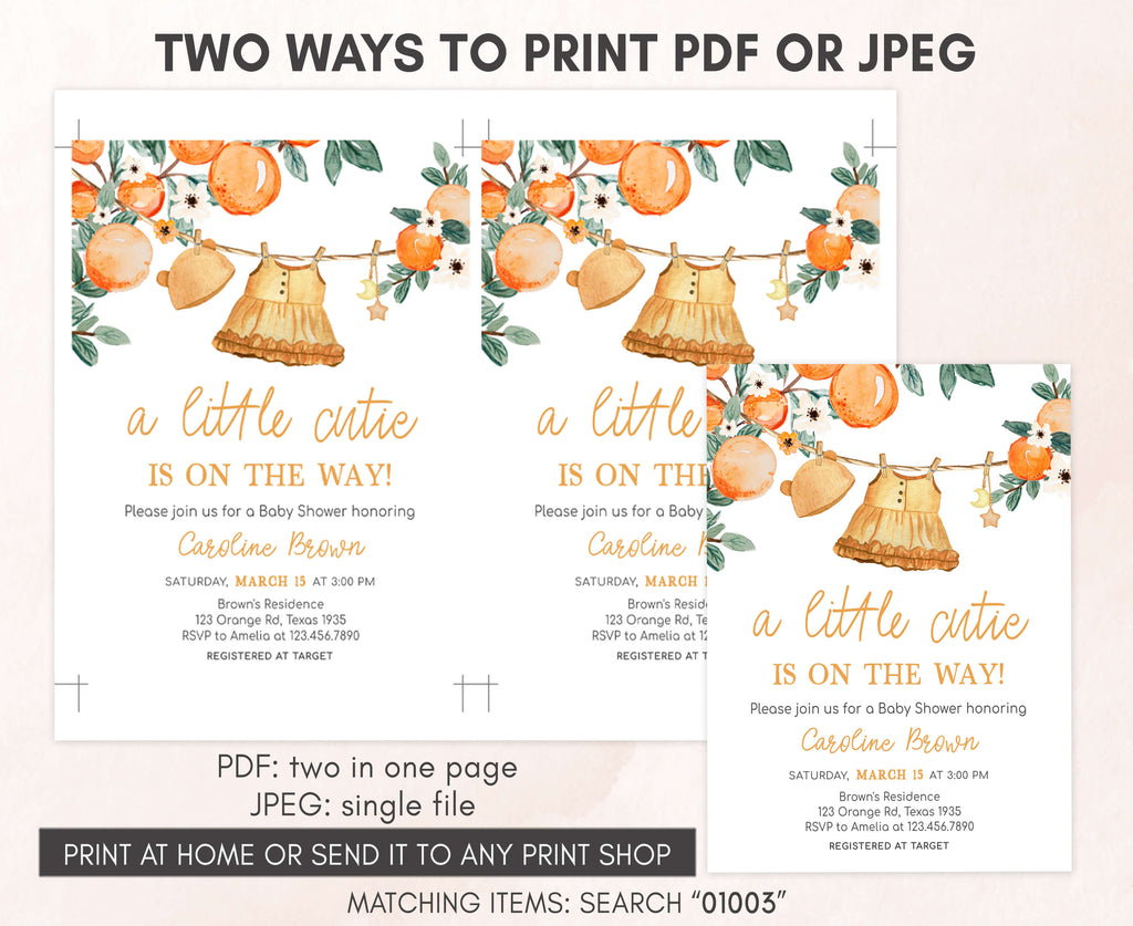 Celebrate with your guests at your Spring Summer Baby Shower Party using our delightful Orange Little Cutie Baby Shower Invitation. This Cute Baby Clothesline Baby Shower Invite is the ideal choice to tone for an Orange-themed celebration.