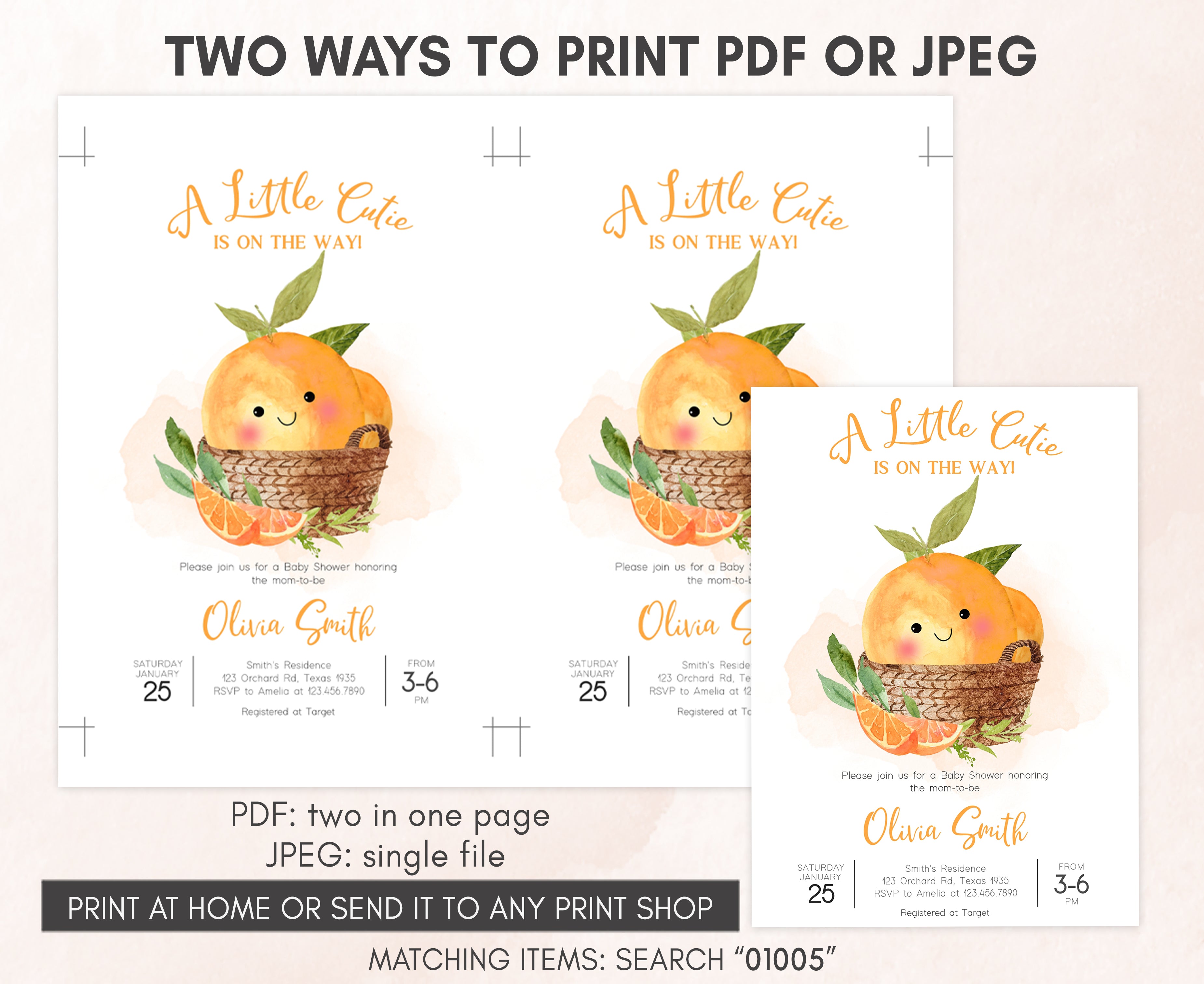 Celebrate with your guests at your Orange Basket Baby Shower Party using our delightful A Little Cutie is on the Way Baby Shower Invitation. This Gender Neutral Orange Baby Shower Invite is the ideal choice to tone for a Citrus-themed celebration.
