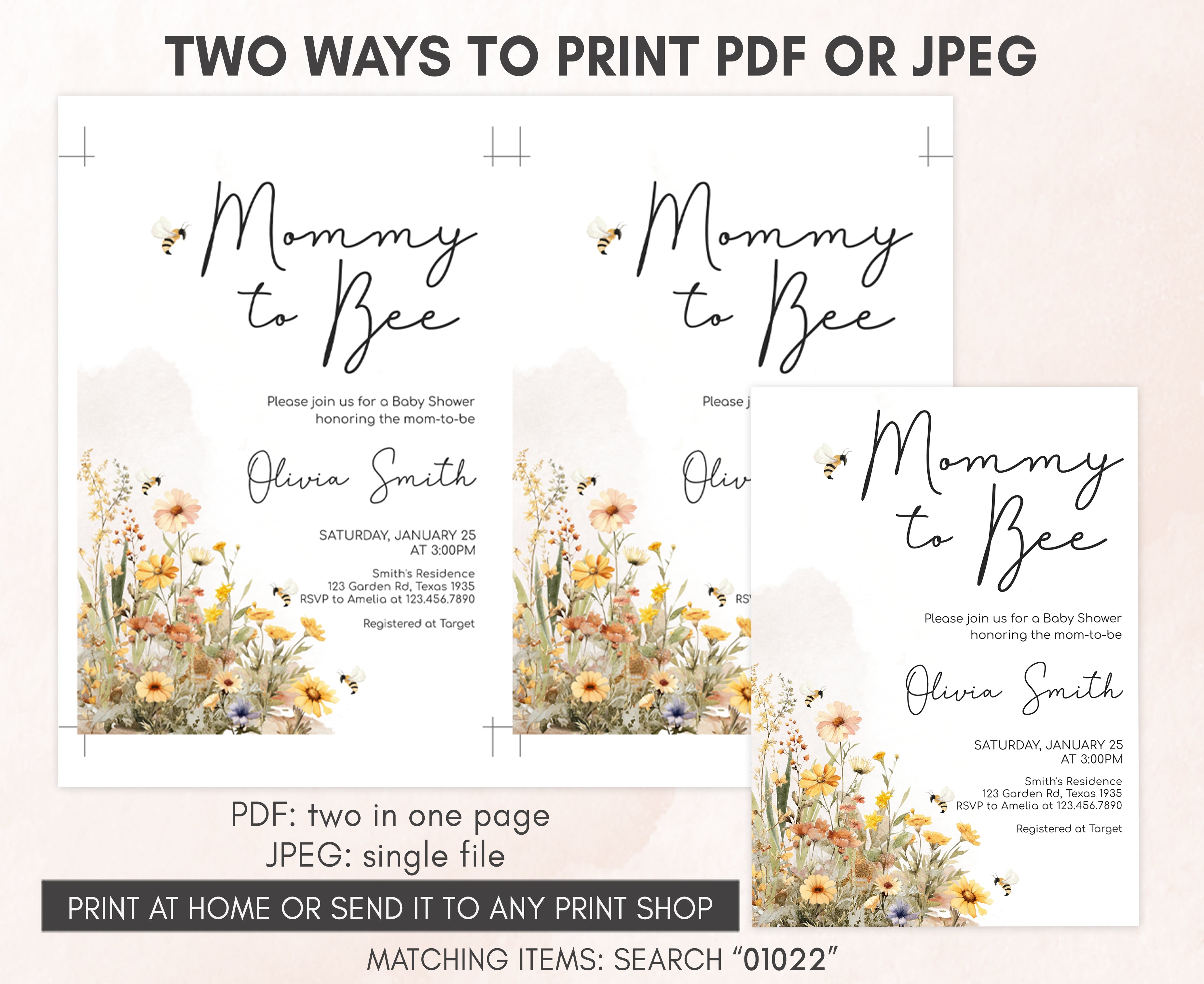 Celebrate with your guests at your Floral Bee Baby Shower Party using our delightful Mommy to Bee Baby Shower Invitation. This Honey Bee Flowers Baby Shower Invite is the ideal choice to tone for a Spring-themed celebration.