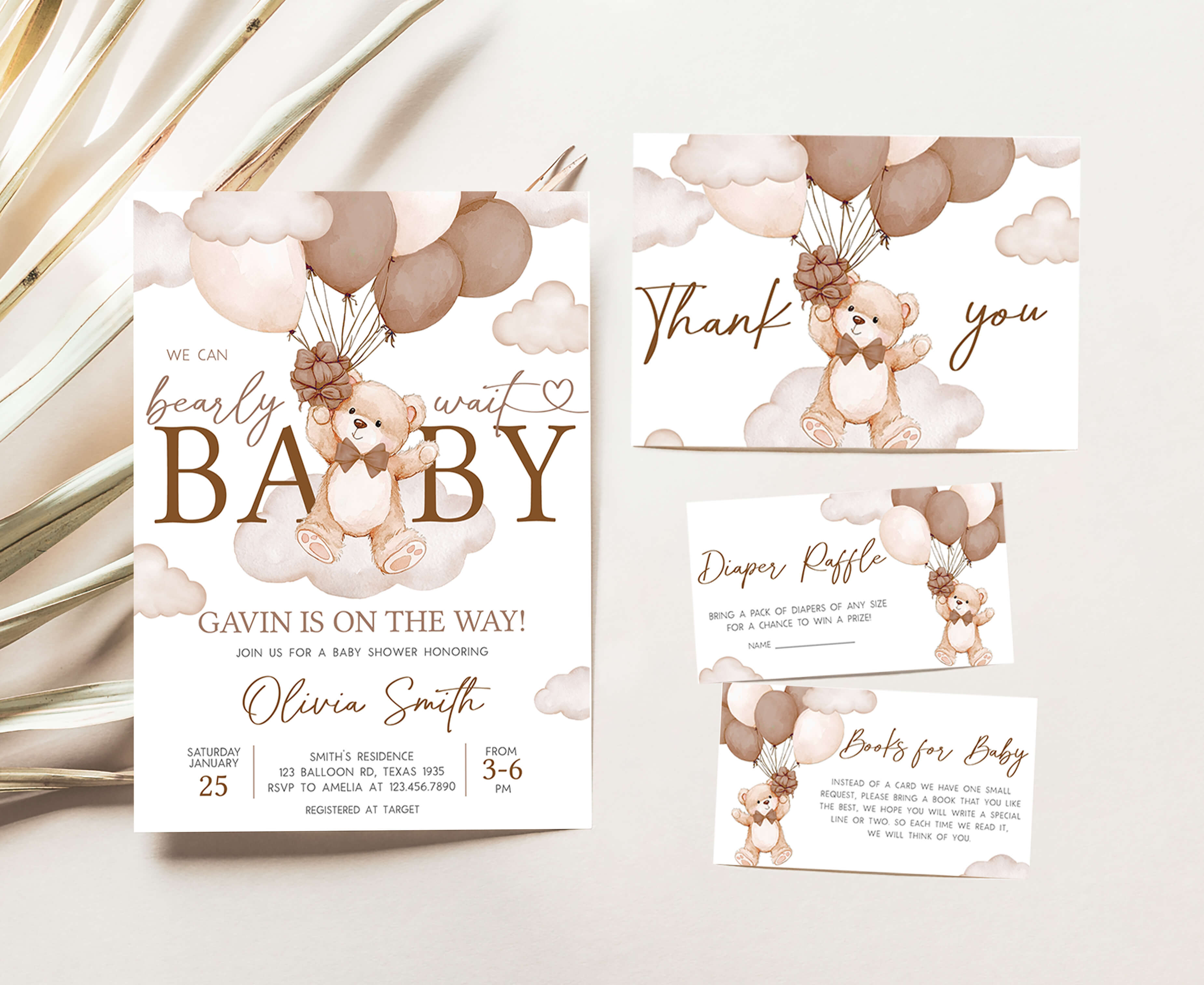 Celebrate with your guests at your Bear Cloud Baby Shower Party using our delightful We Can Bearly Wait Baby Shower Invitation Bundle. This Brown Balloon Bear Baby Shower Invite is the ideal choice to set the tone for a Bear-themed celebration.