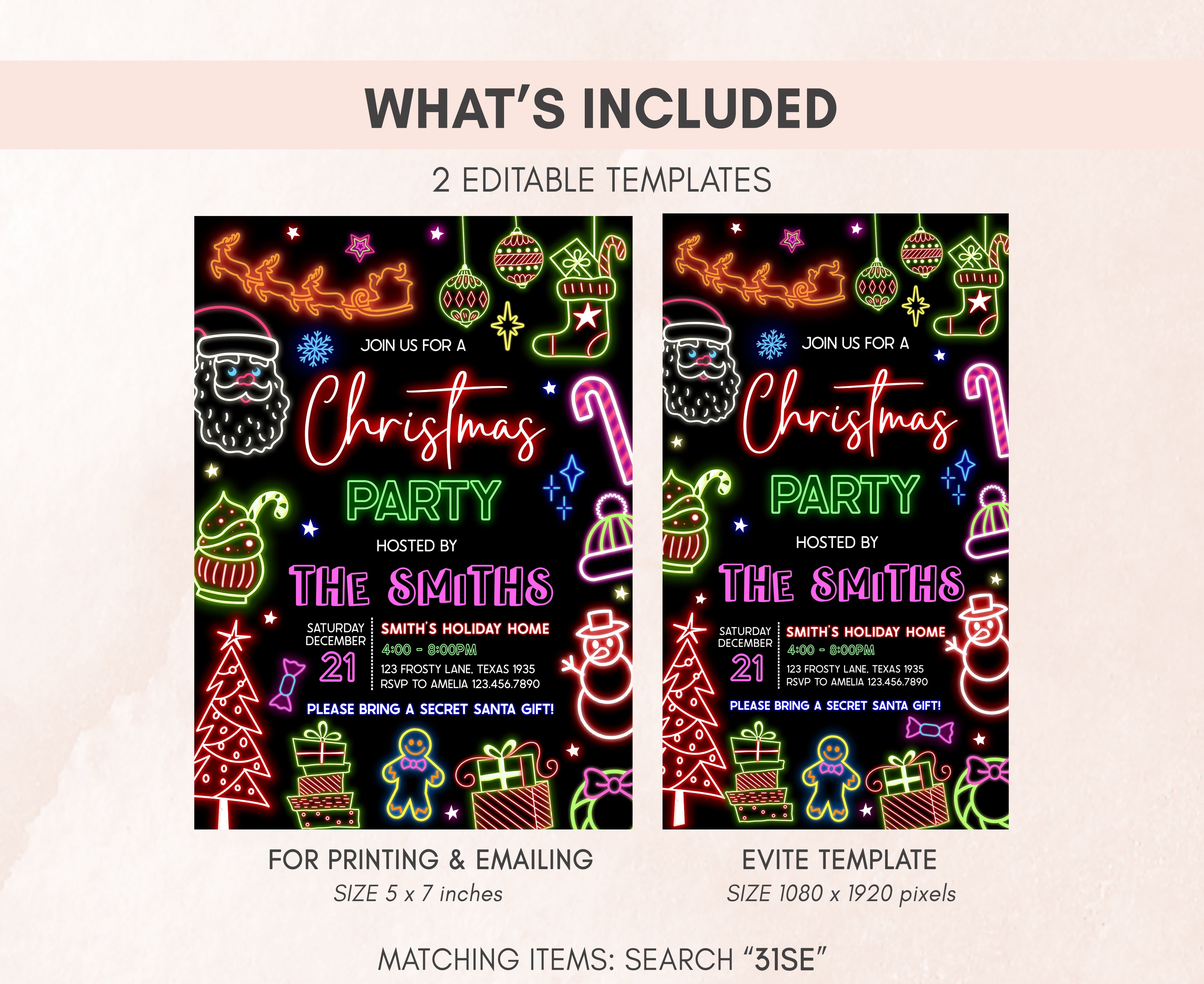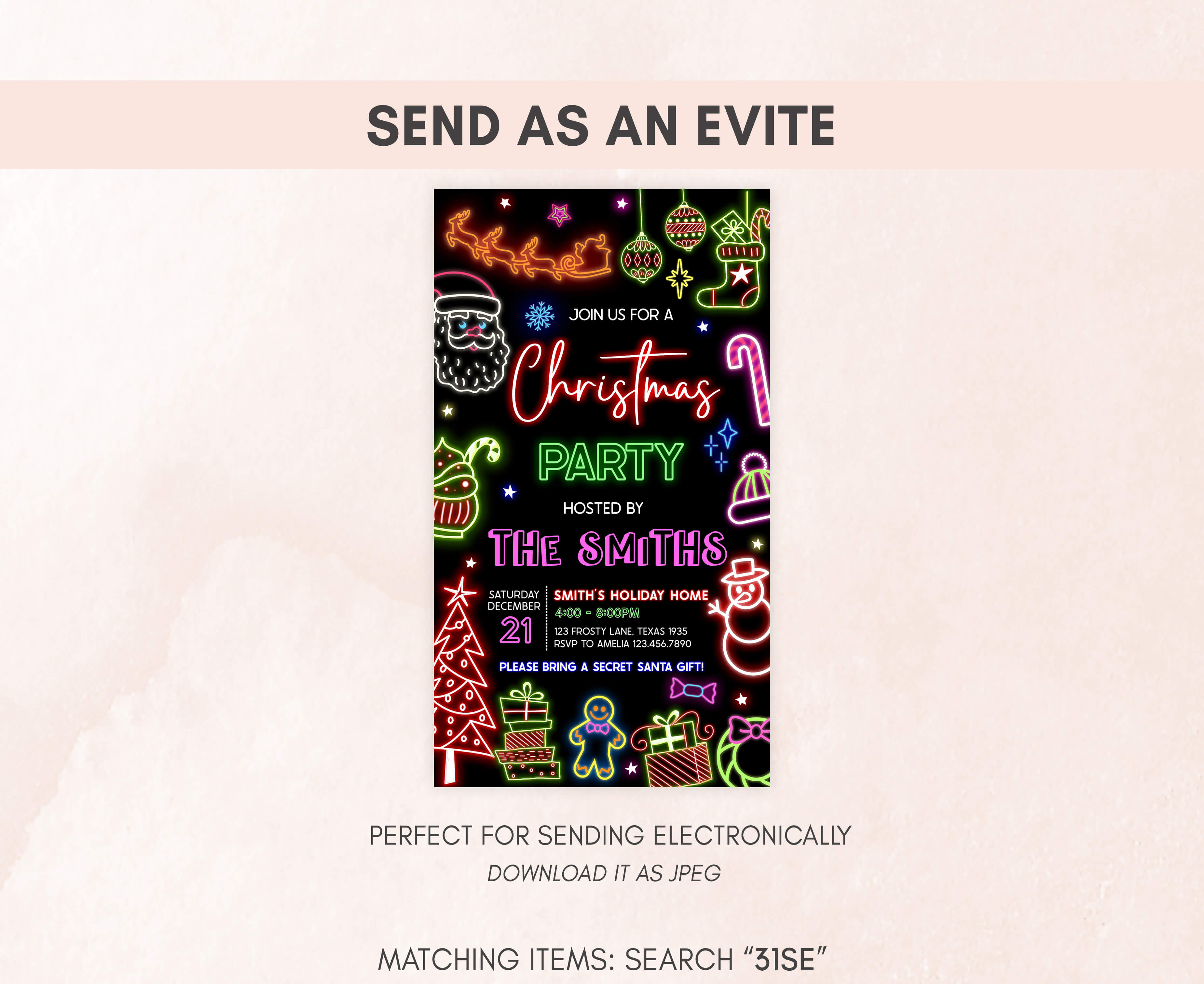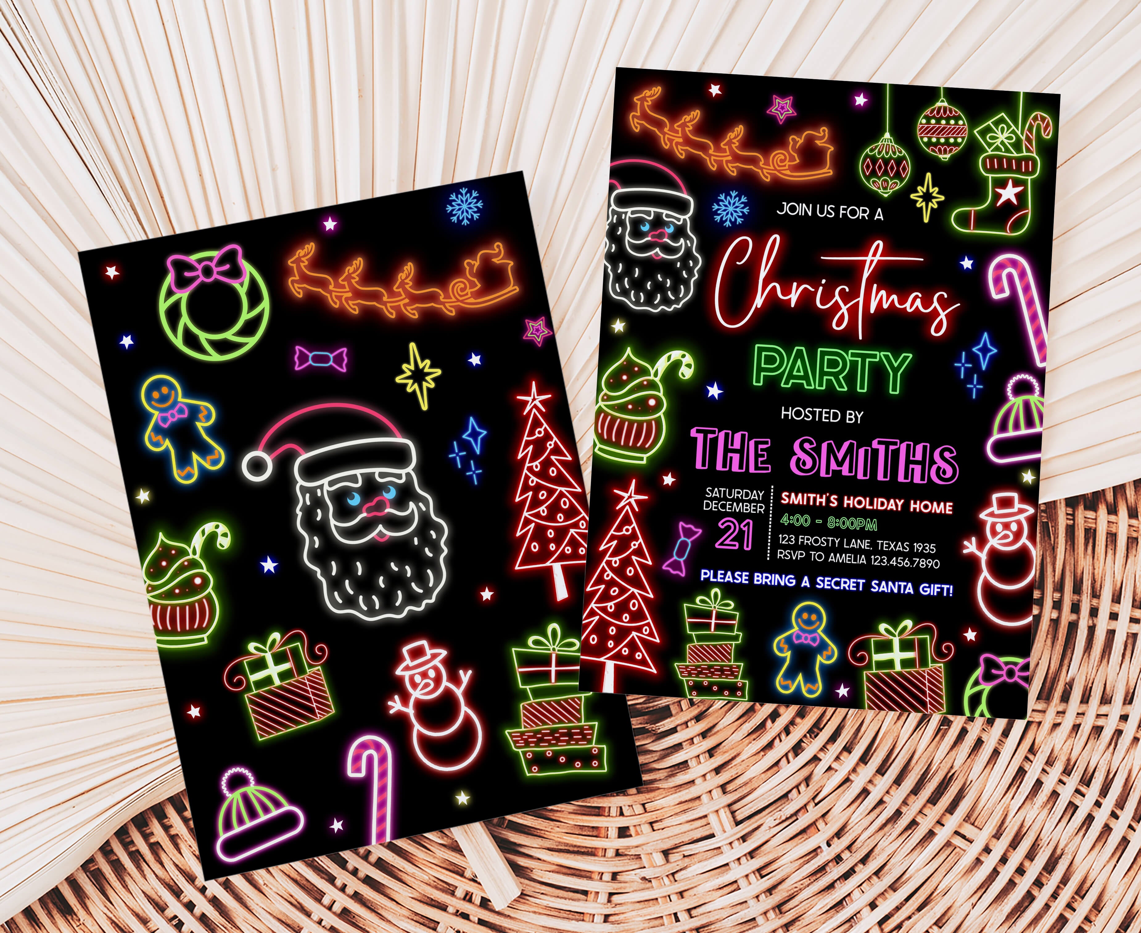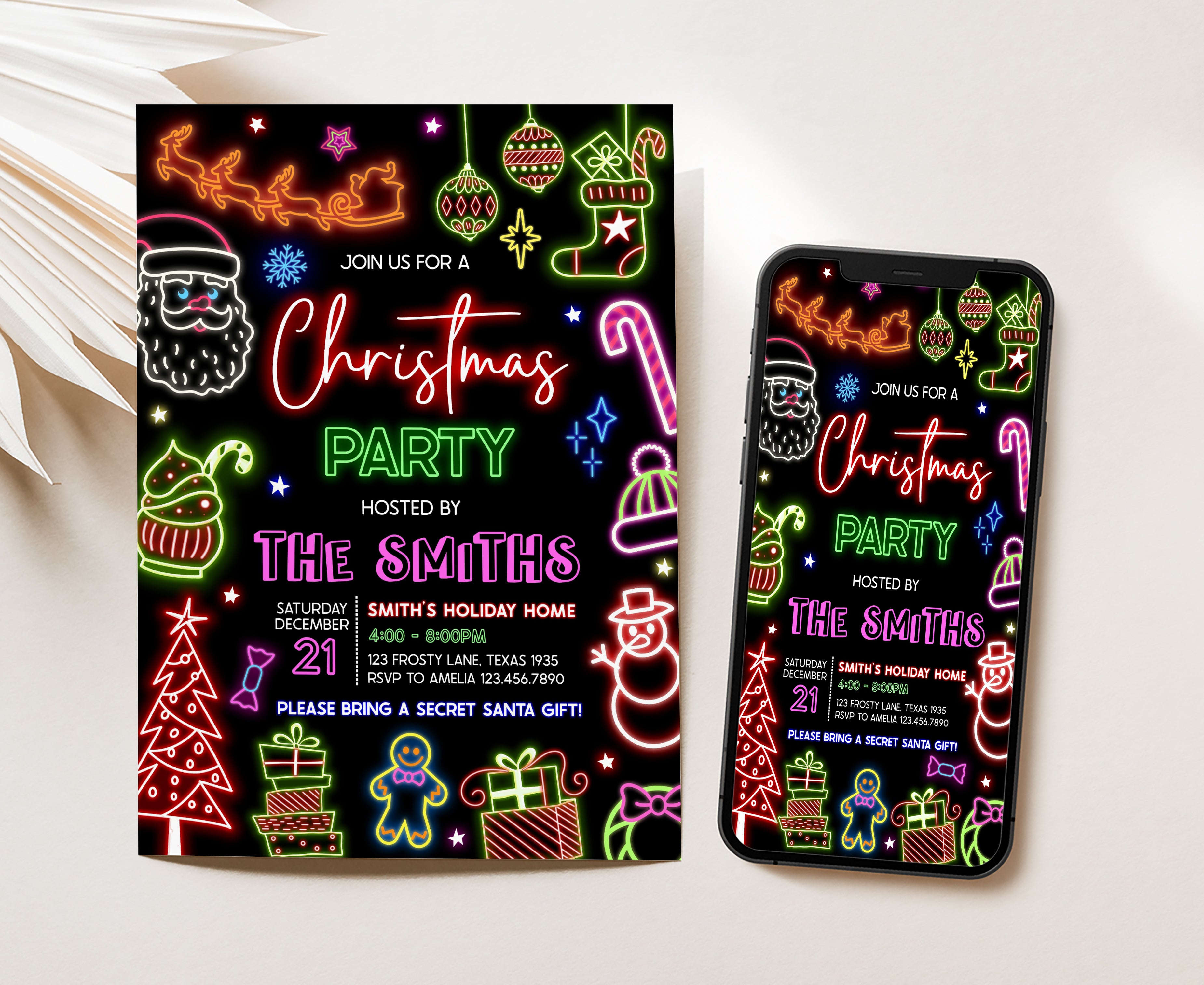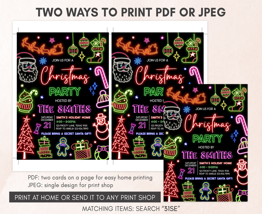 Celebrate with your guests at your Modern Christmas Party using our delightful Festive Neon Lights Invitation. This Bright Christmas Neon Invite is the ideal choice to tone for a Holiday-themed celebration.