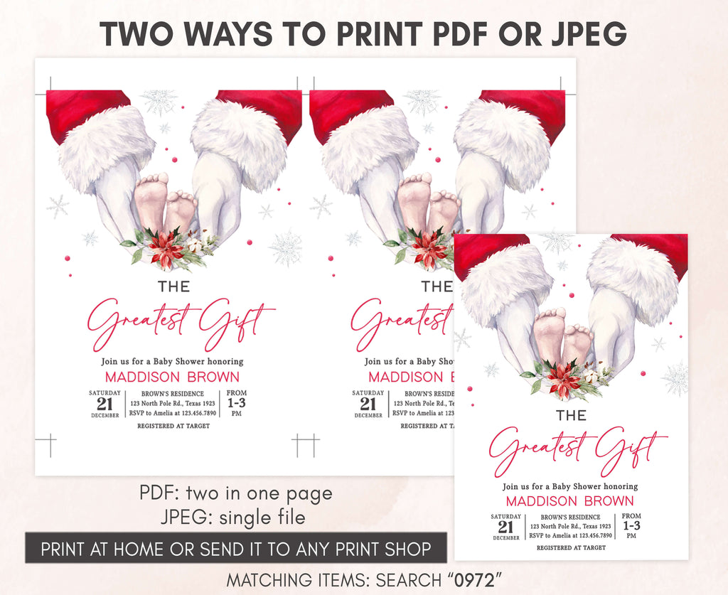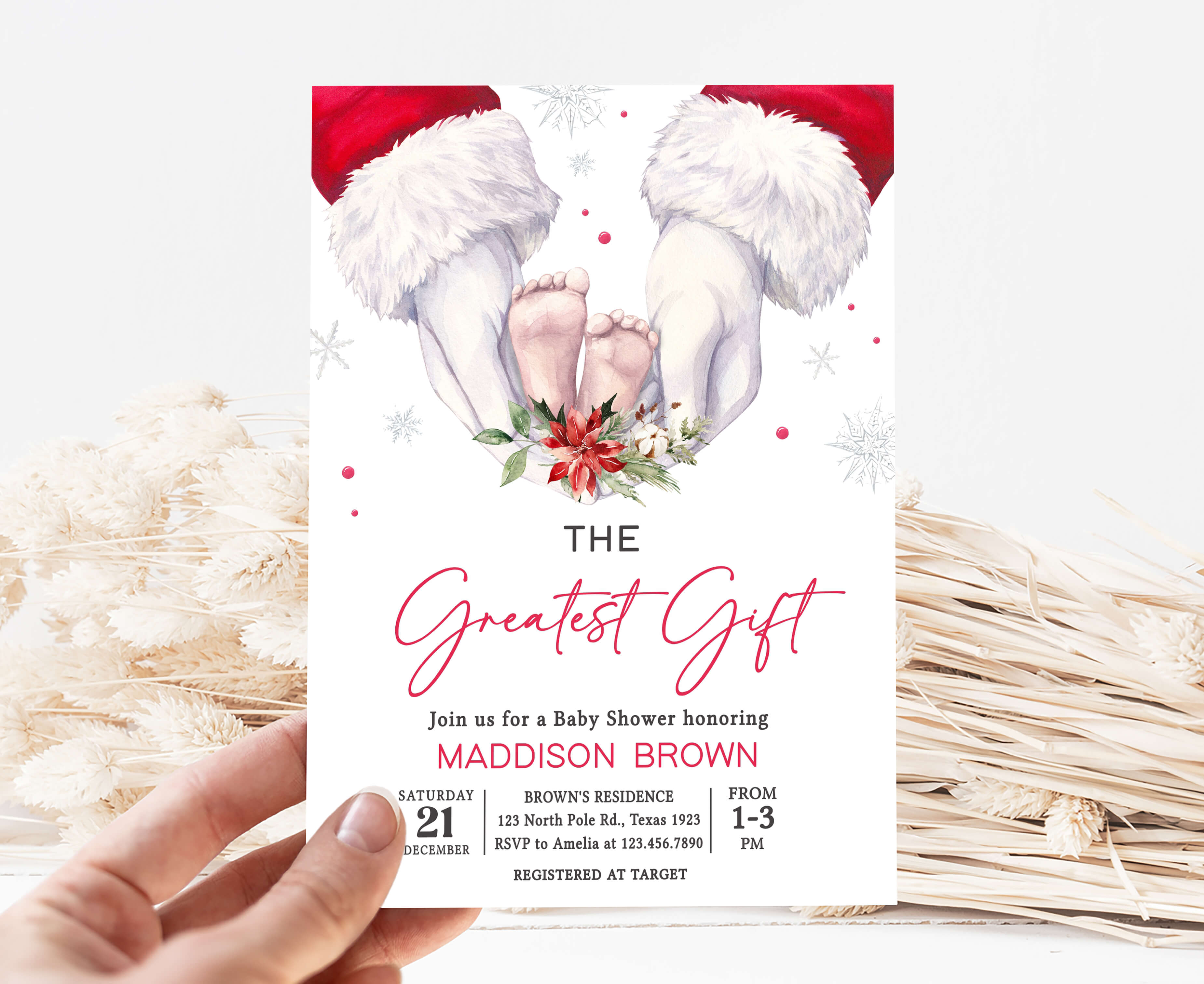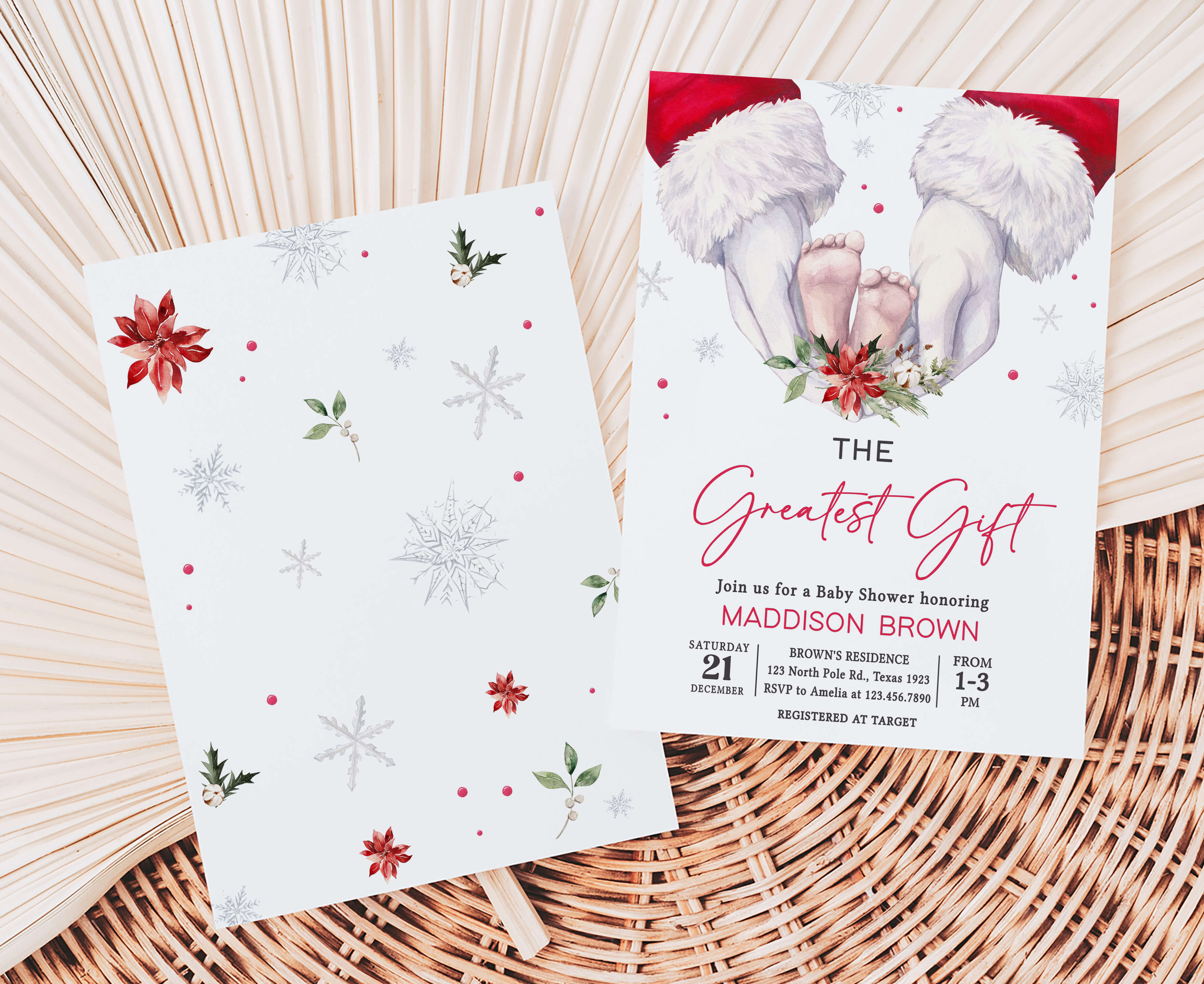 Celebrate with your guests at your Minimalist Christmas Baby Shower Party using our delightful Baby Santa Claus Invitation. This Festive Holiday Baby Shower Invite is the ideal choice to tone for a Christmas-themed celebration.