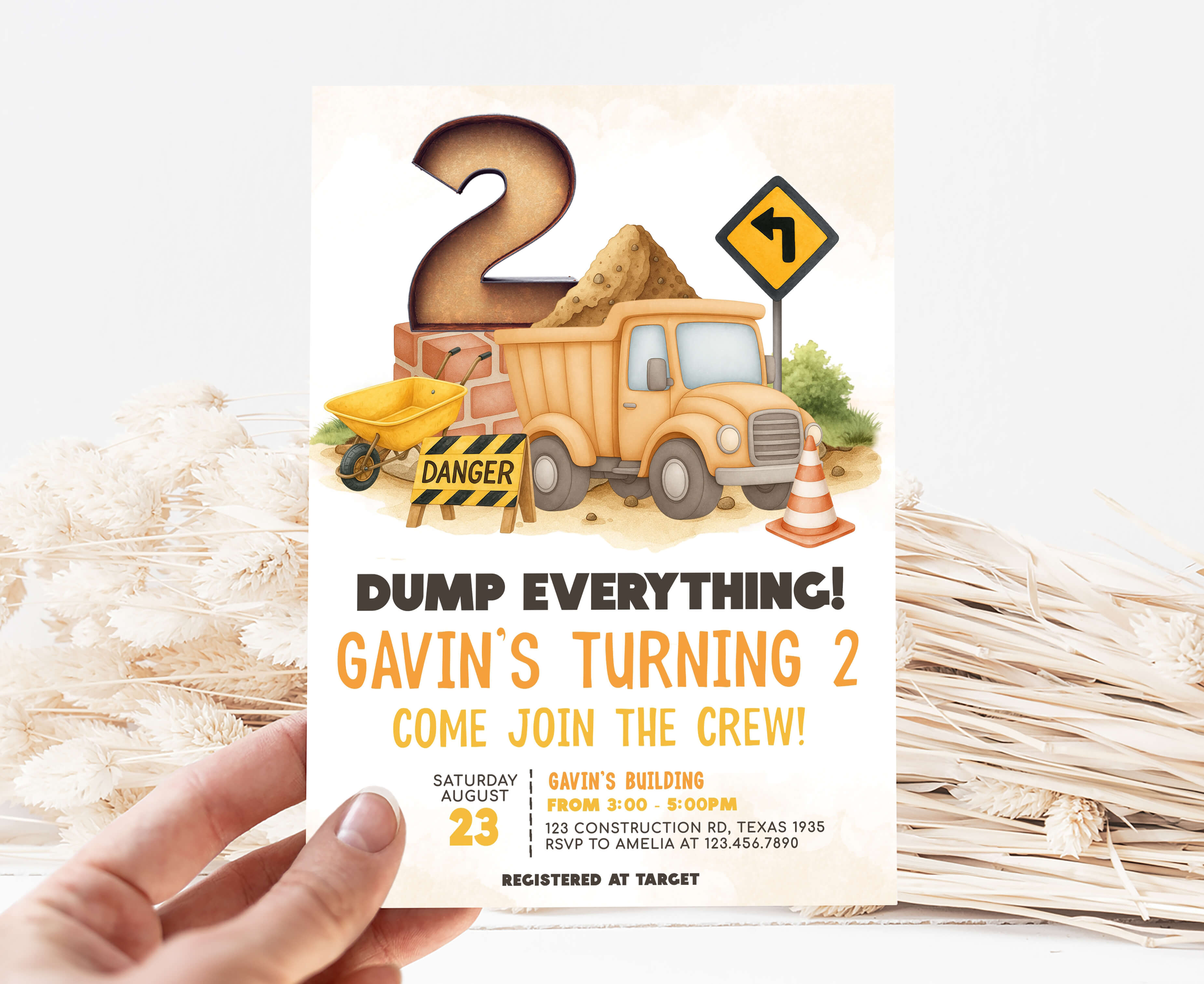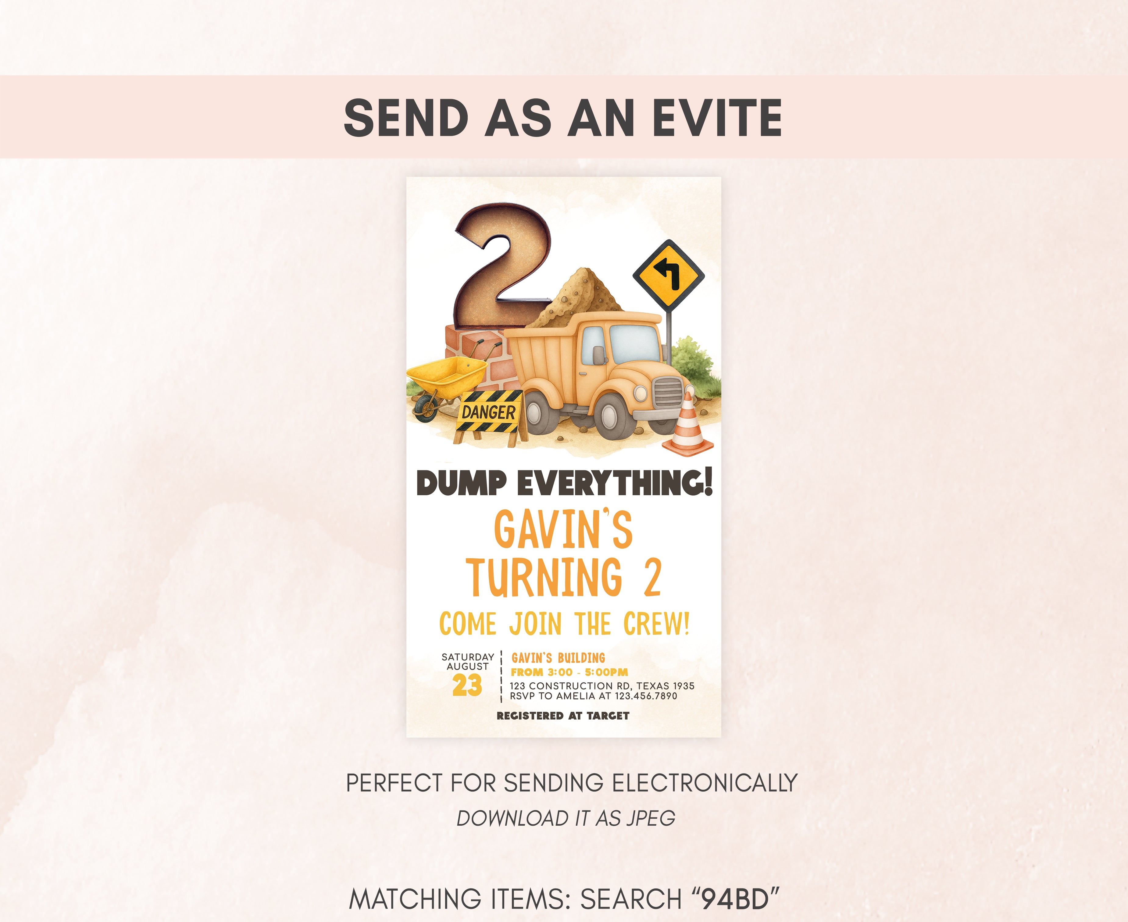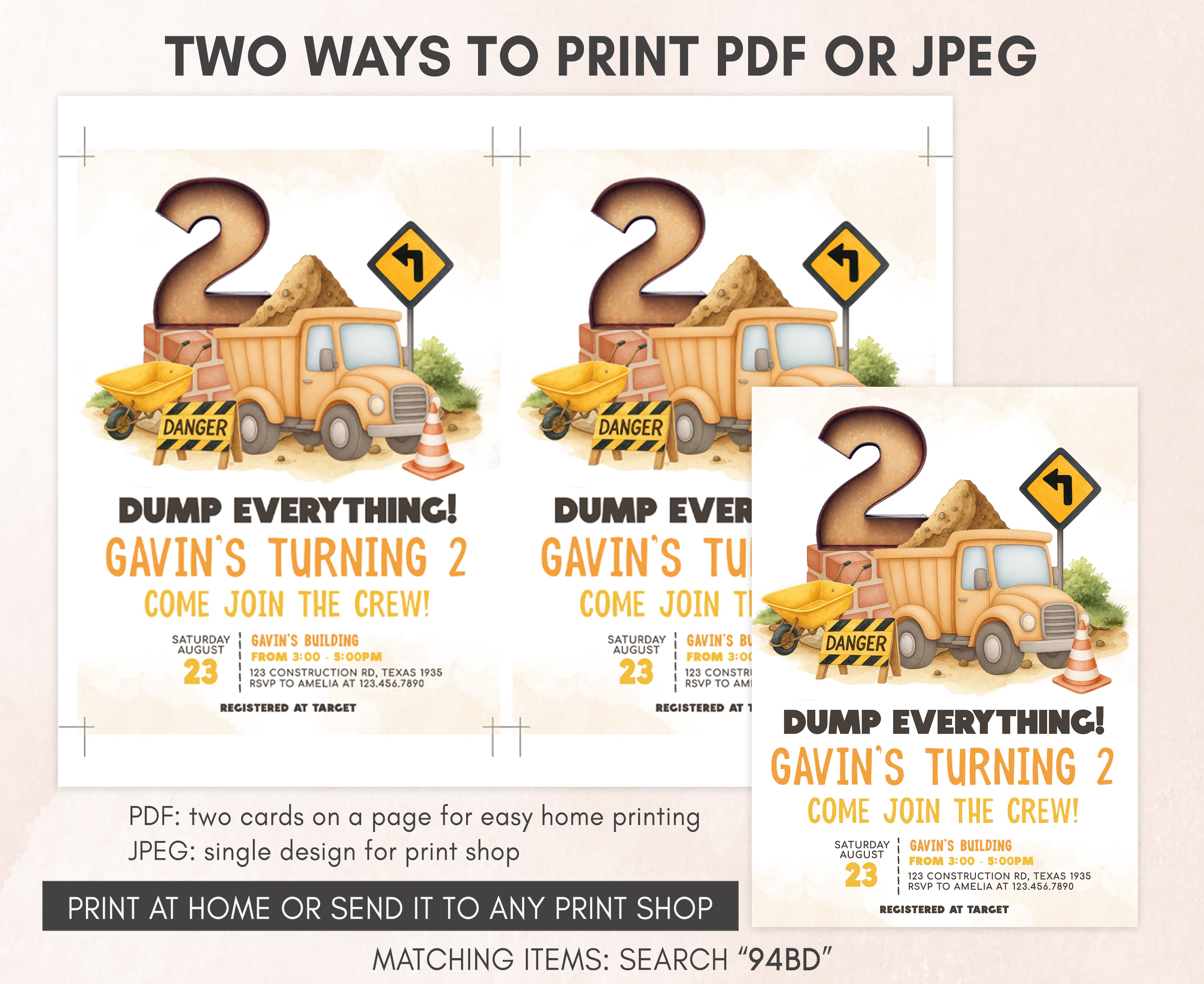 Celebrate with your guests at your Construction Site Birthday Party using our delightful Dump Everything Birthday Invitation. This Road Work Truck Birthday Invite is the ideal choice to tone for a Construction-themed celebration.