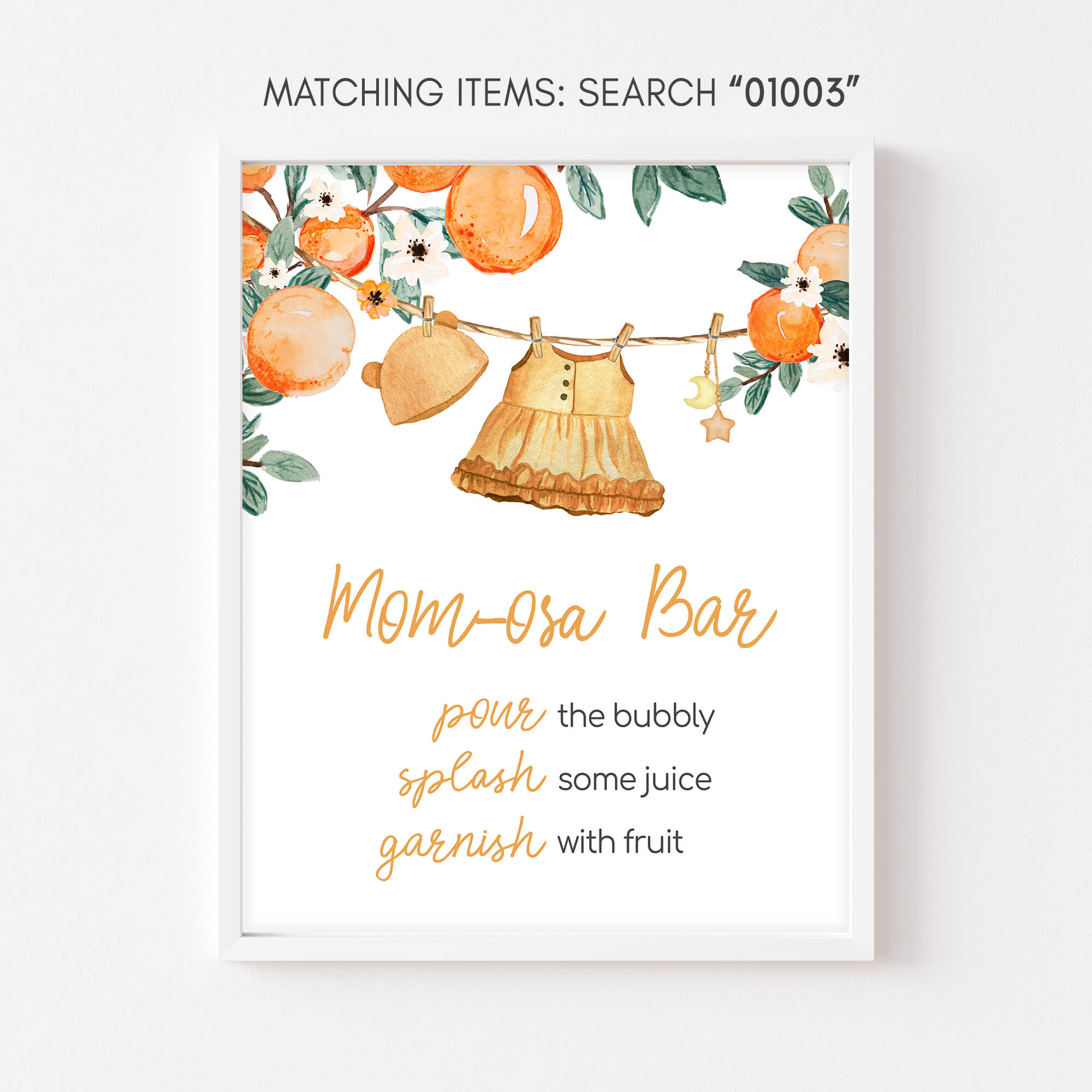 Craft an ideal atmosphere for your Spring Summer Baby Shower Party using our enchanting Orange Little Cutie Baby Shower Mimosa Sign Printable. These prints not only add a touch of charm but also serve as helpful guides, directing guests to various Cute Baby Clothesline party sections with their delightful designs.