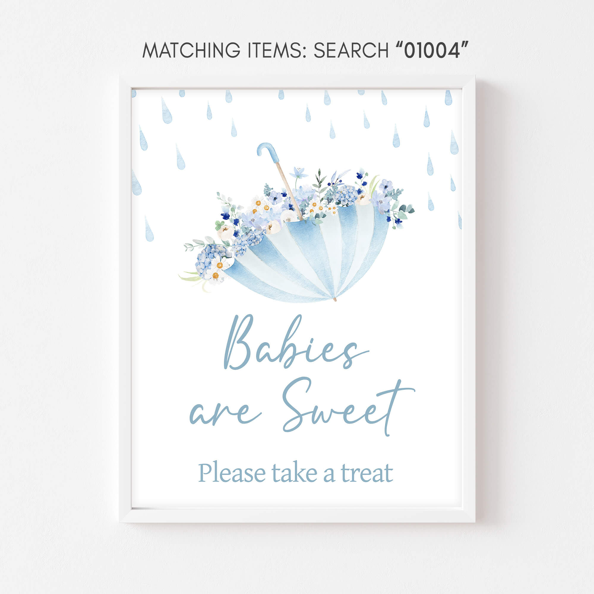 Craft an ideal atmosphere for your Blue Spring Baby Shower Party using our enchanting Rain Showers Baby Shower Dessert Sign Printable. These prints not only add a touch of charm but also serve as helpful guides, directing guests to various Floral Umbrella party sections with their delightful designs.