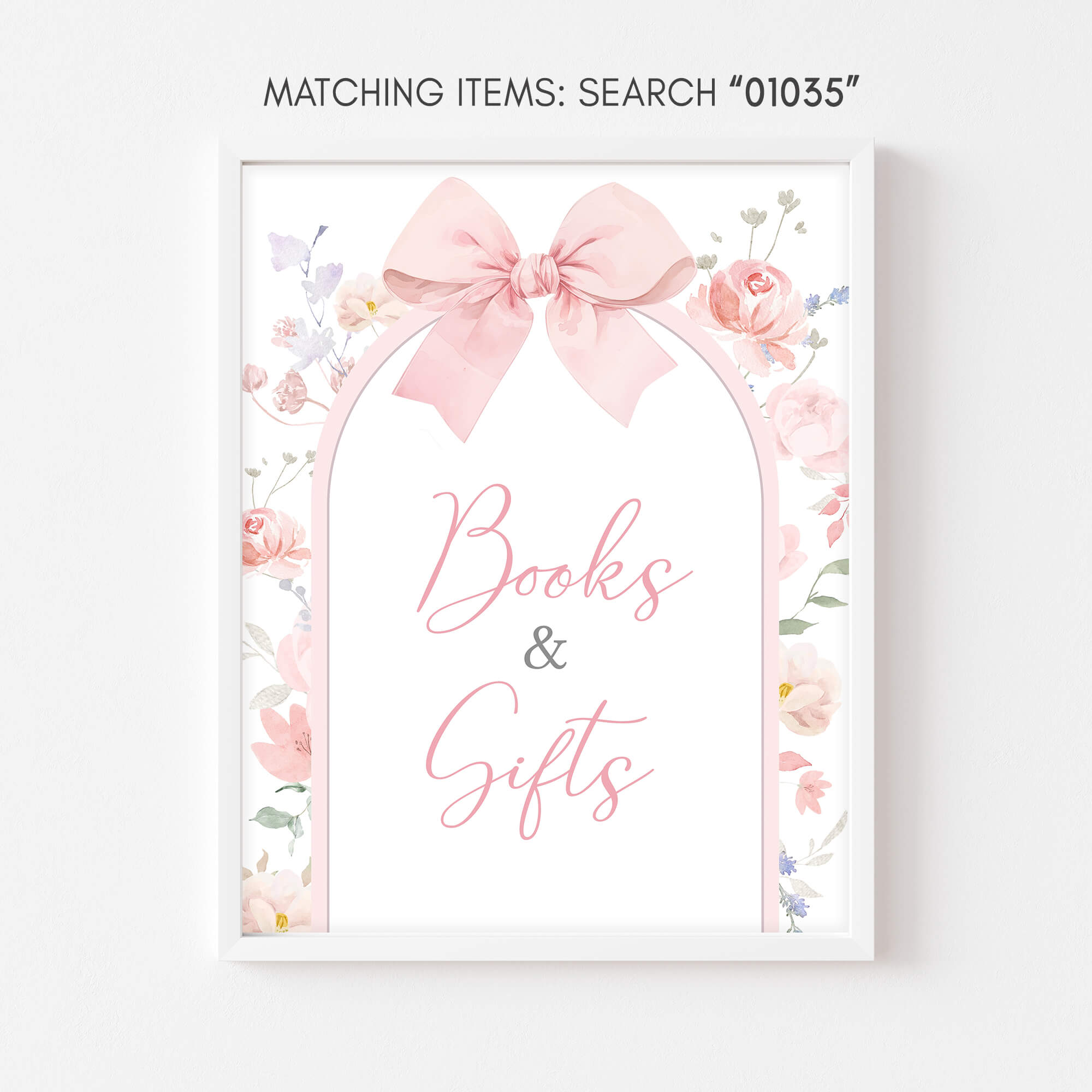 Craft an ideal atmosphere for your Spring Bow Baby Shower Party using our enchanting Pastel Flower Arch Baby Shower Books and Gifts Sign Printable. These prints not only add a touch of charm but also serve as helpful guides, directing guests to various Pink Floral Ribbon party sections with their delightful designs.