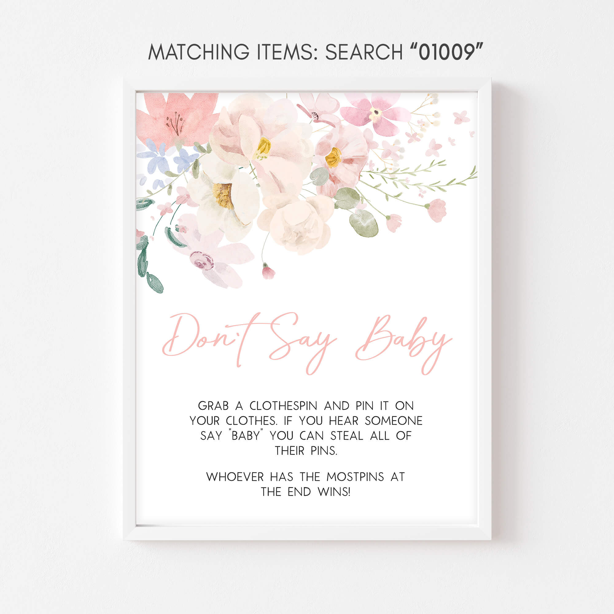 Craft an ideal atmosphere for your Pink Floral Baby Shower Party using our enchanting Girl Baby Bloom Baby Shower Don't Say Baby Game Sign Printable. These prints not only add a touch of charm but also serve as helpful guides, directing guests to various Watercolor Flower party sections with their delightful designs.