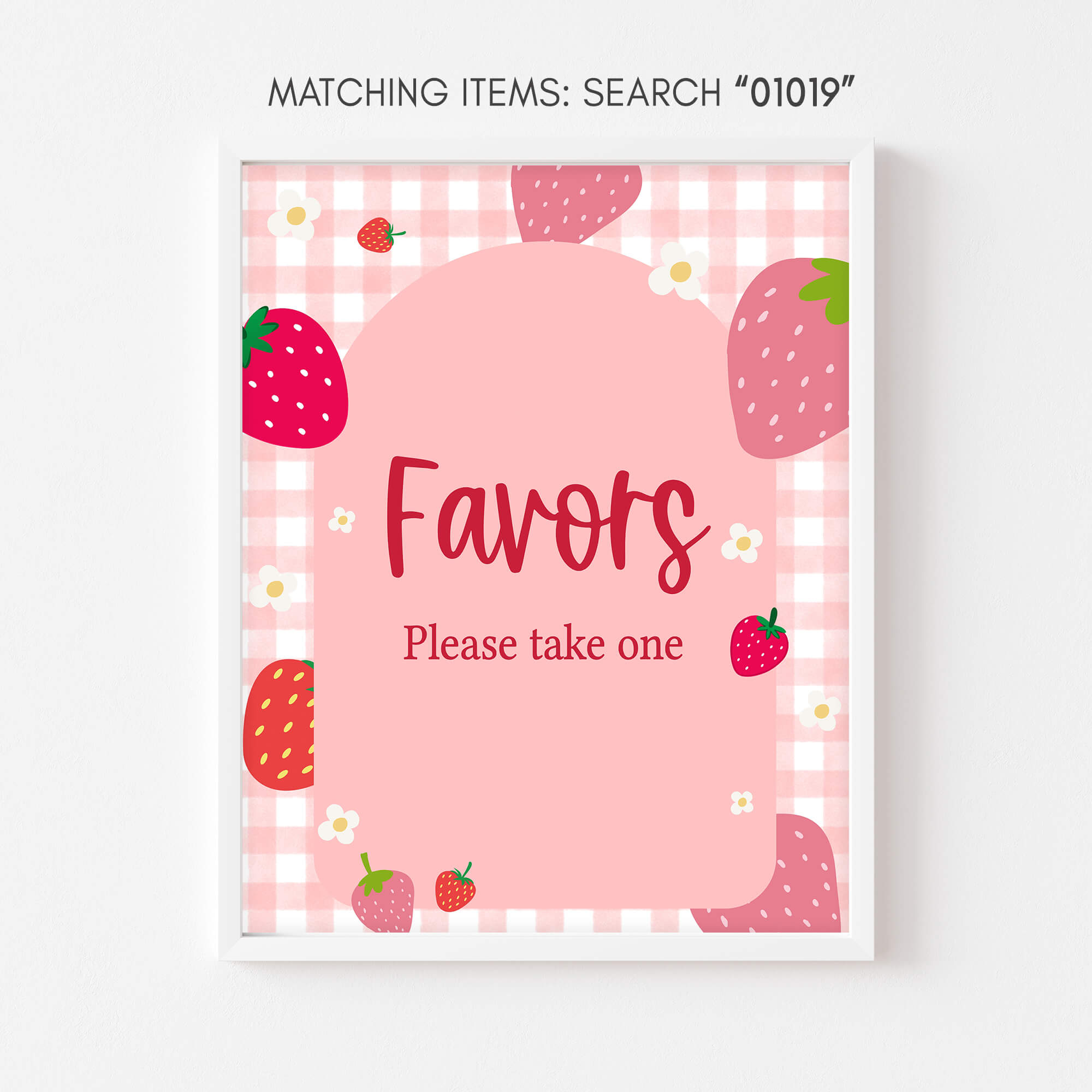 Craft an ideal atmosphere for your Pink Gingham Strawberry Baby Shower Party using our enchanting Berry Sweet on the Way Baby Shower Thank you Sign Printable. These prints not only add a touch of charm but also serve as helpful guides, directing guests to various Spring Summer Strawberry party sections with their delightful designs.