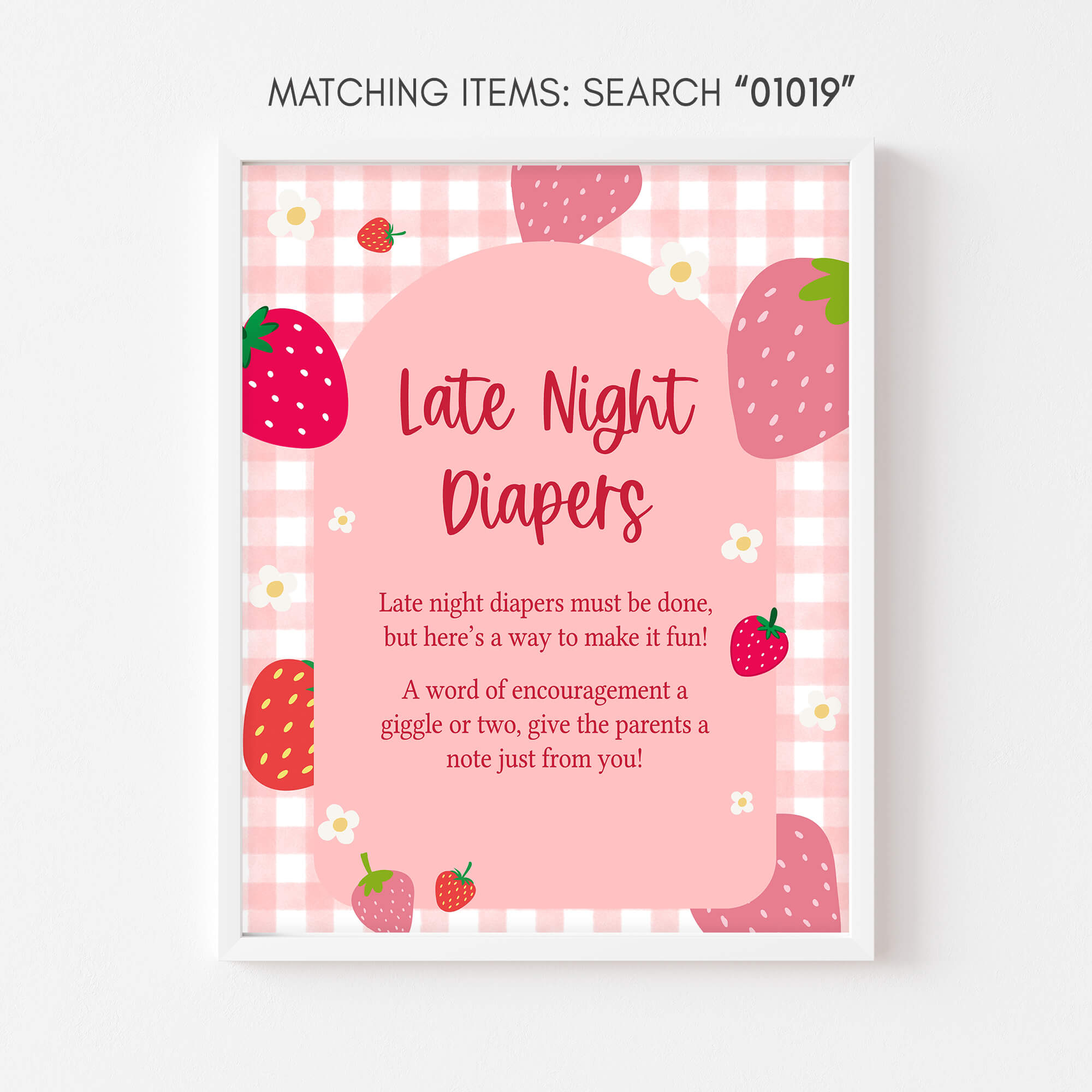 Craft an ideal atmosphere for your Pink Gingham Strawberry Baby Shower Party using our enchanting Berry Sweet on the Way Baby Shower Diaper Thoughts Sign Printable. These prints not only add a touch of charm but also serve as helpful guides, directing guests to various Spring Summer Strawberry party sections with their delightful designs.