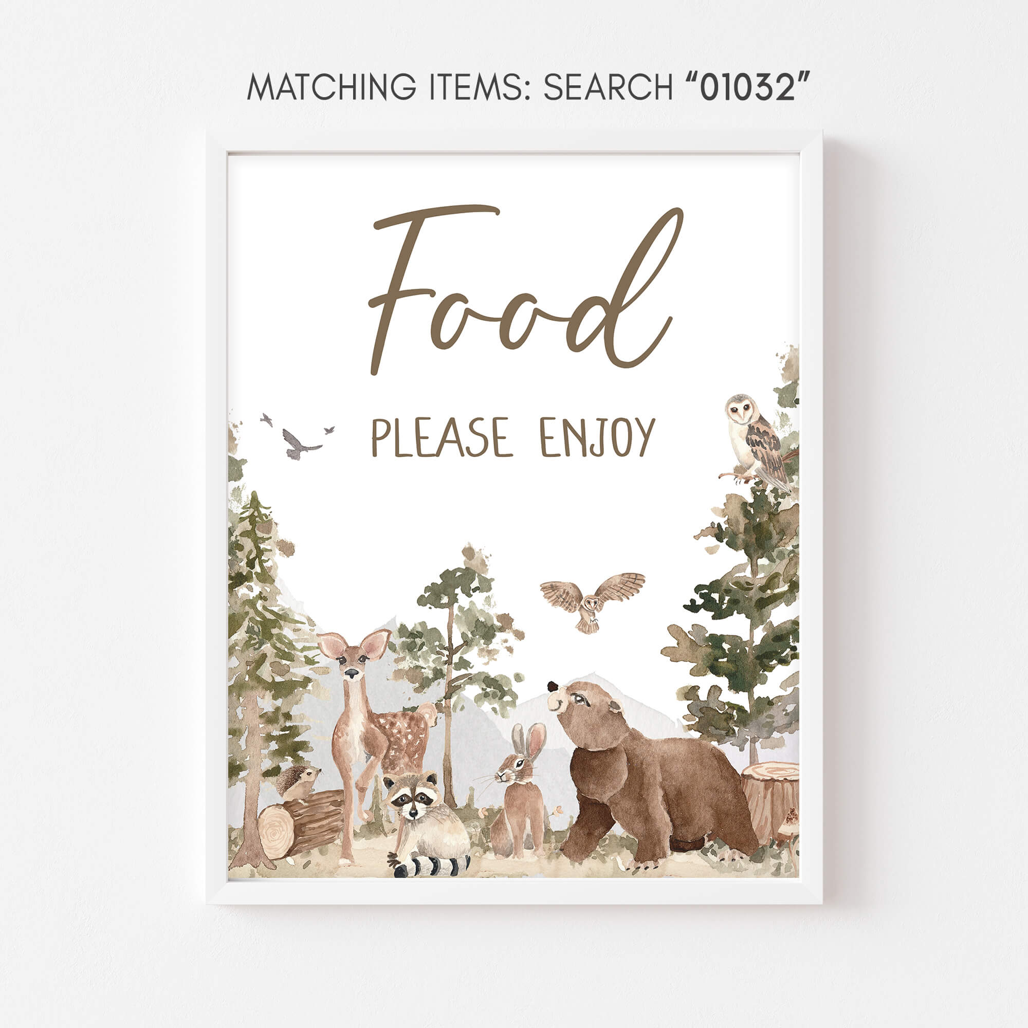 Craft an ideal atmosphere for your Rustic Outdoor Baby Shower Party using our enchanting Adventure Awaits Baby Shower Food Table Sign Printable. These prints not only add a touch of charm but also serve as helpful guides, directing guests to various Forest Animals party sections with their delightful designs.