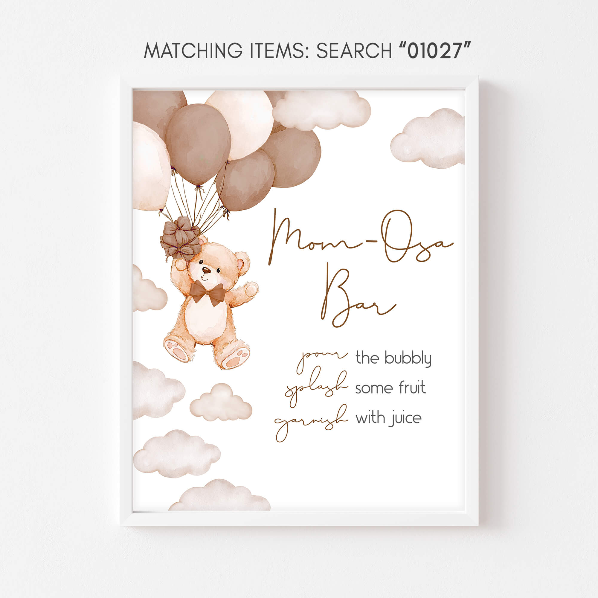 Craft an ideal atmosphere for your Balloon Bear Baby Shower Party using our enchanting Gender Neutral Teddy Bear Baby Shower Mimosa Sign Printable. These prints not only add a touch of charm but also serve as helpful guides, directing guests to various We Can Bearly Wait party sections with their delightful designs.