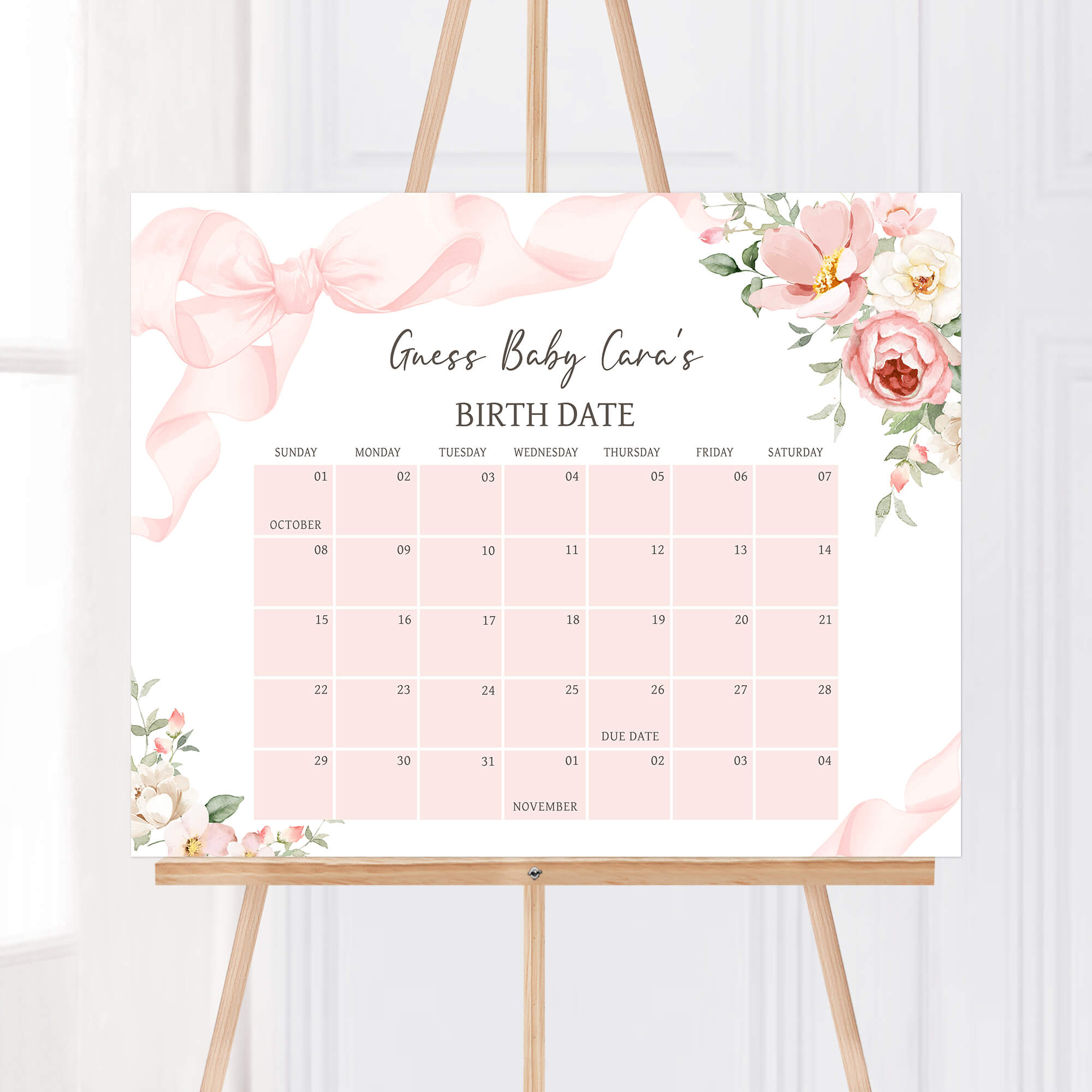 Partake in the excitement of your Girl Flowers Baby Shower Party with our Pastel Coquette Ribbon Due Date Game! Embrace the adorable spirit of the Pink Baby in Bloom Baby Shower party as guests make their predictions for the due date, coming together to share in the anticipation of the upcoming arrival. Complete the joy and fun with this Spring Baby Shower Birthday Predictions.