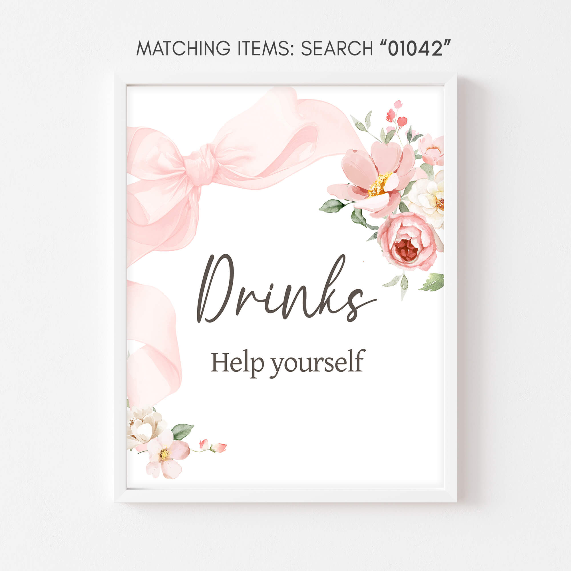 Craft an ideal atmosphere for your Girl Flowers Baby Shower Party using our enchanting Pastel Coquette Ribbon Baby Shower Drinks Station Sign Printable. These prints not only add a touch of charm but also serve as helpful guides, directing guests to various Pink Baby in Bloom party sections with their delightful designs.