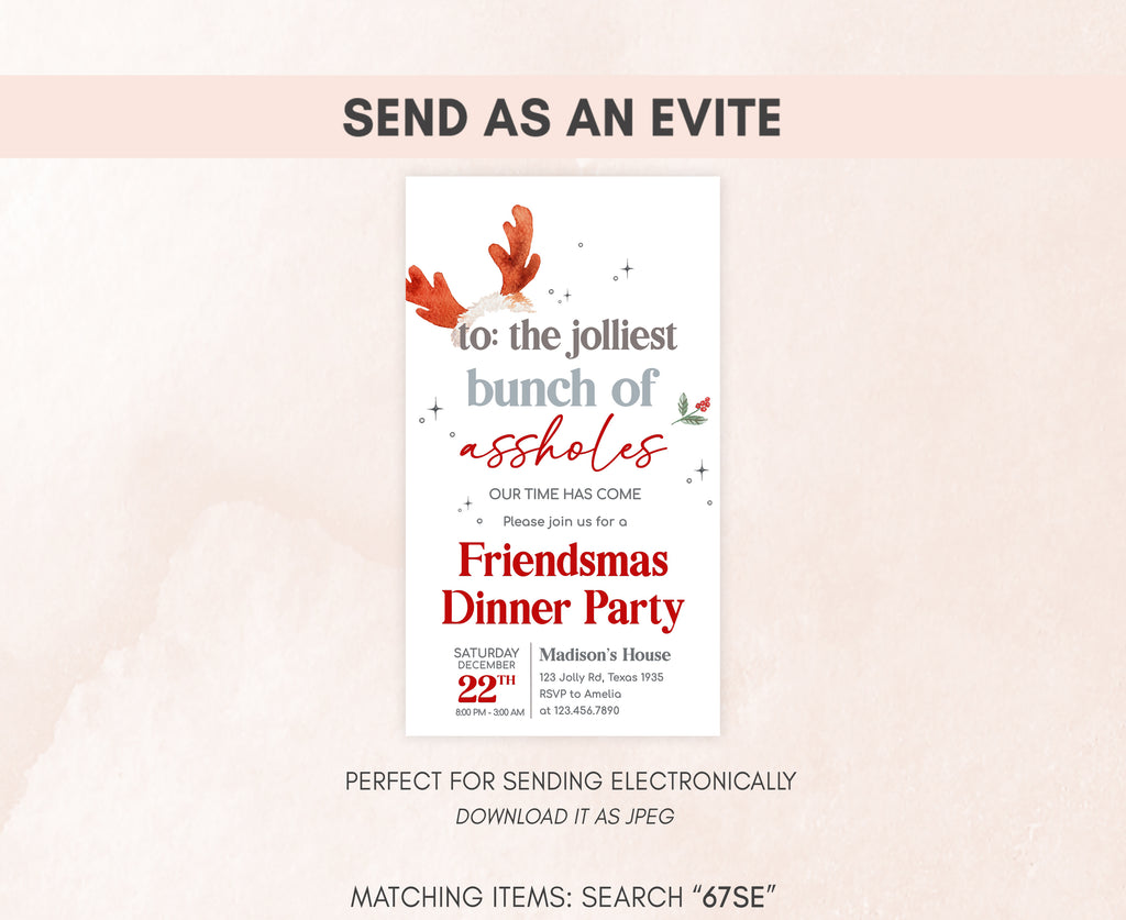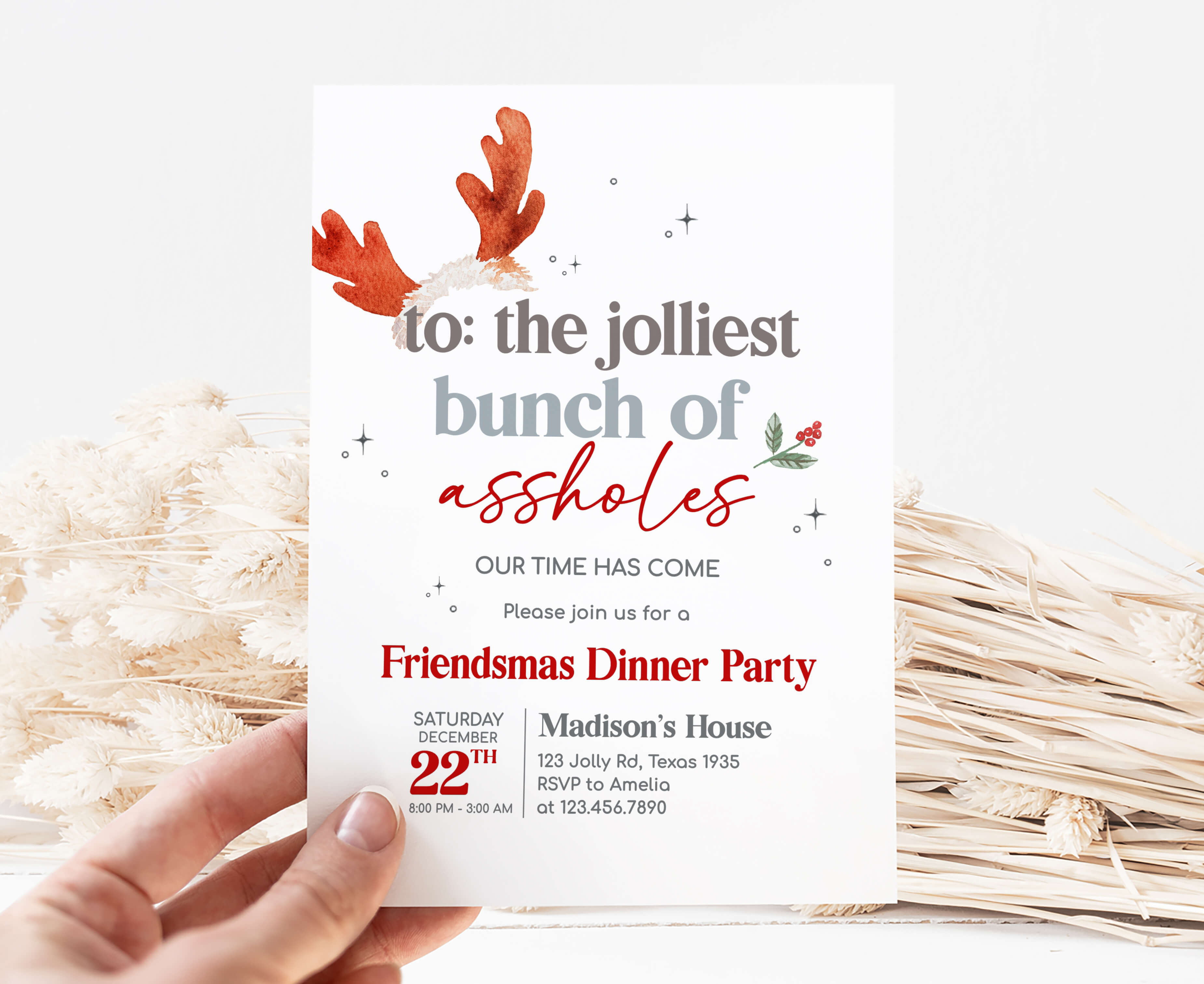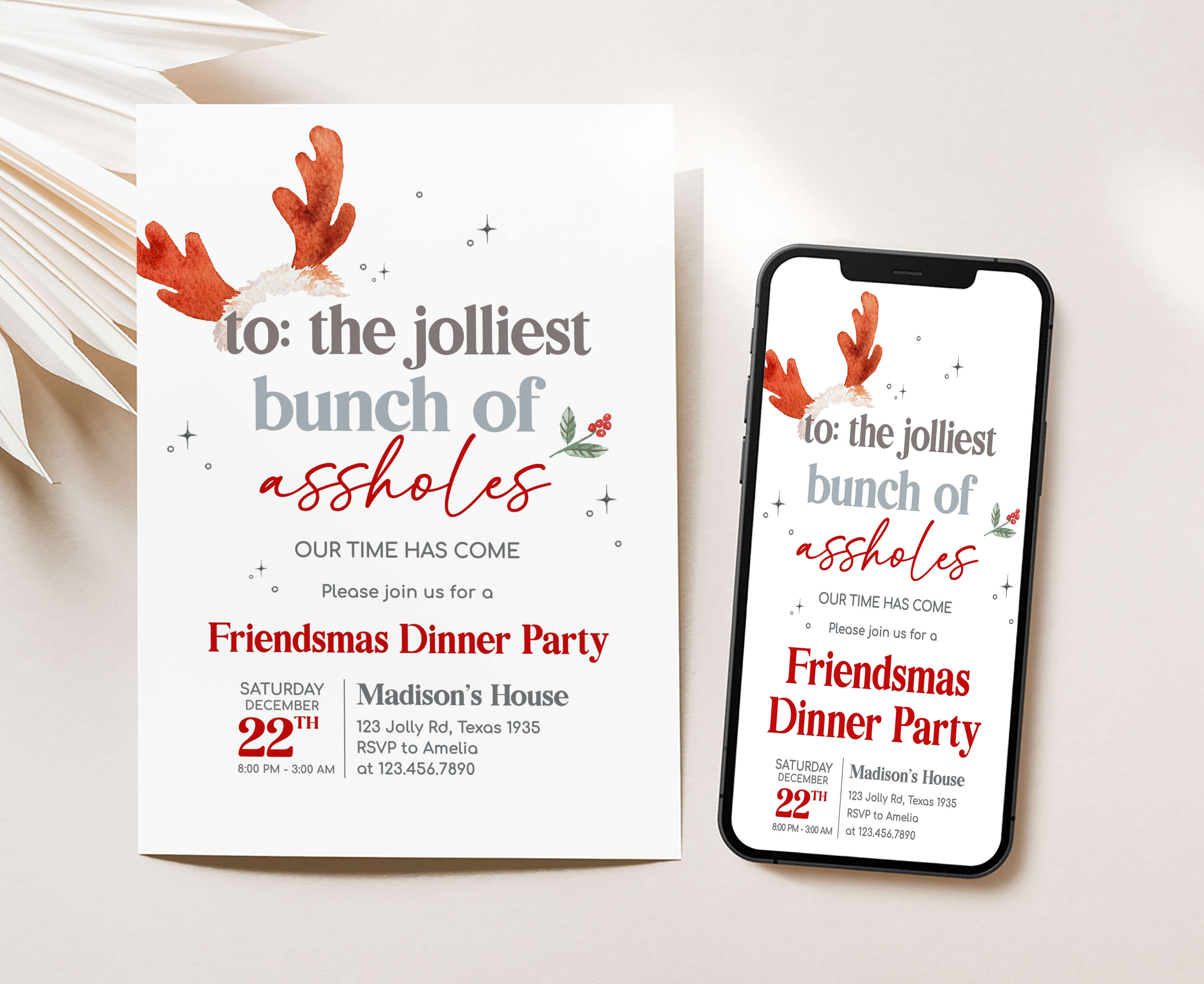 Celebrate with your guests at your Minimalist Christmas Party using our delightful Friendsmas Dinner Party Invitation. This Modern Funny Holiday Invite is the ideal choice to tone for a Christmas-themed celebration.