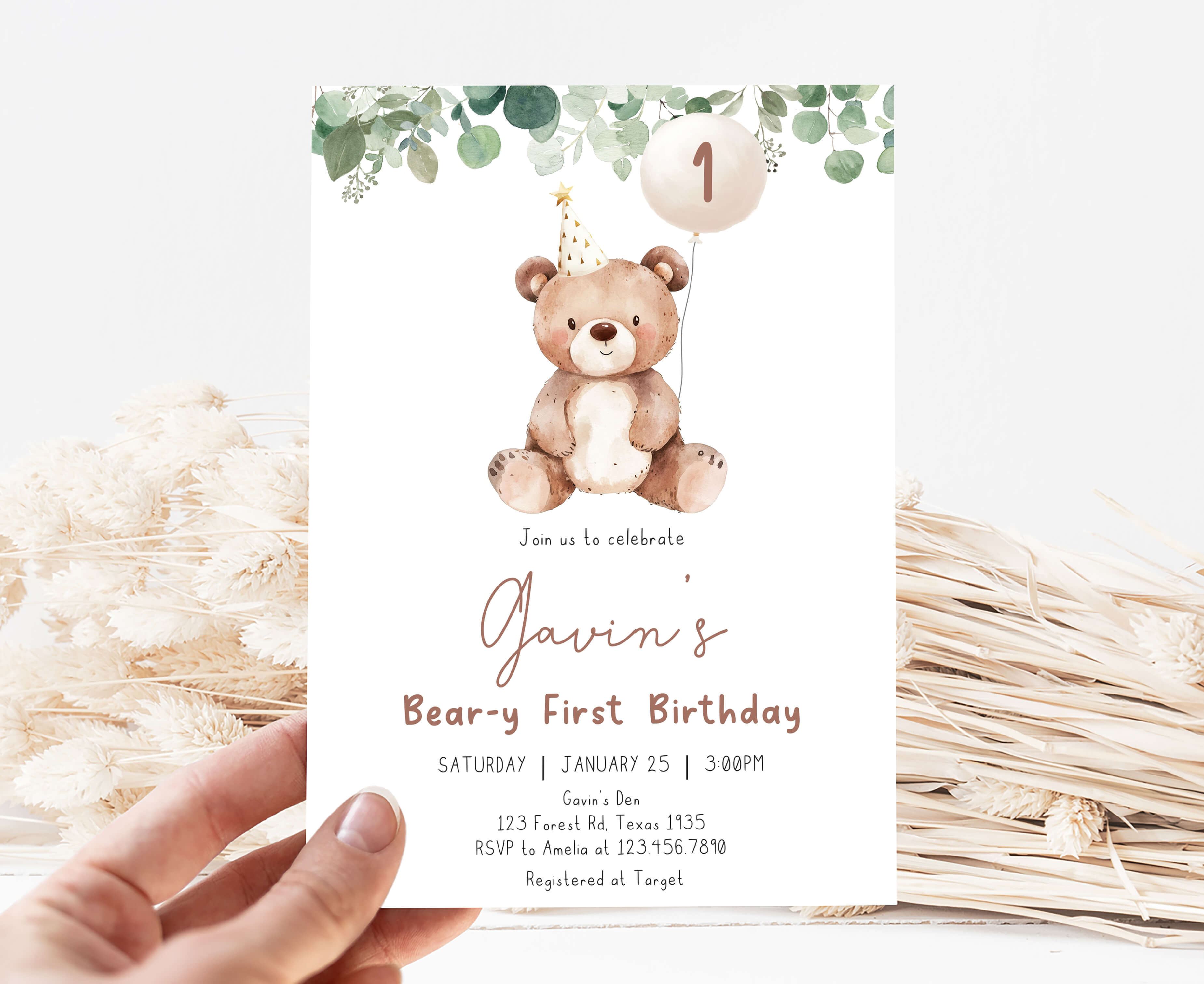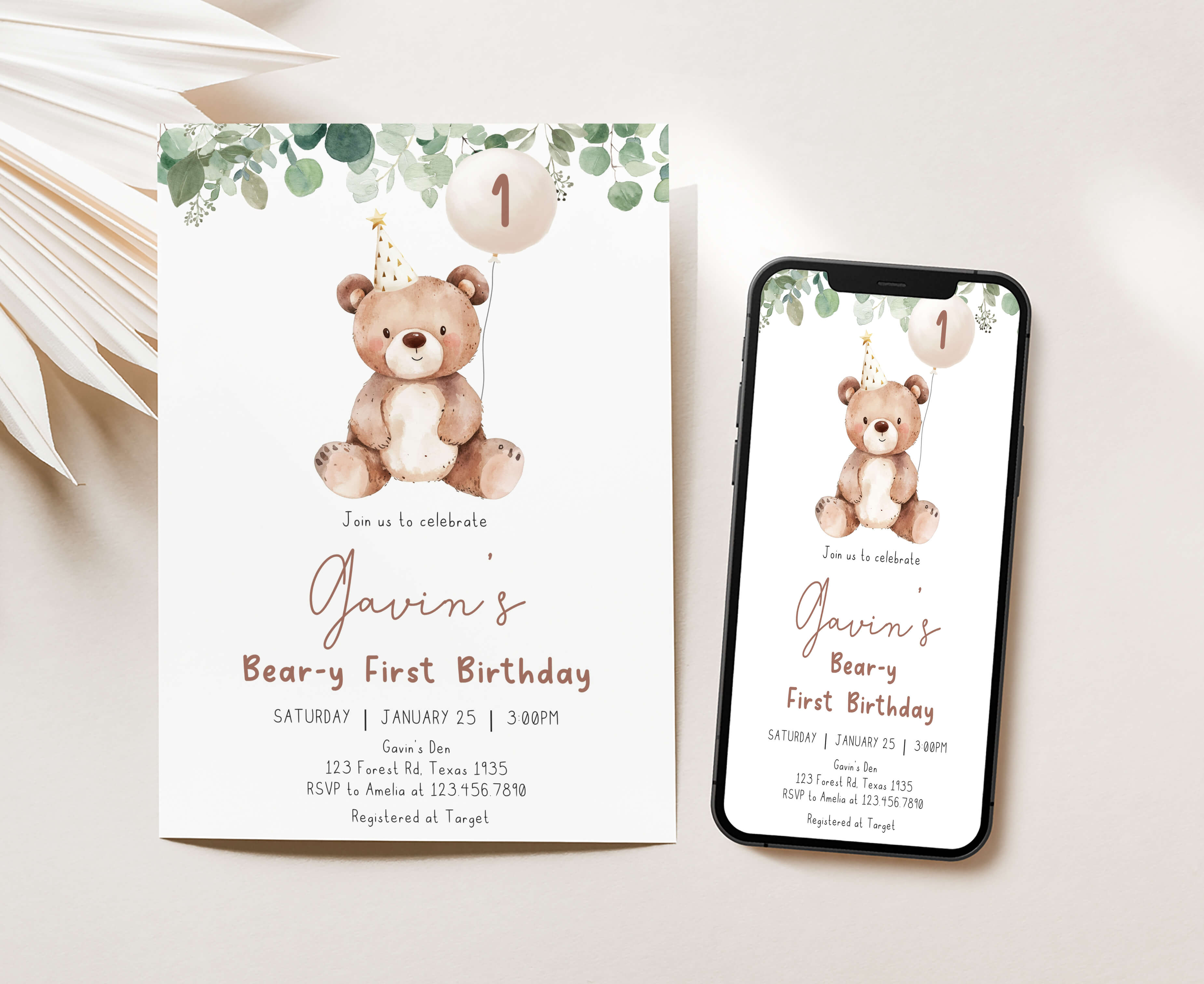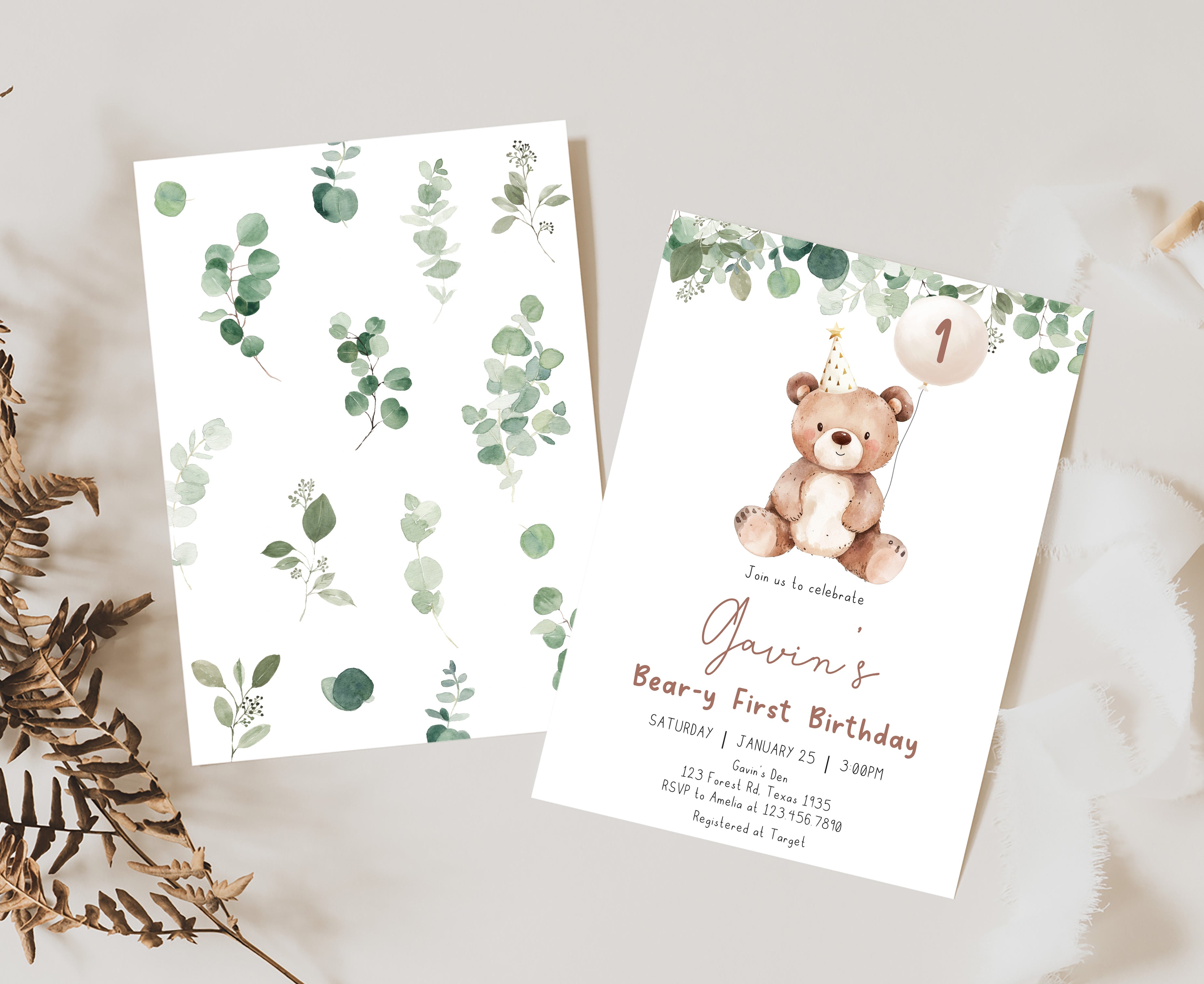 Celebrate with your guests at your Green Balloon Bear Birthday Party using our delightful Woodland Bear Birthday Invitation. This Greenery Teddy Bear Birthday Invite is the ideal choice to tone for a Bear-themed celebration.
