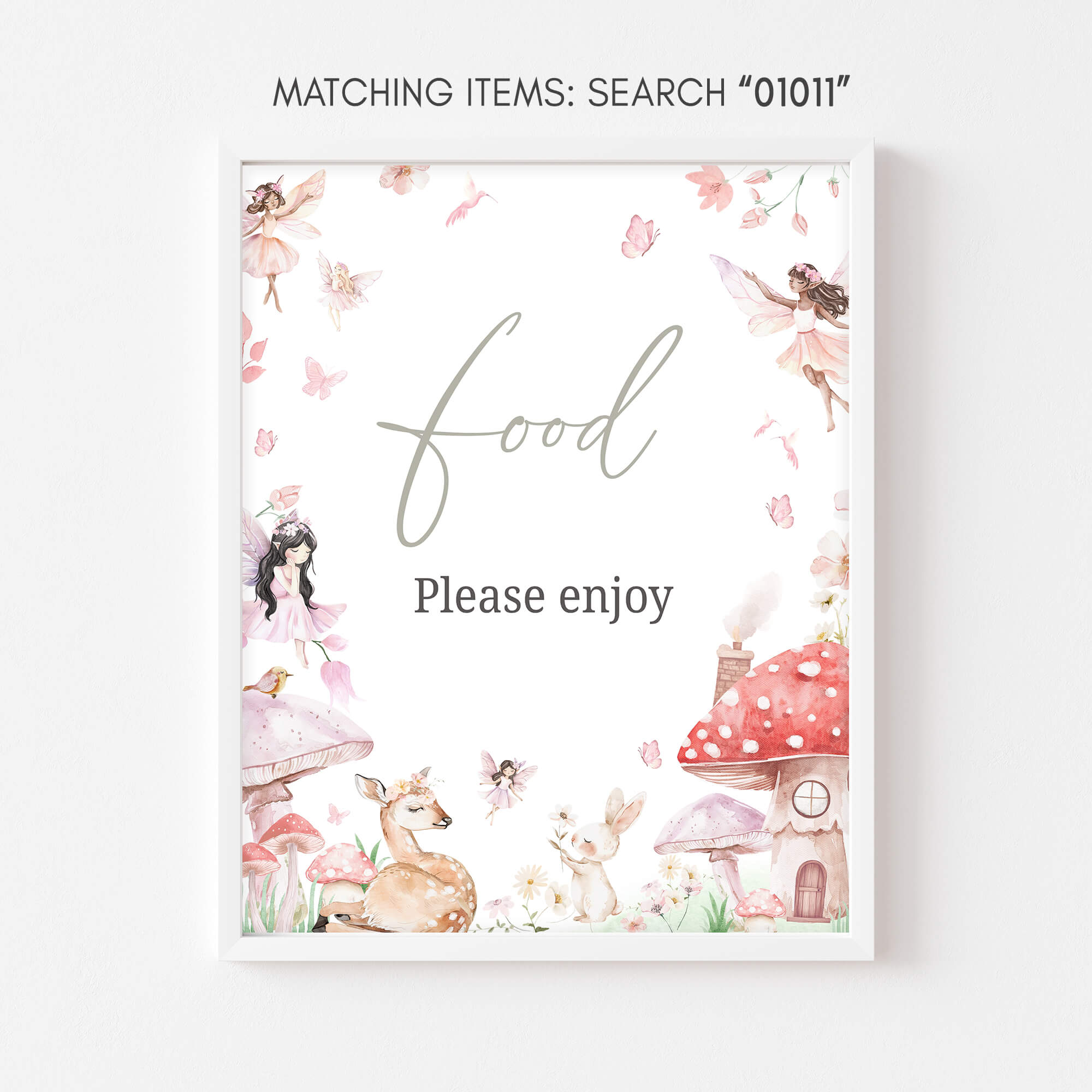 Craft an ideal atmosphere for your Fairy Forest Baby Shower Party using our enchanting Woodland Fairy Baby Shower Food Table Sign Printable. These prints not only add a touch of charm but also serve as helpful guides, directing guests to various Spring Mushroom party sections with their delightful designs.