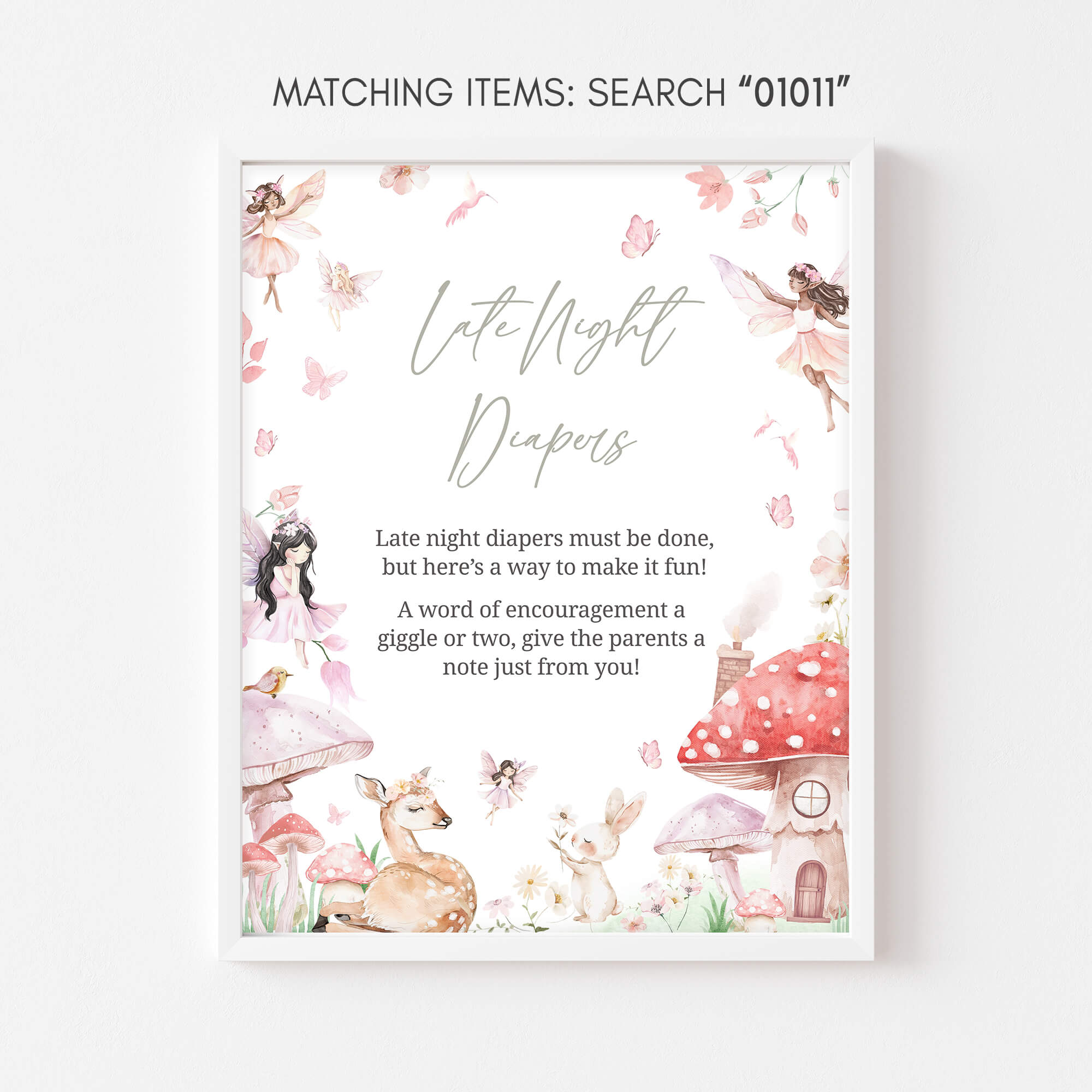 Craft an ideal atmosphere for your Fairy Forest Baby Shower Party using our enchanting Woodland Fairy Baby Shower Diaper Thoughts Sign Printable. These prints not only add a touch of charm but also serve as helpful guides, directing guests to various Spring Mushroom party sections with their delightful designs.