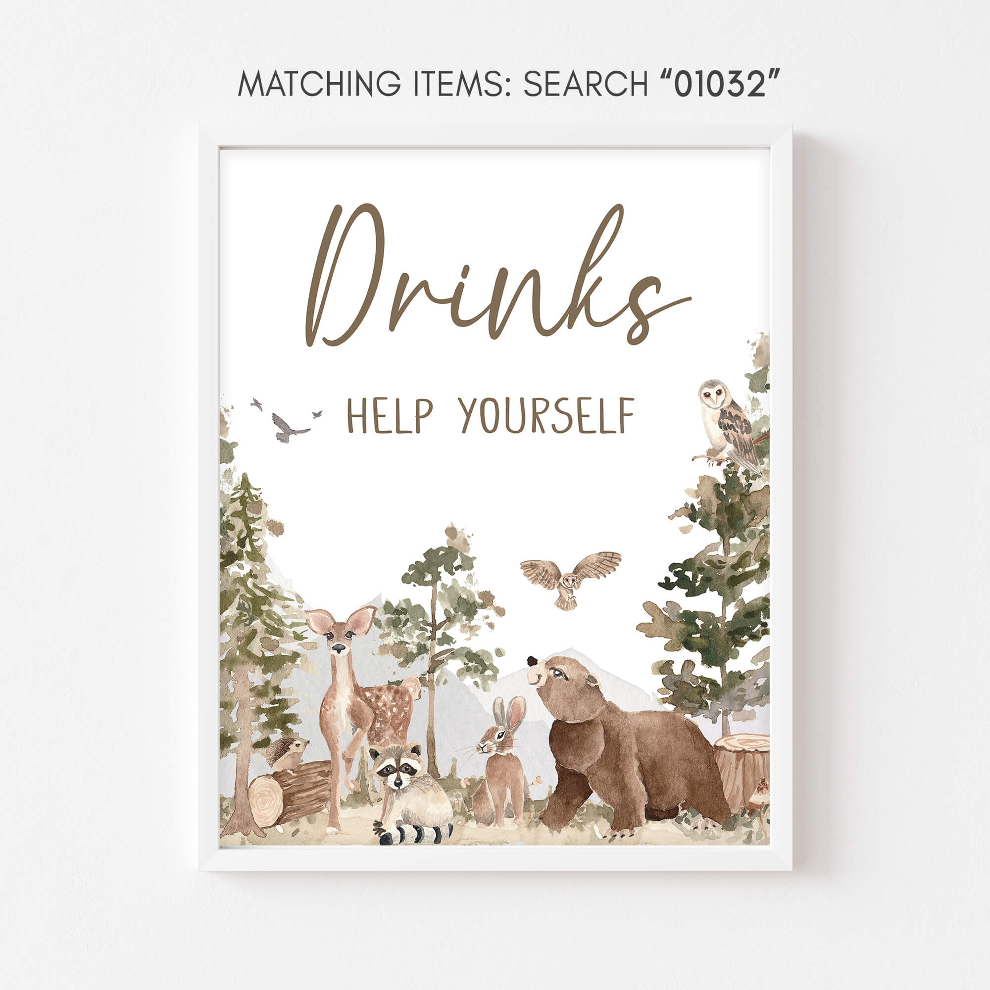 Craft an ideal atmosphere for your Rustic Outdoor Baby Shower Party using our enchanting Adventure Awaits Baby Shower Drinks Station Sign Printable. These prints not only add a touch of charm but also serve as helpful guides, directing guests to various Forest Animals party sections with their delightful designs.