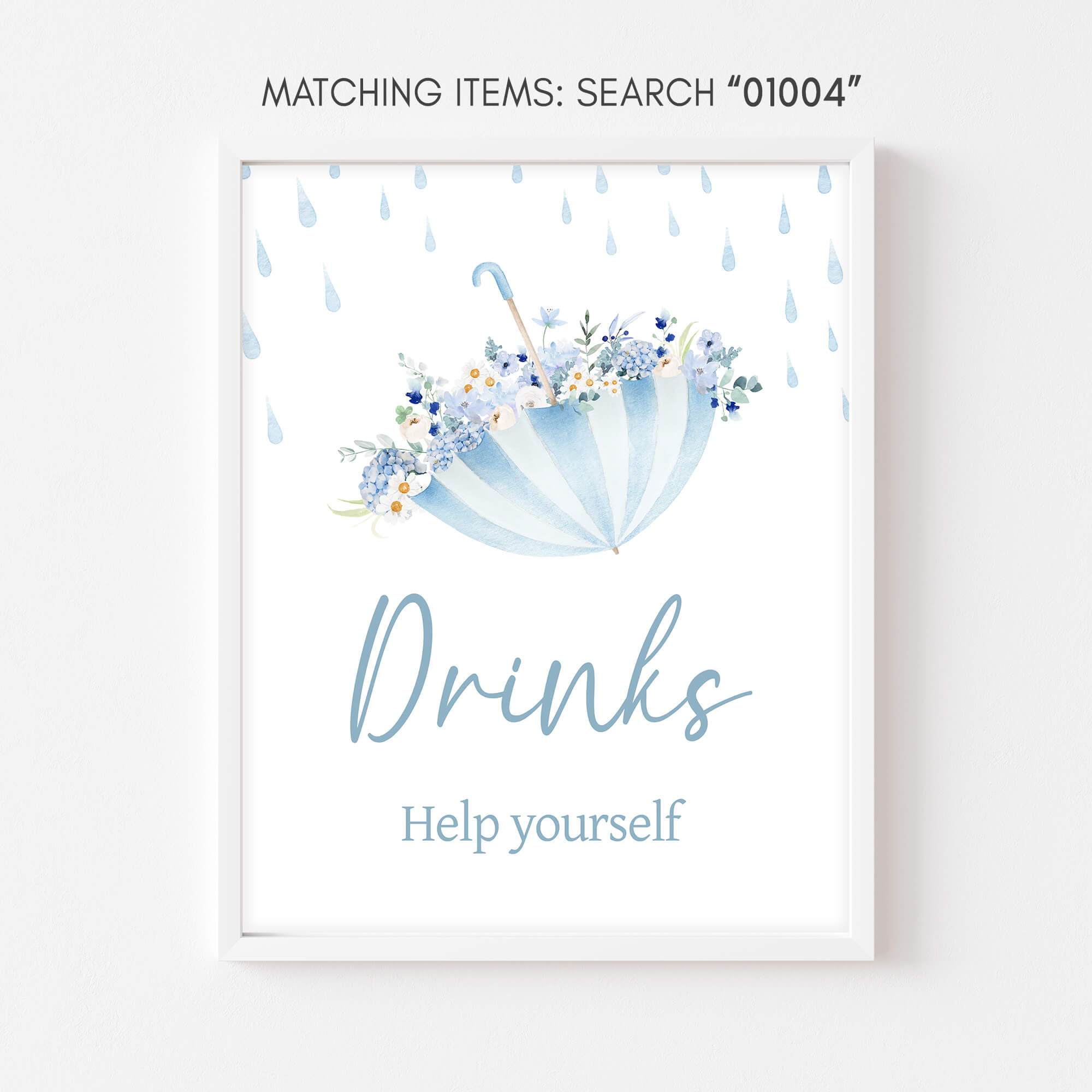 Craft an ideal atmosphere for your Blue Spring Baby Shower Party using our enchanting Rain Showers Baby Shower Drinks Station Sign Printable. These prints not only add a touch of charm but also serve as helpful guides, directing guests to various Floral Umbrella party sections with their delightful designs.