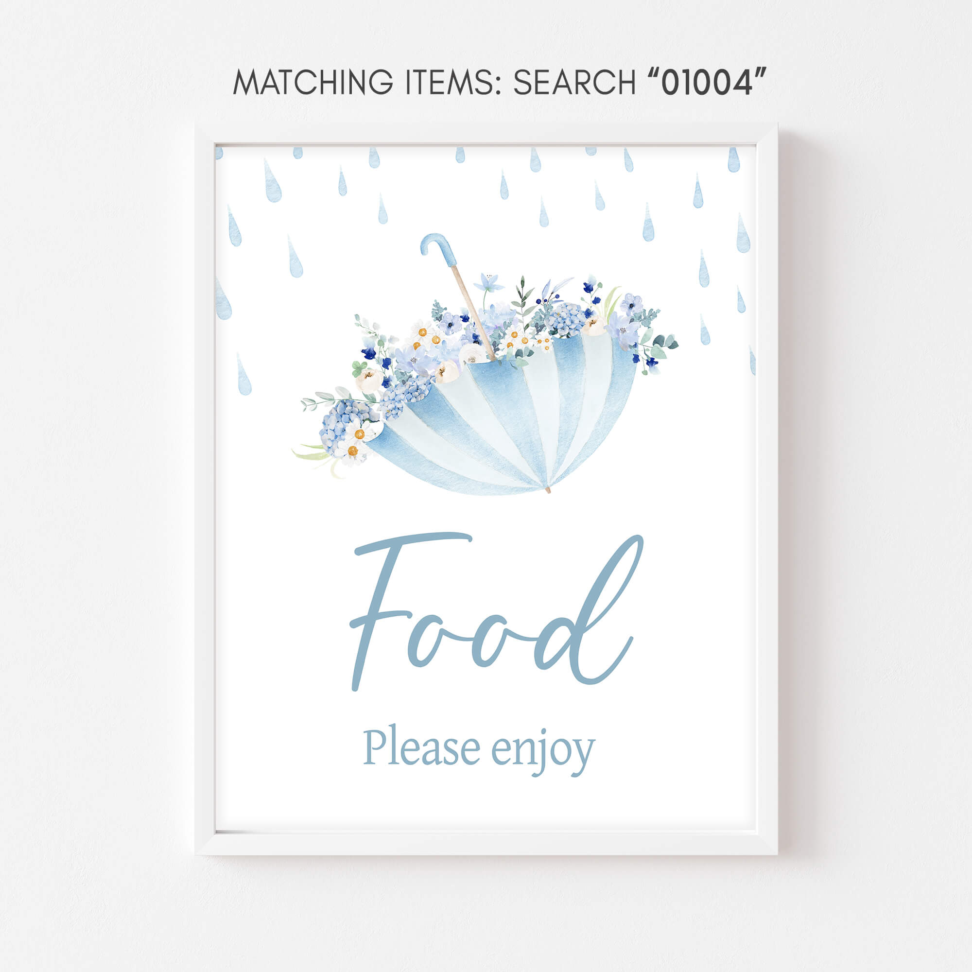 Craft an ideal atmosphere for your Blue Spring Baby Shower Party using our enchanting Rain Showers Baby Shower Food Table Sign Printable. These prints not only add a touch of charm but also serve as helpful guides, directing guests to various Floral Umbrella party sections with their delightful designs.