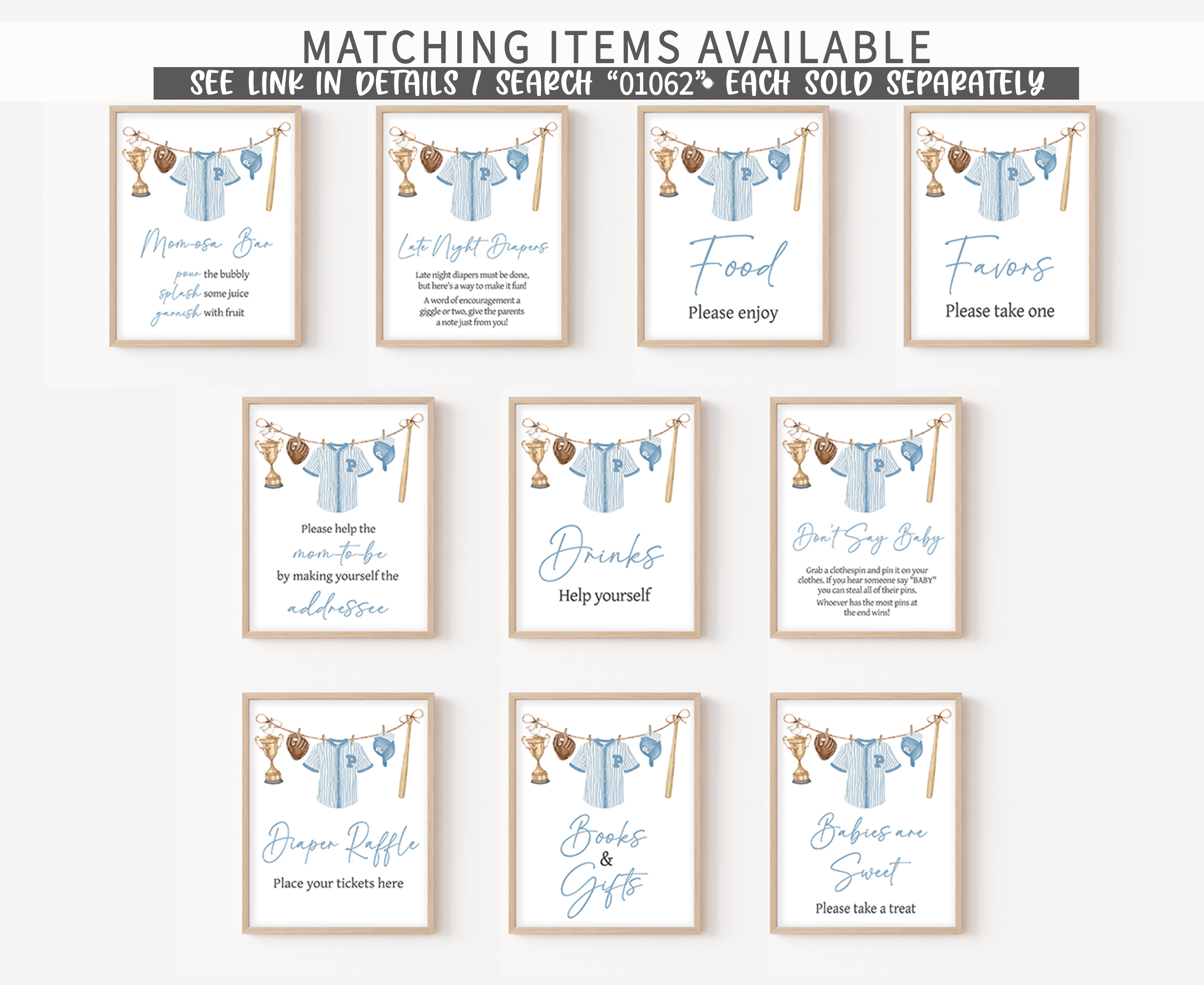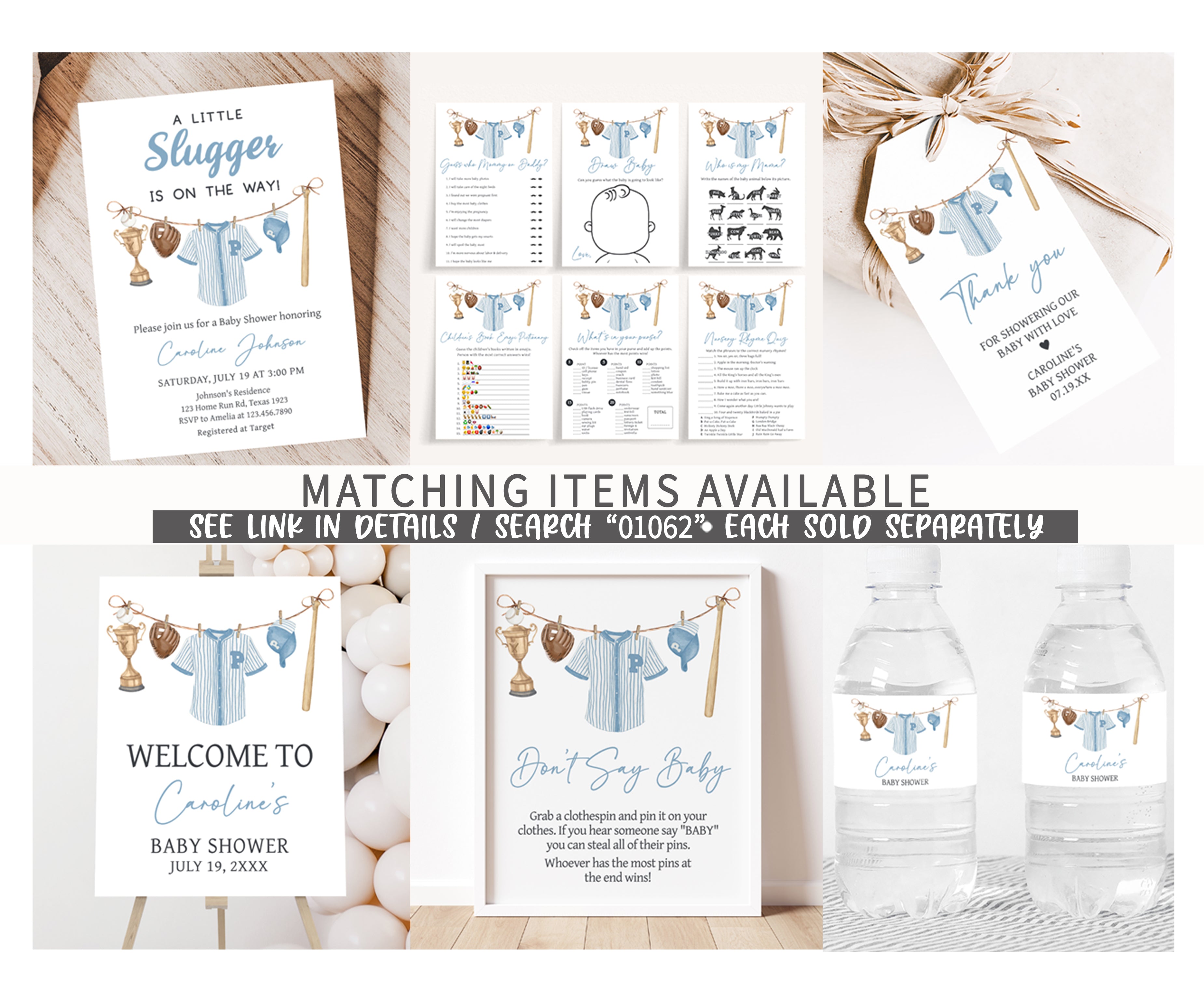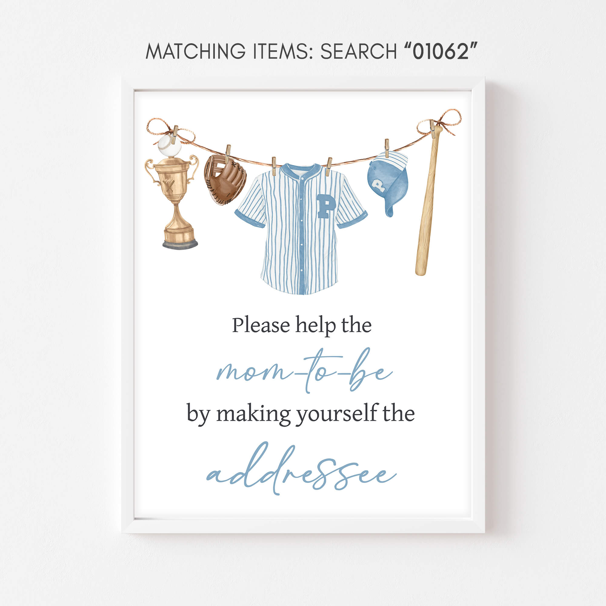 Craft an ideal atmosphere for your Minimalist Sports Baby Shower Party using our enchanting A Little Slugger is on the Way Baby Shower Addressee Sign Printable. These prints not only add a touch of charm but also serve as helpful guides, directing guests to various Blue Baseball Clothesline party sections with their delightful designs.