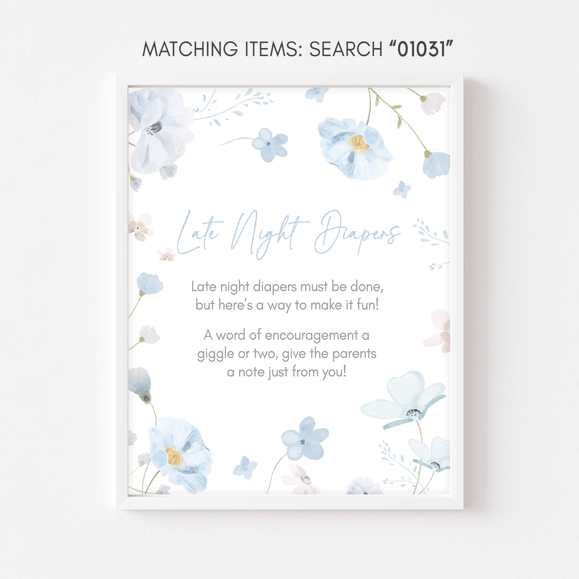 Craft an ideal atmosphere for your Spring Pastel Blossoms Baby Shower Party using our enchanting Blue Baby in Bloom Baby Shower Diaper Thoughts Sign Printable. These prints not only add a touch of charm but also serve as helpful guides, directing guests to various Watercolor Flower party sections with their delightful designs.