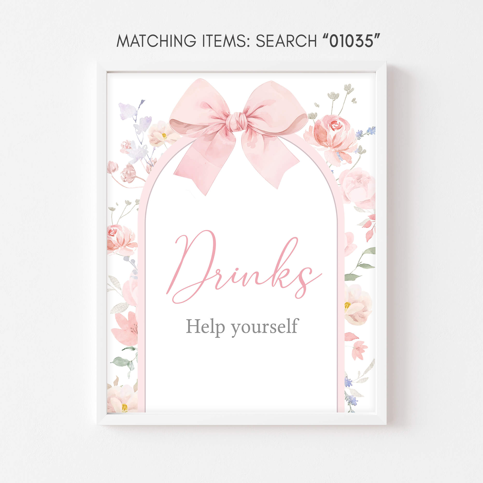 Craft an ideal atmosphere for your Spring Bow Baby Shower Party using our enchanting Pastel Flower Arch Baby Shower Drinks Station Sign Printable. These prints not only add a touch of charm but also serve as helpful guides, directing guests to various Pink Floral Ribbon party sections with their delightful designs.