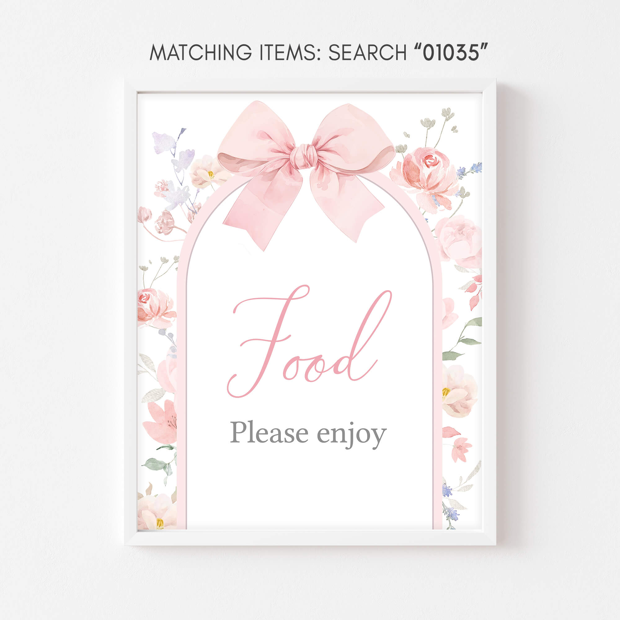 Craft an ideal atmosphere for your Spring Bow Baby Shower Party using our enchanting Pastel Flower Arch Baby Shower Food Table Sign Printable. These prints not only add a touch of charm but also serve as helpful guides, directing guests to various Pink Floral Ribbon party sections with their delightful designs.