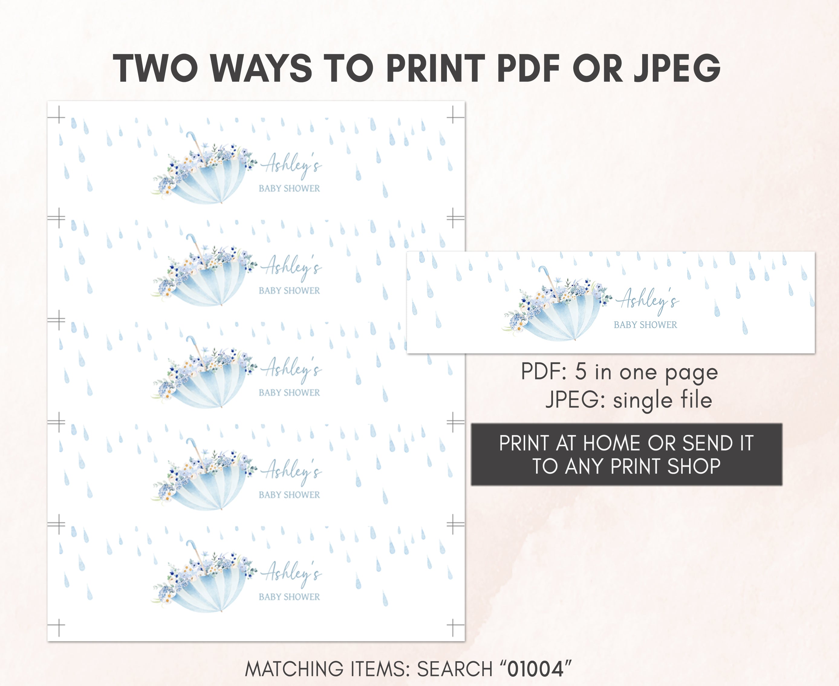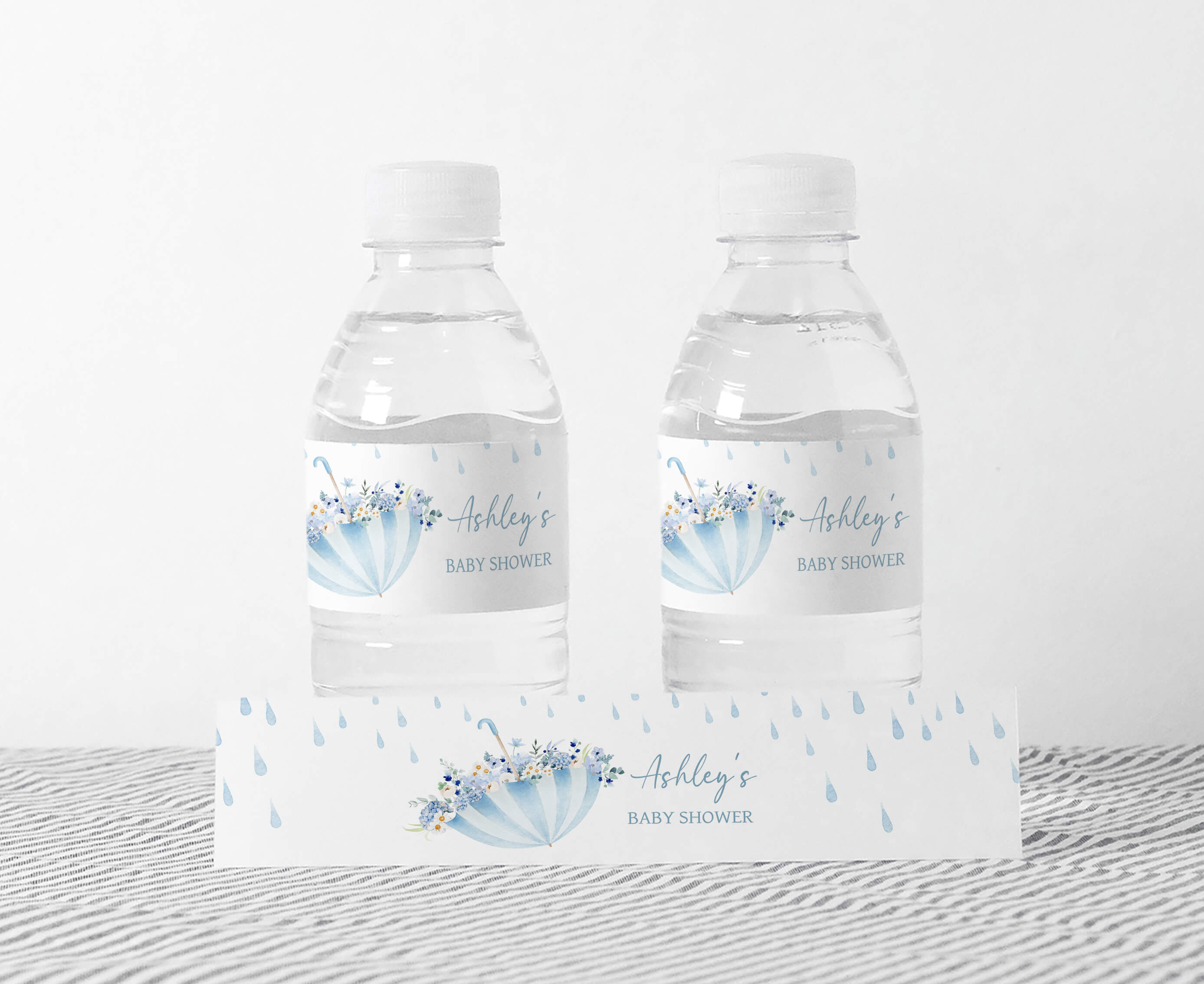 Sprinkle a touch of sweetness onto your Blue Spring Baby Shower Party by using our adorable Rain Showers Water Bottle Labels. These delightful Floral Umbrella Water Wraps will not only make staying hydrated a pleasure but also keep your guests feeling refreshed as they join in the celebration of this joyous occasion.