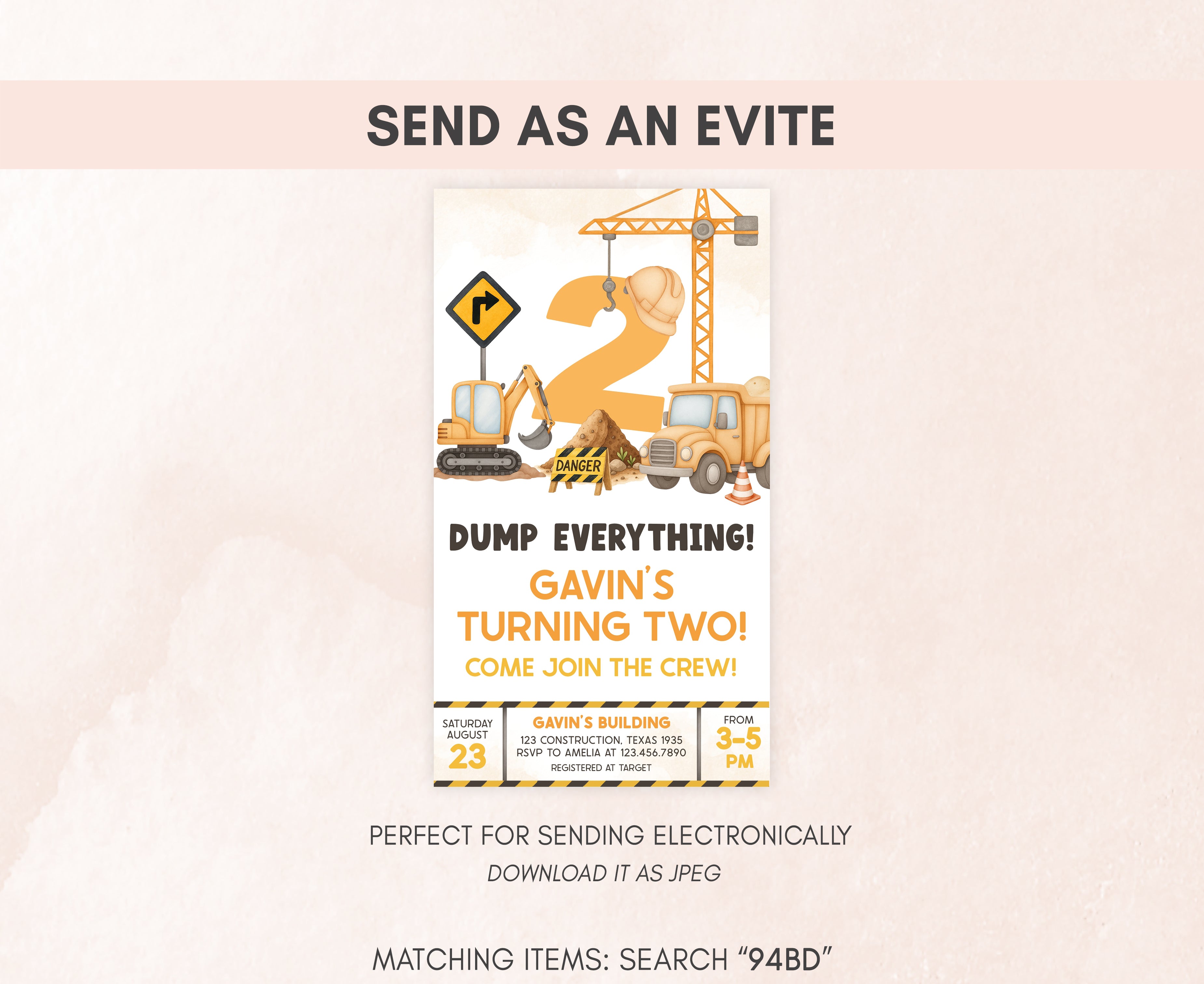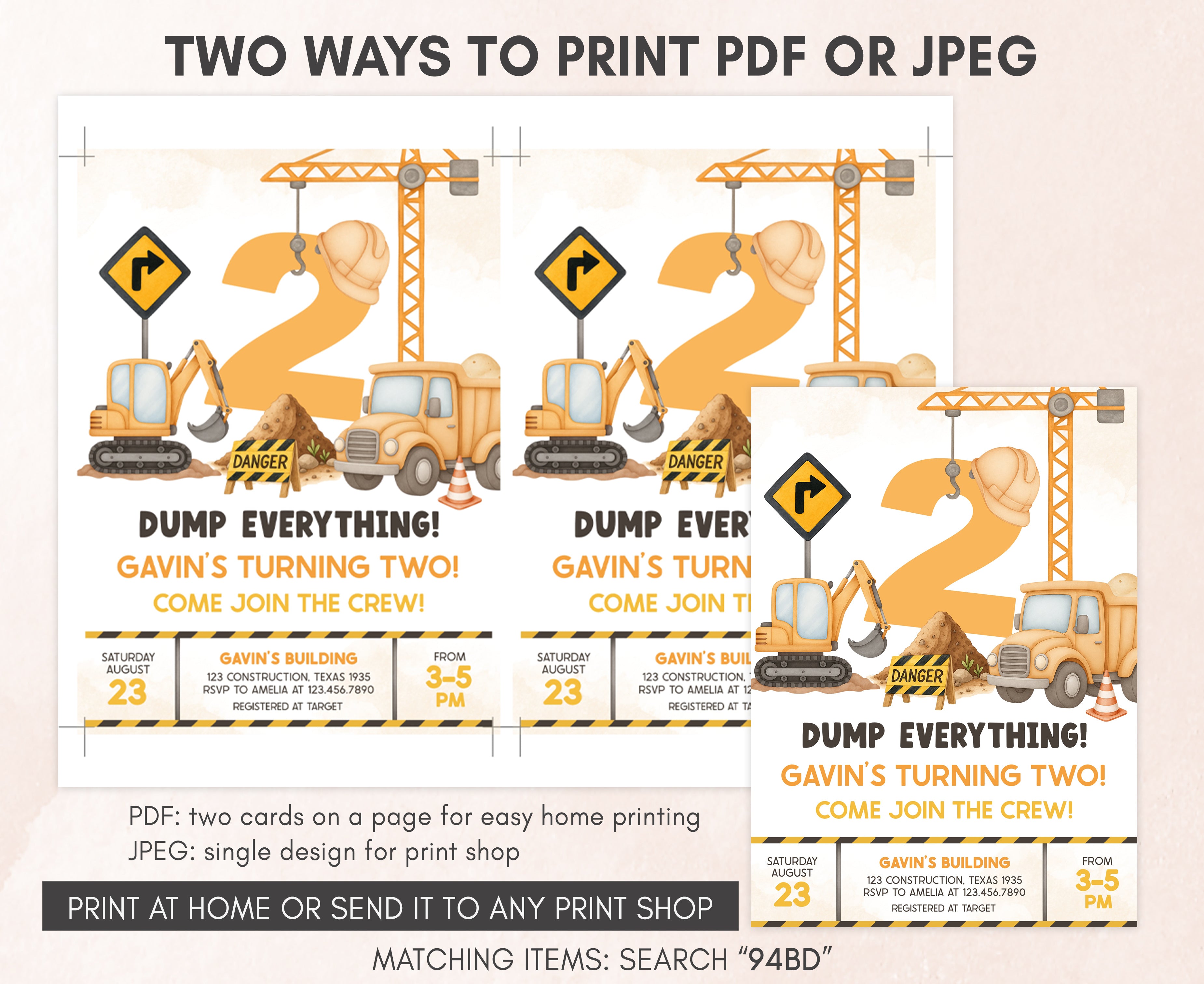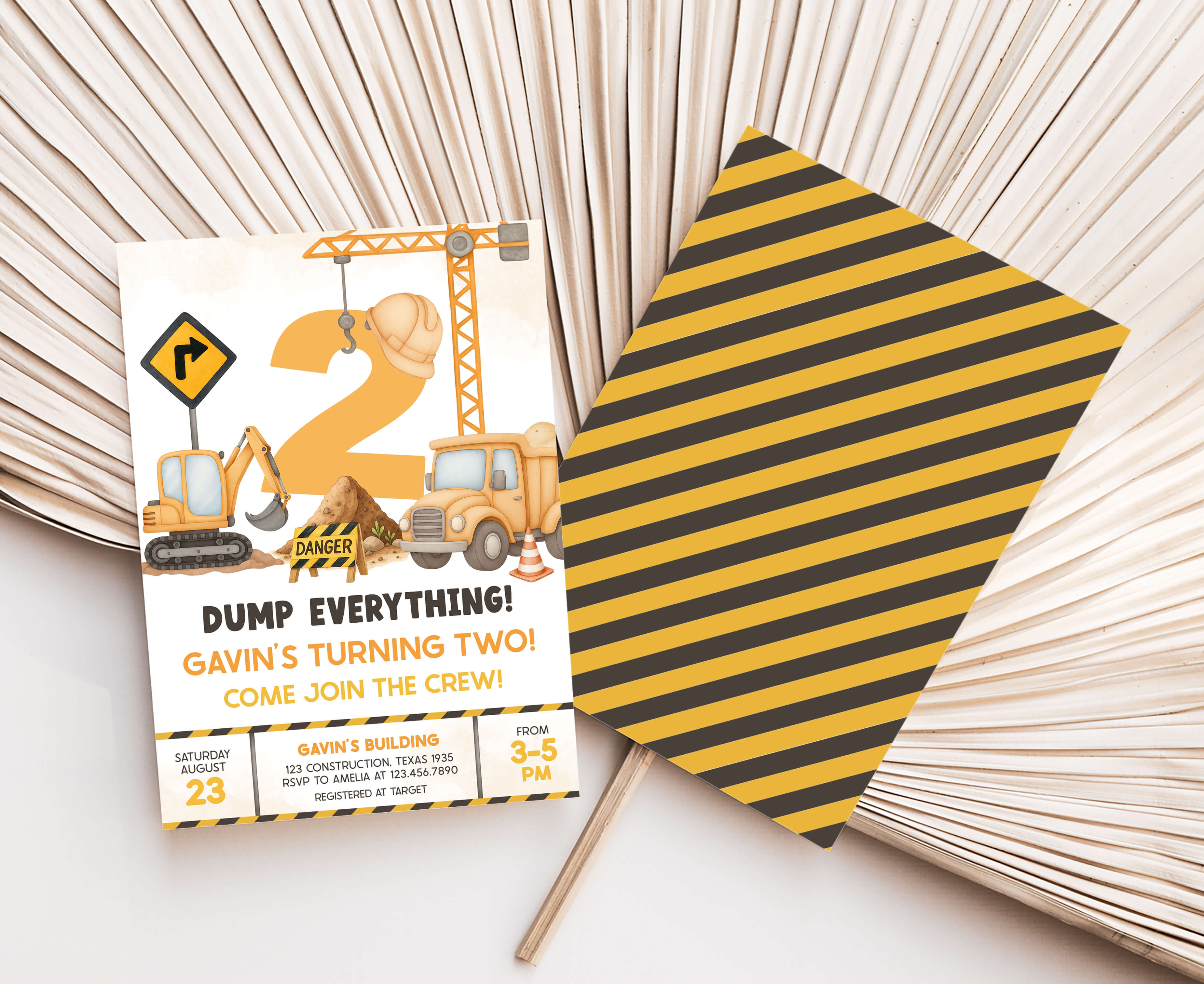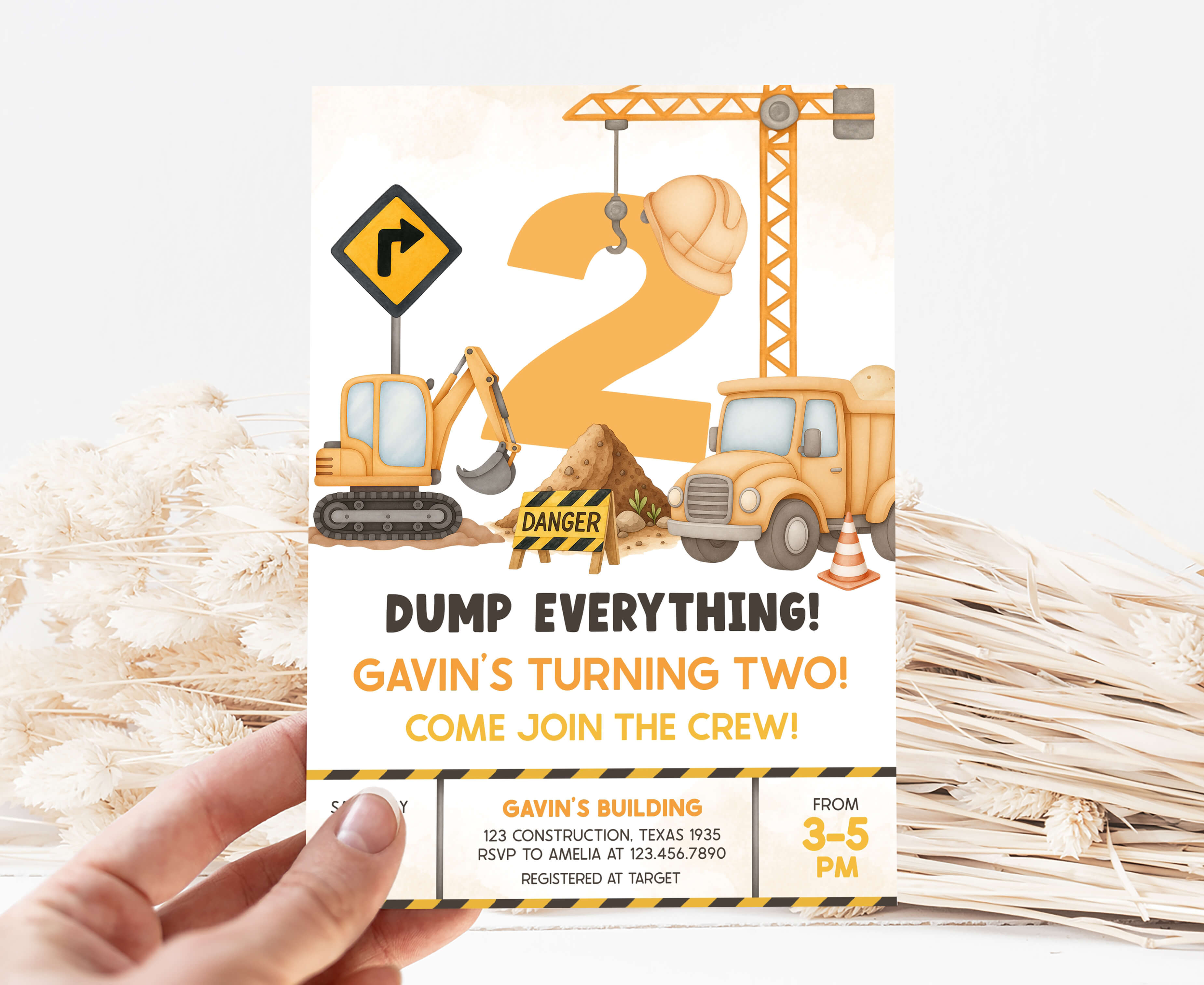 Celebrate with your guests at your Boy Second Birthday Party using our delightful Excavator Crane Birthday Invitation. This Dump Truck Birthday Invite is the ideal choice to tone for a Construction-themed celebration.
