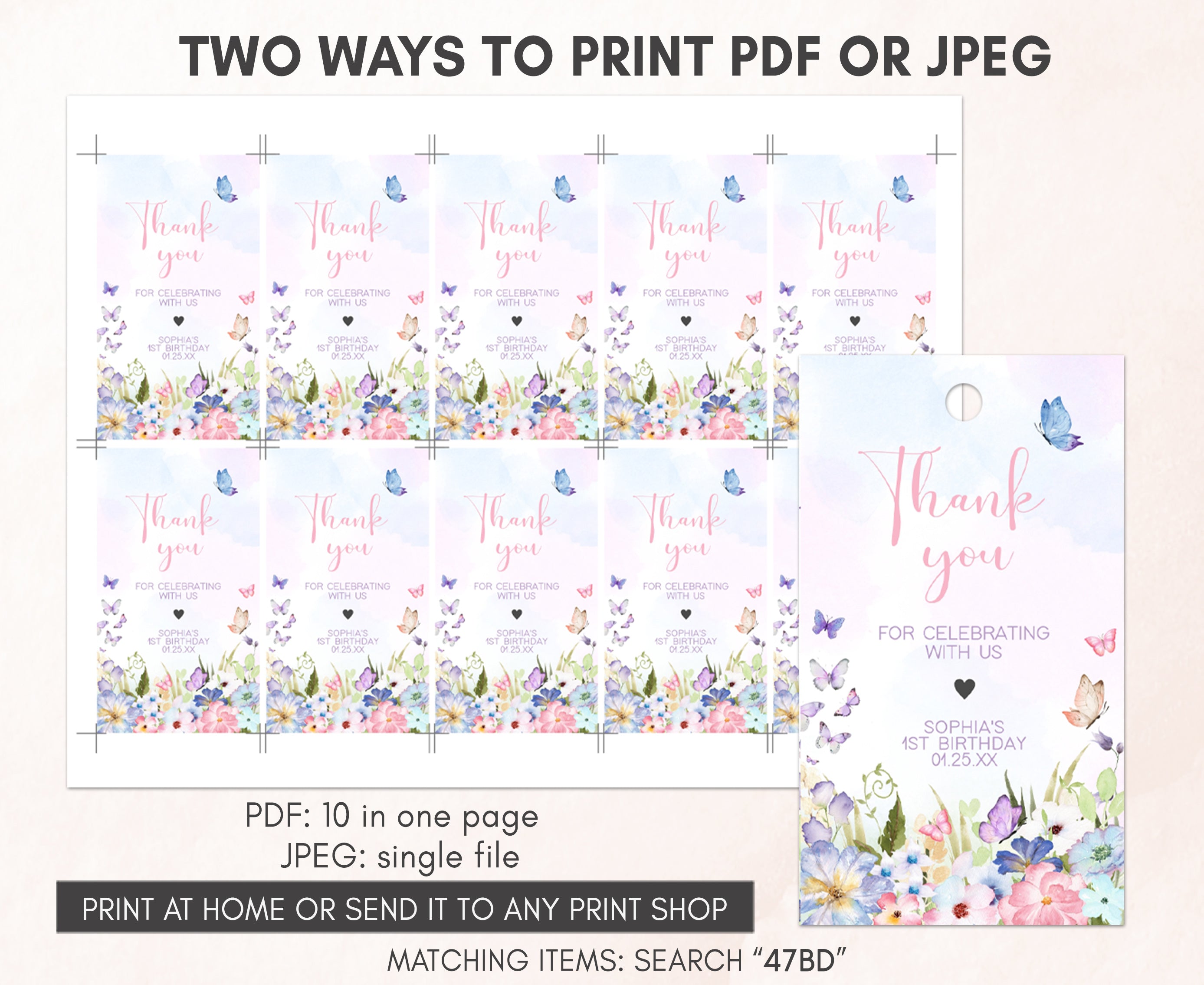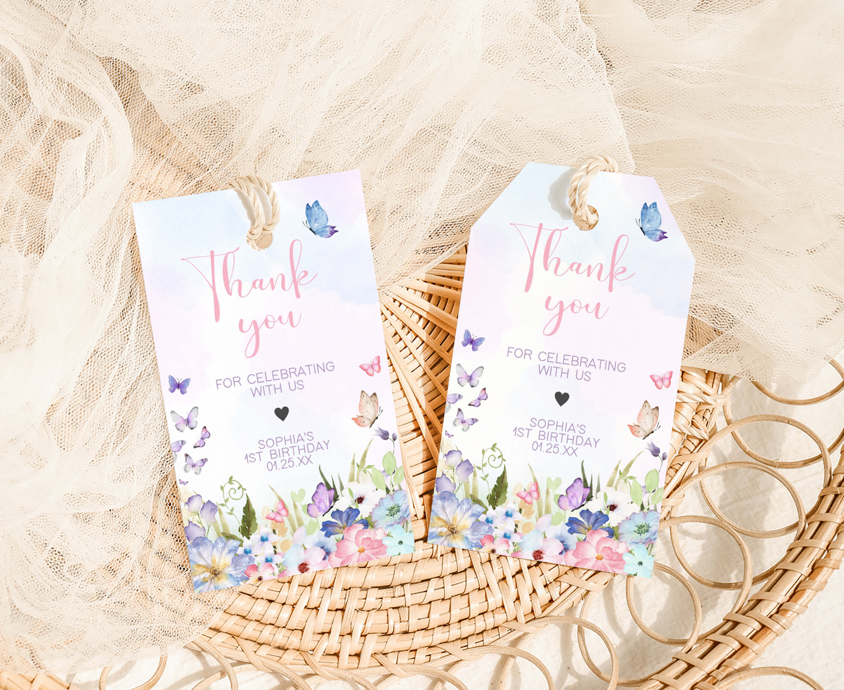 Amplify the charm of your Little Butterfly Birthday Party favors by adding a personal touch with our delightful Spring Butterfly First Birthday Gift Tags. These Pastel Butterflies Thank you Tags are the perfect way to express your gratitude to your guests in a special and heartfelt manner.