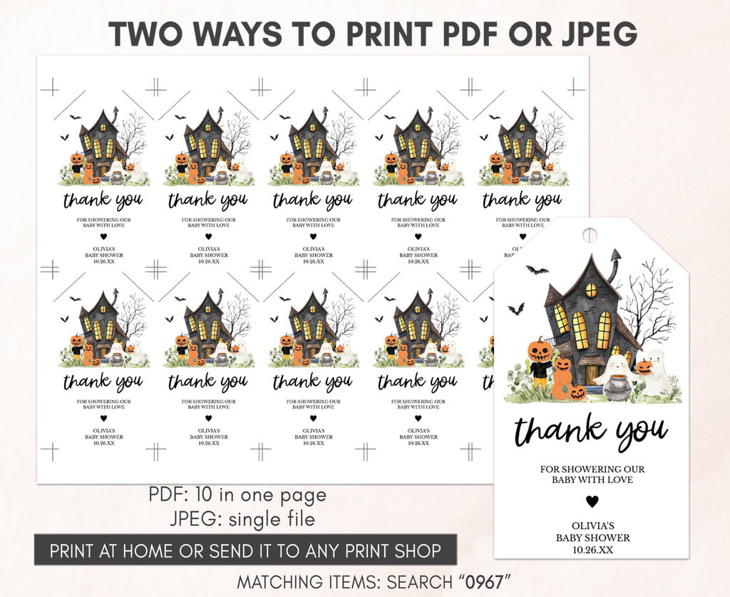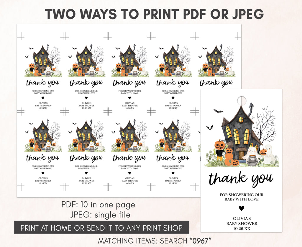 Amplify the charm of your Pumpkin Halloween Baby Shower party favors by adding a personal touch with our delightful Spooky Halloween Ghost Baby Shower Gift Tags. These Halloween Haunted House Thank you Tags are the perfect way to express your gratitude to your guests in a special and heartfelt manner.