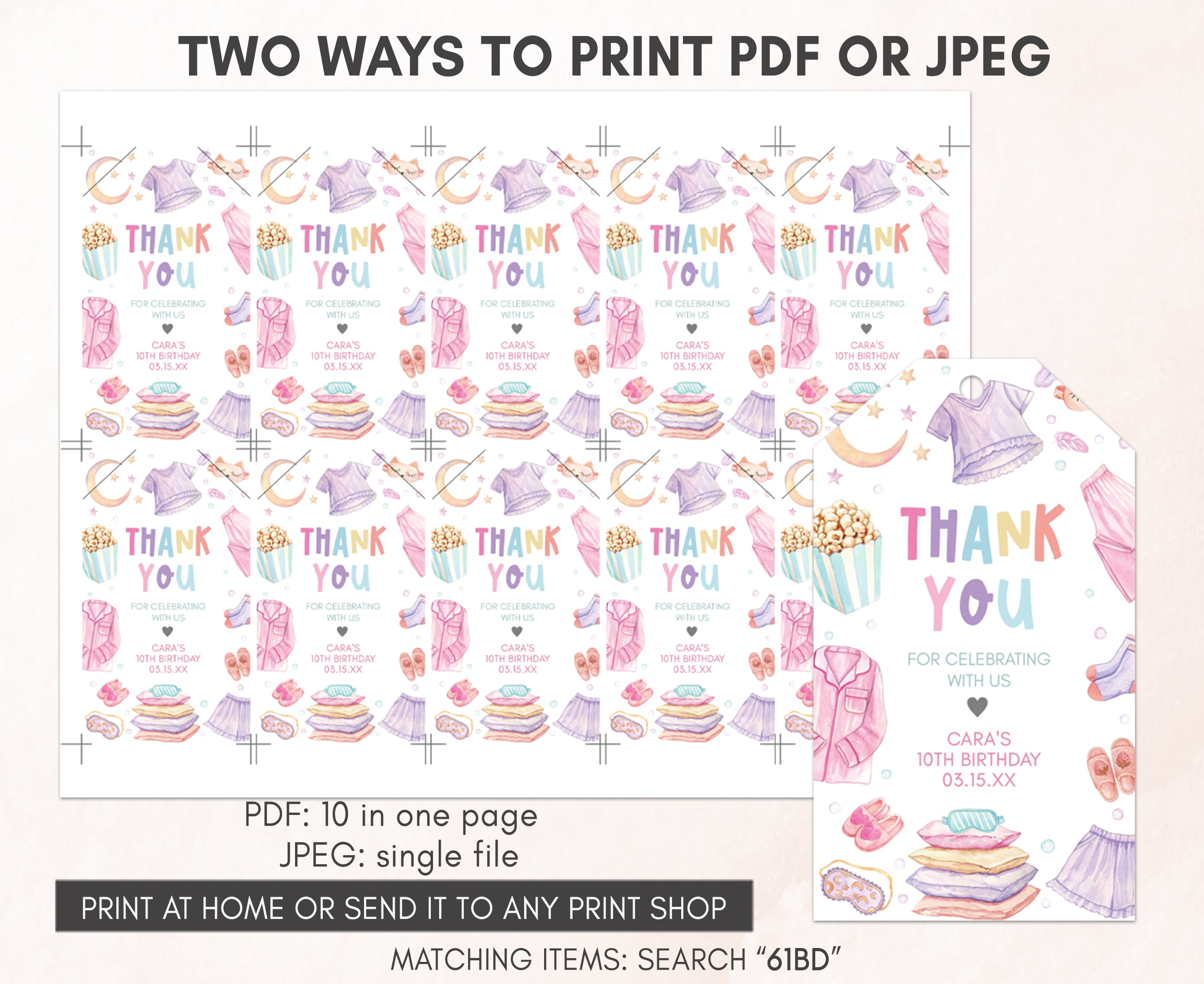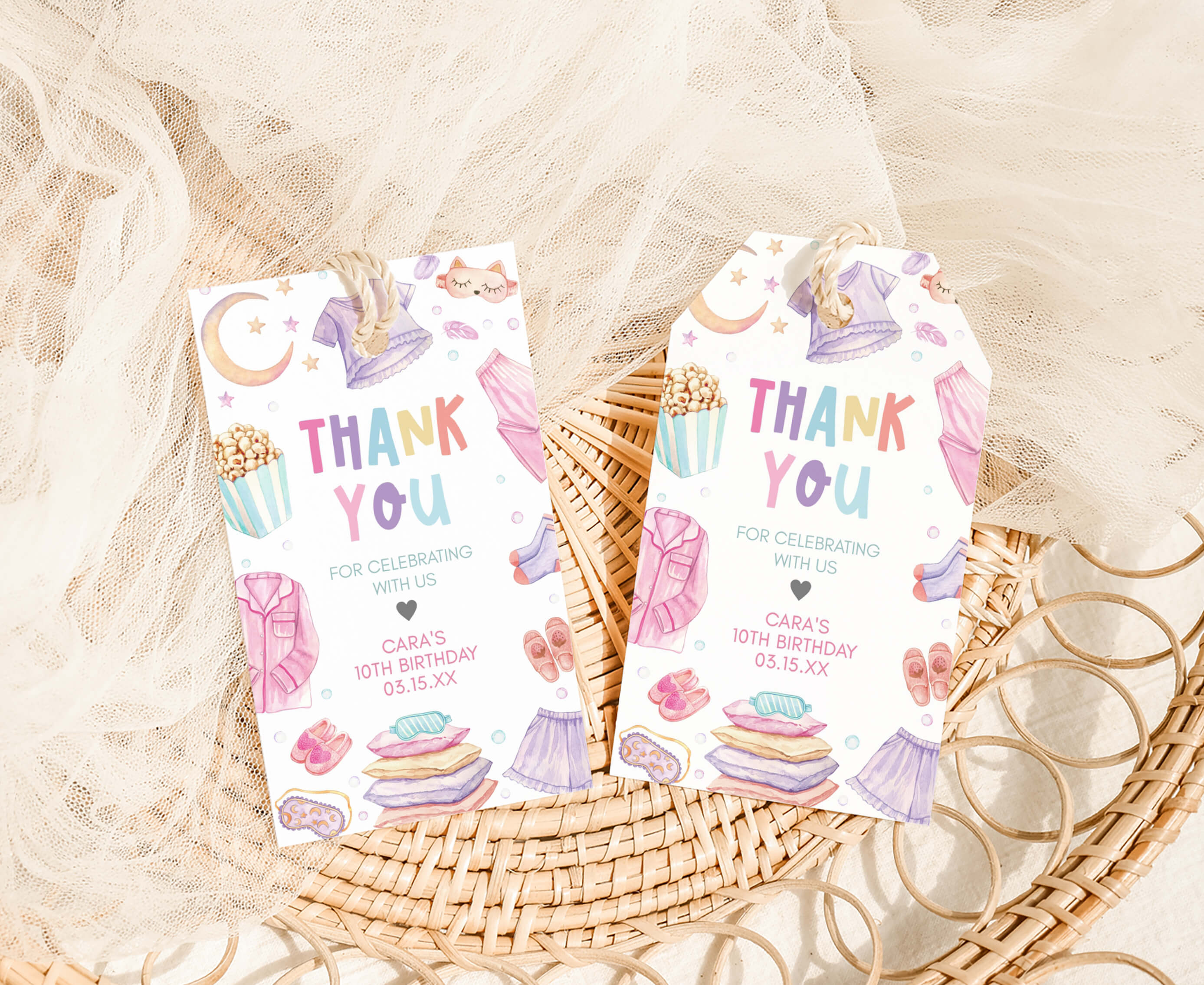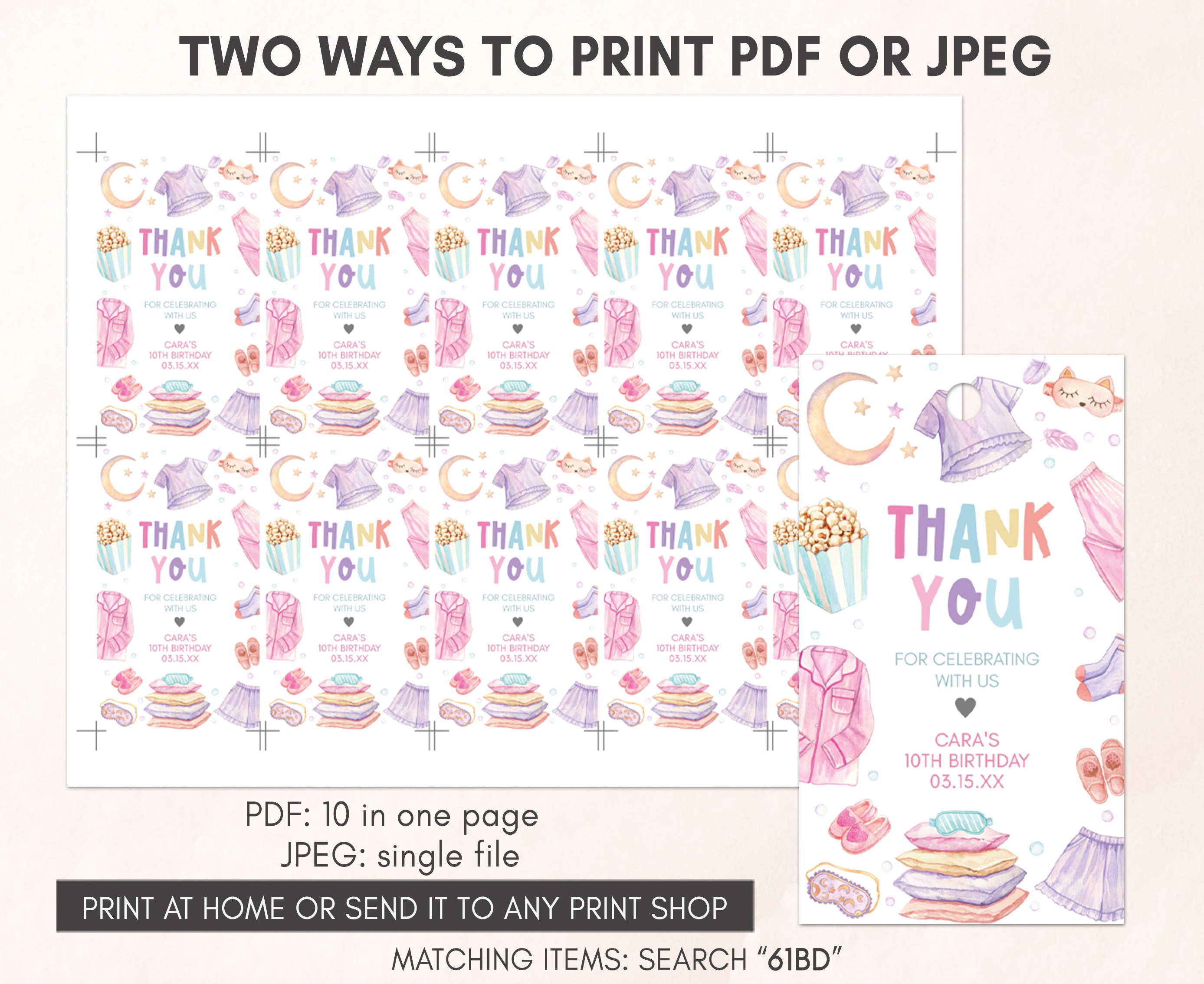 Amplify the charm of your Slumber Birthday Party favors by adding a personal touch with our delightful Pajama Sleepover Birthday Gift Tags. These Popcorn Slumber Party Thank you Tags are the perfect way to express your gratitude to your guests in a special and heartfelt manner.