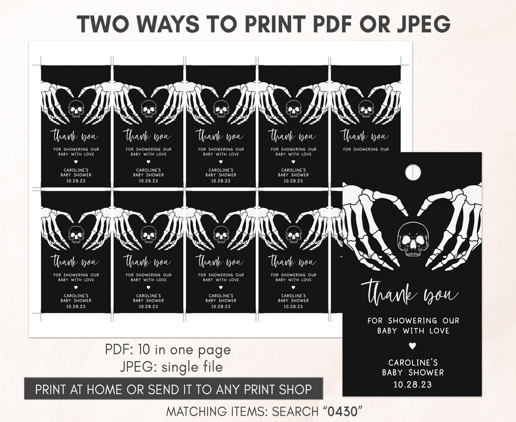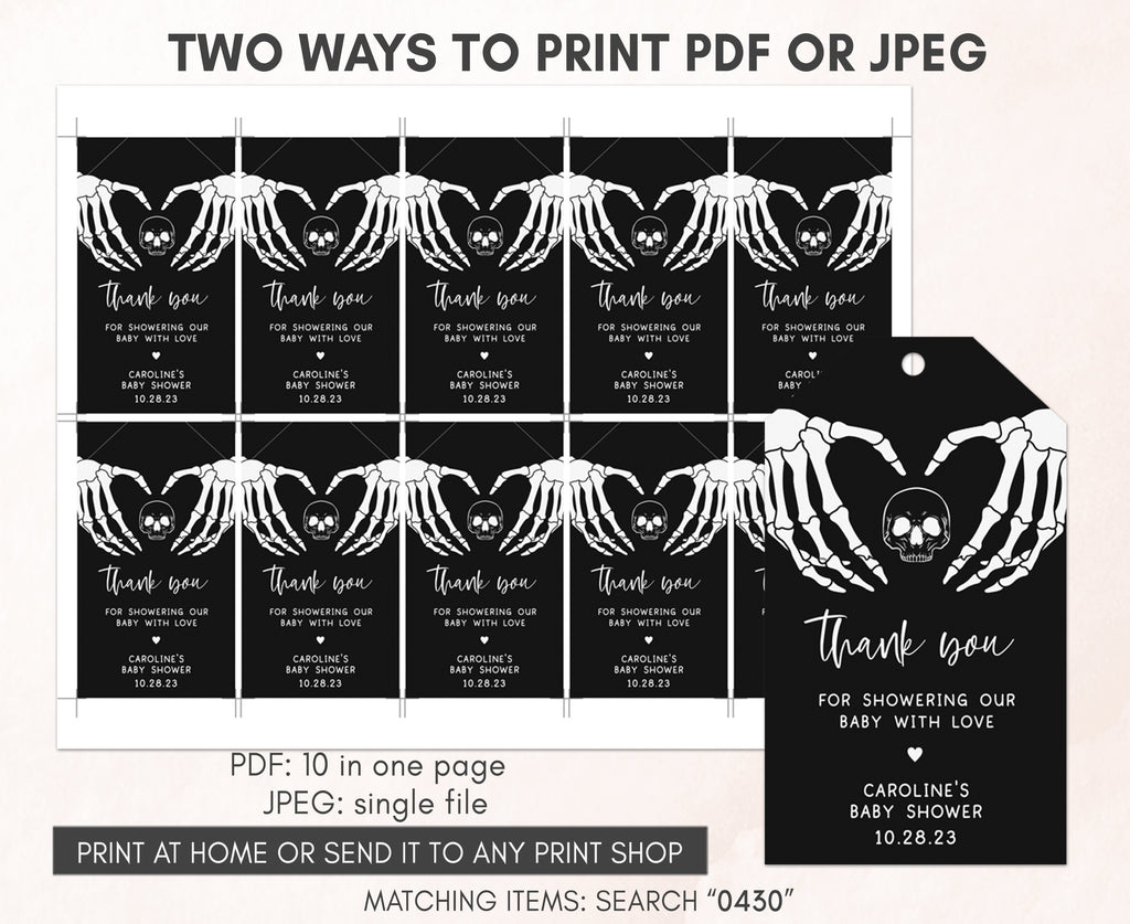 Amplify the charm of your Spooky Halloween Baby Shower party favors by adding a personal touch with our delightful A Little Boo is Almost Due Baby Shower Gift Tags. These Halloween Skeleton Hands Thank you Tags are the perfect way to express your gratitude to your guests in a special and heartfelt manner.