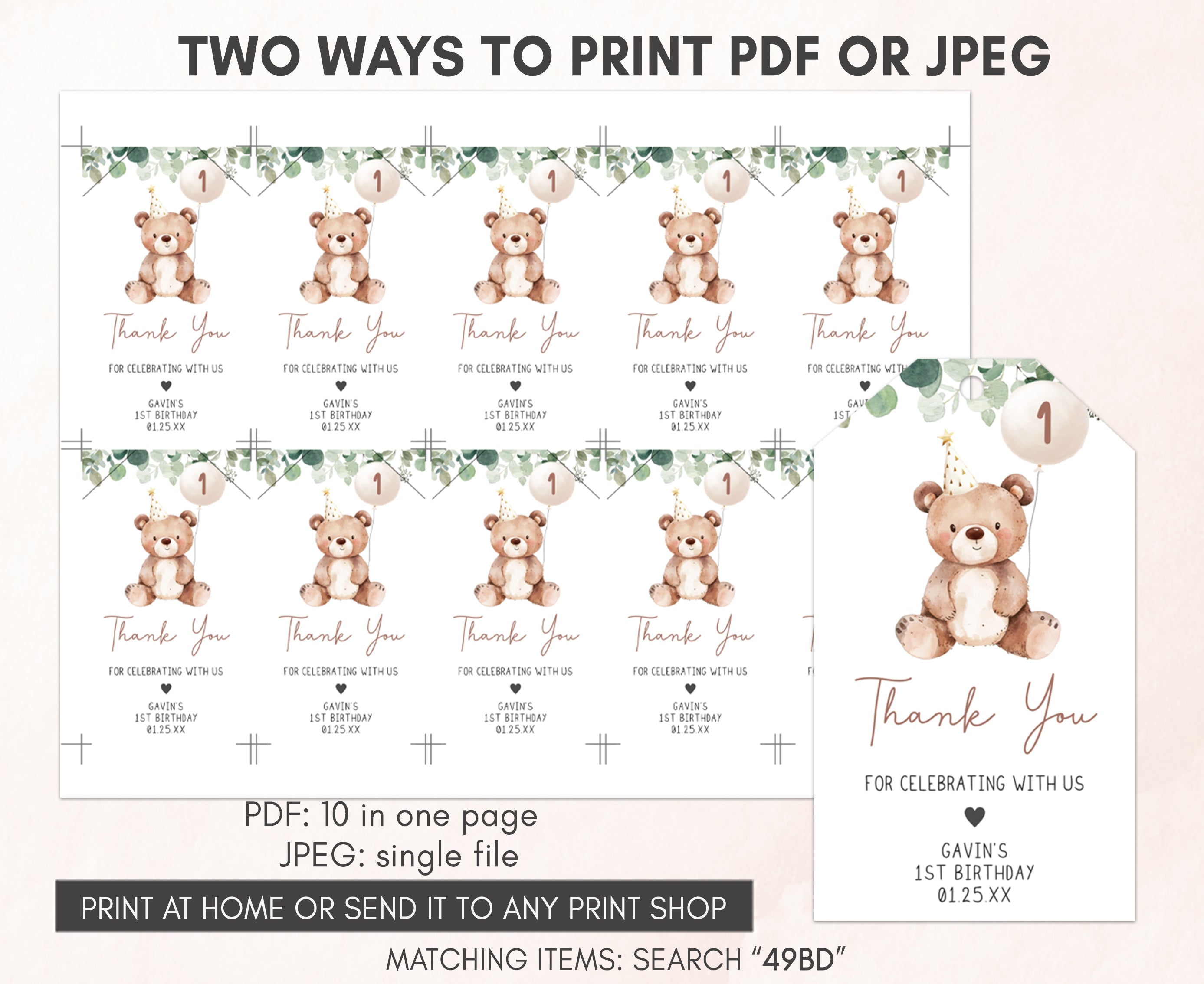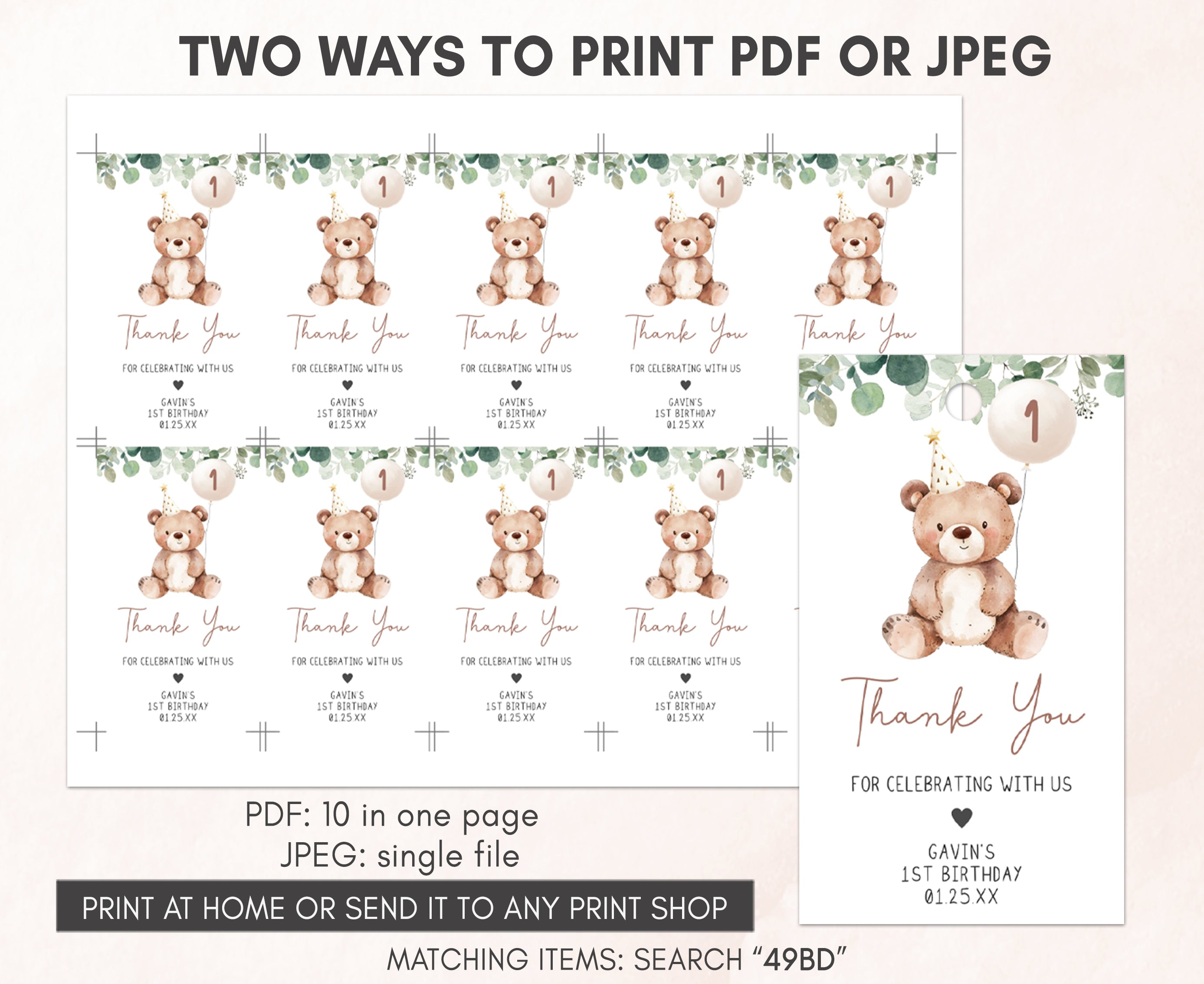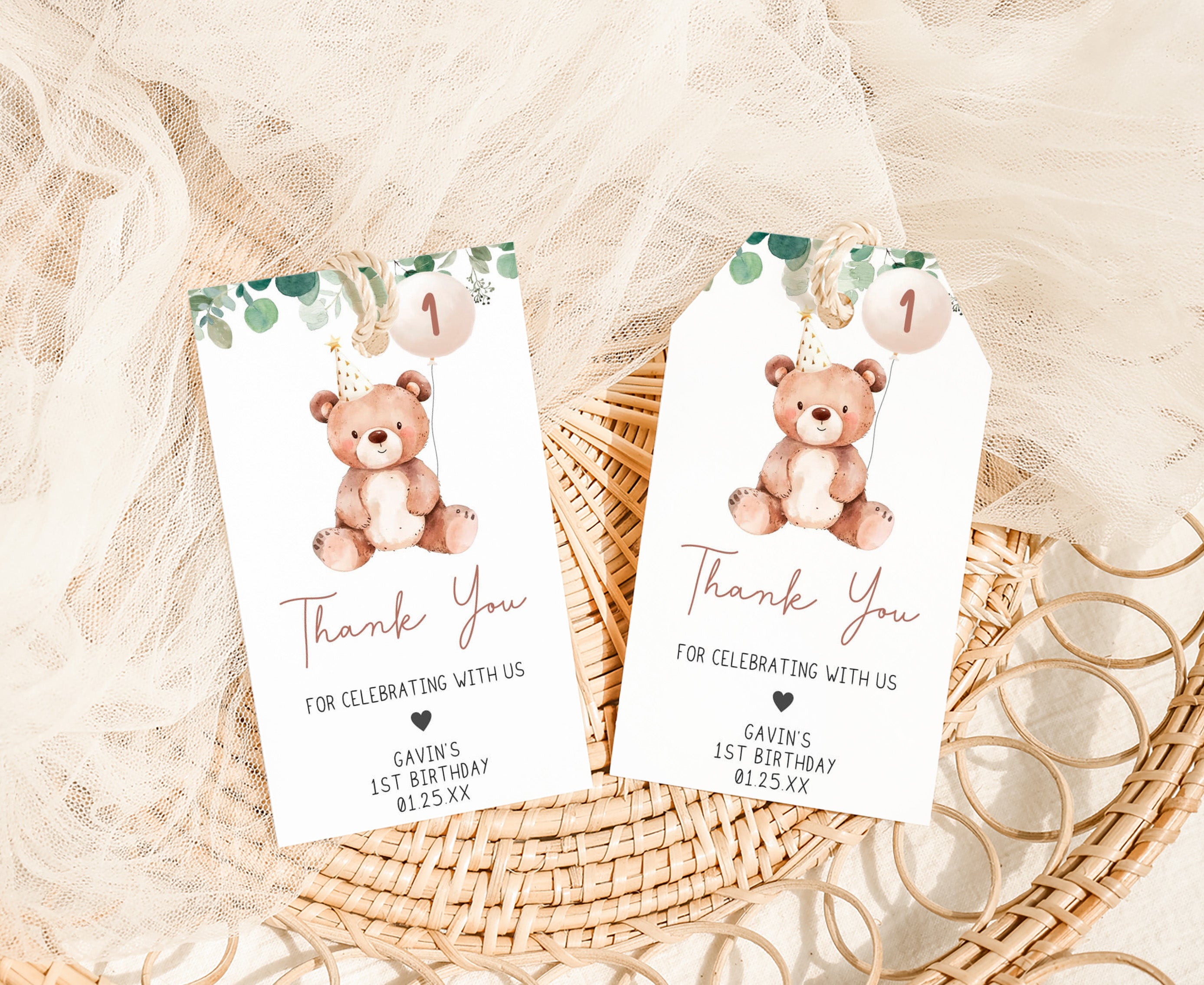 Amplify the charm of your Beary First Birthday Party favors by adding a personal touch with our delightful Woodland Bear Birthday Gift Tags. These Greenery Teddy Bear Thank you Tags are the perfect way to express your gratitude to your guests in a special and heartfelt manner.