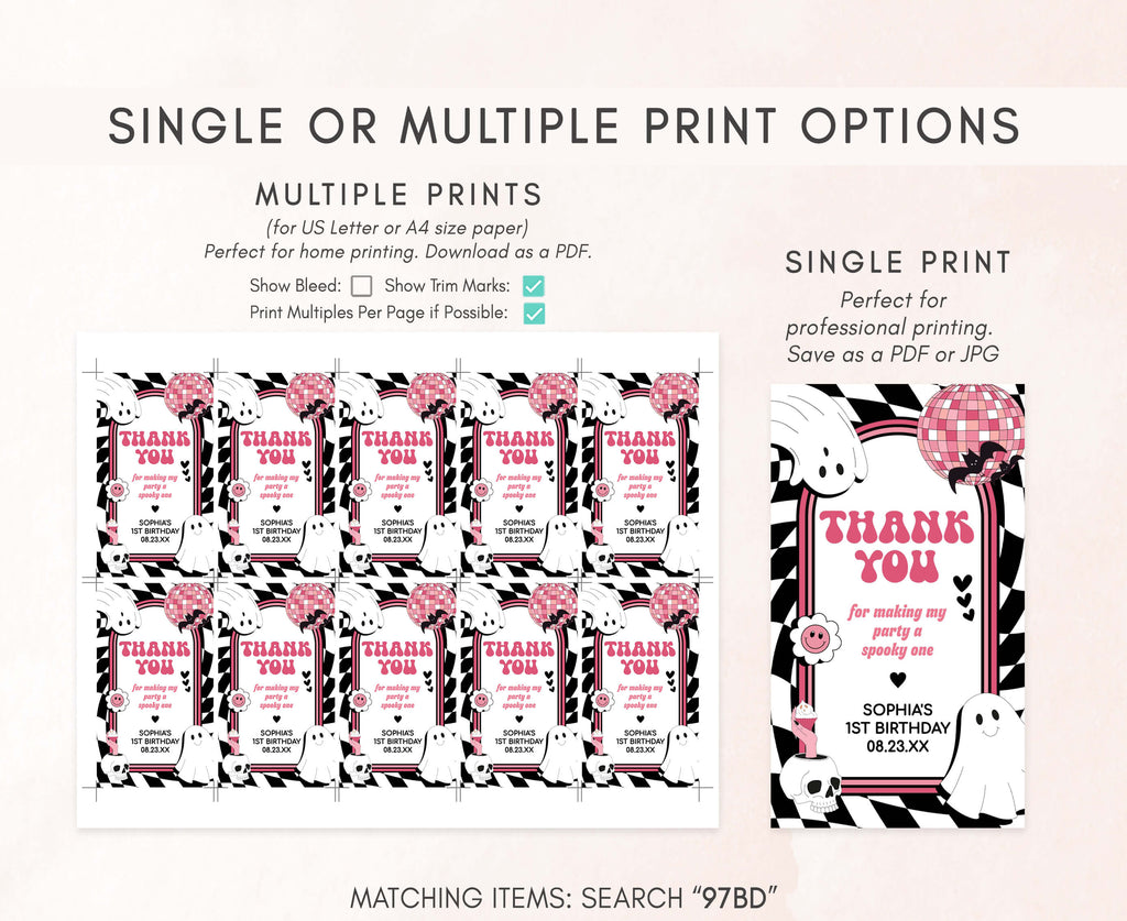 Amplify the charm of your Girl Halloween Birthday Party favors by adding a personal touch with our delightful Retro Spooky Halloween Birthday Gift Tags. These Pink Ghost Disco Thank you Tags are the perfect way to express your gratitude to your guests in a special and heartfelt manner.