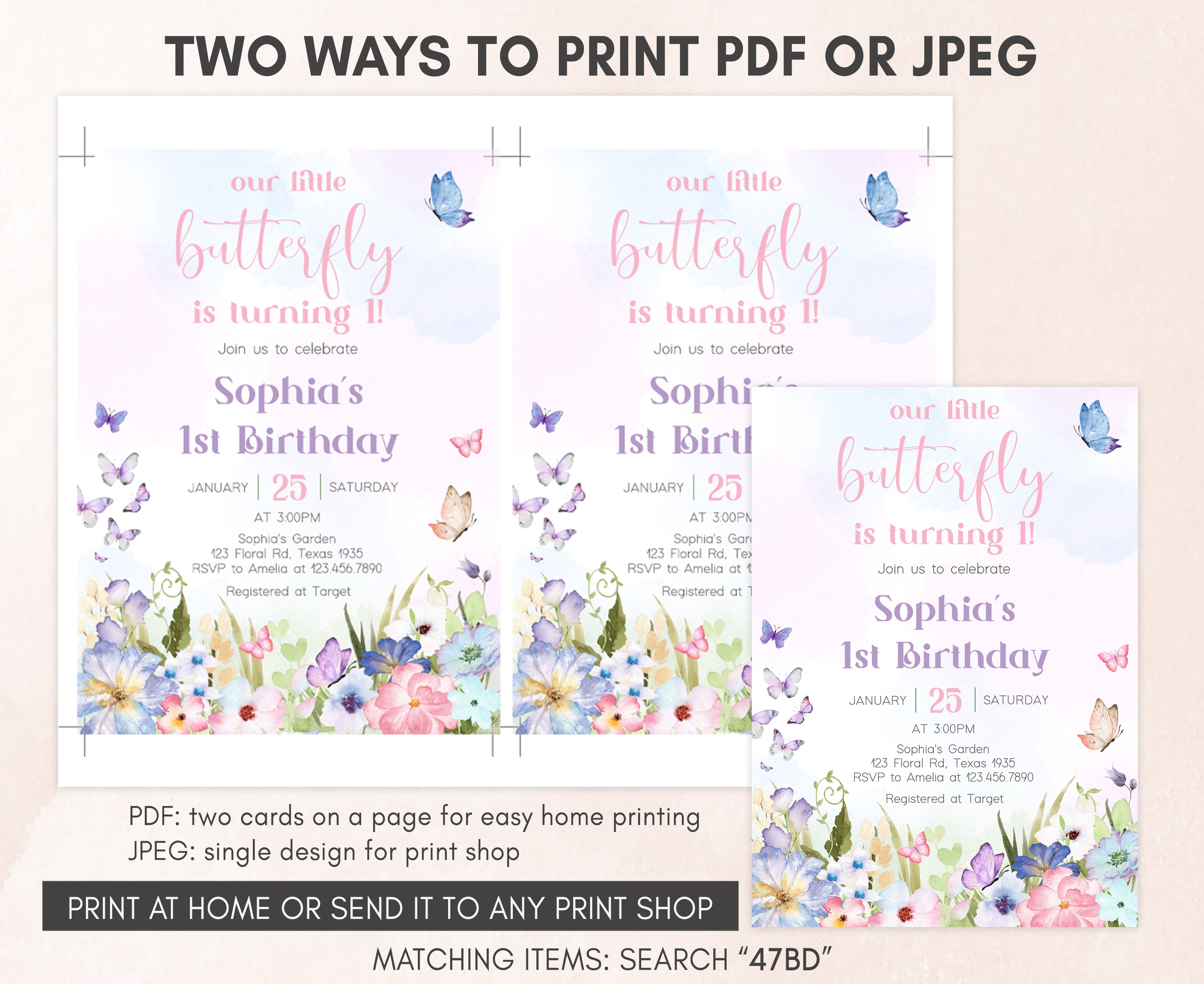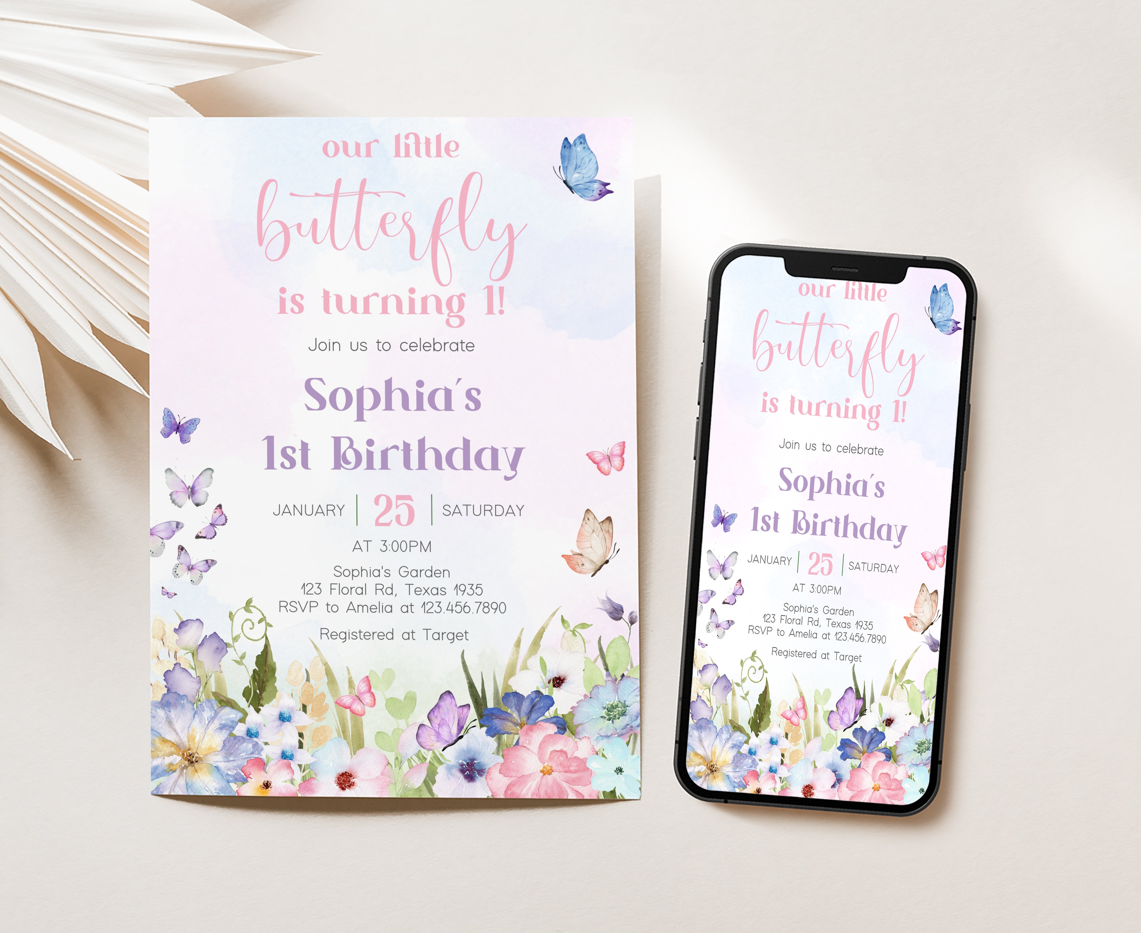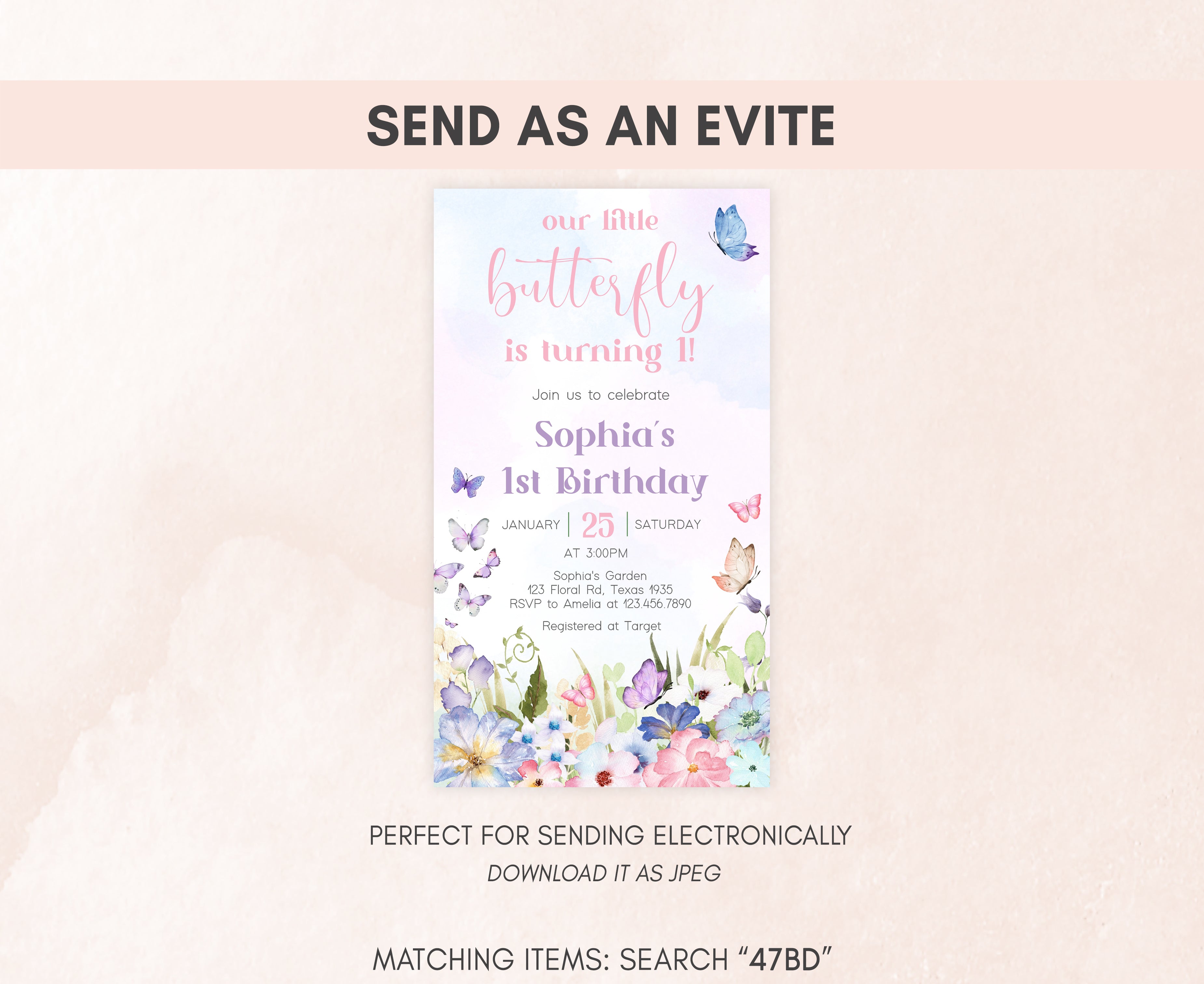 Celebrate with your guests at your Floral Garden Birthday Party using our delightful Spring Butterfly First Birthday Invitation. This Pastel Butterflies Birthday Invite is the ideal choice to tone for a Spring-themed celebration.