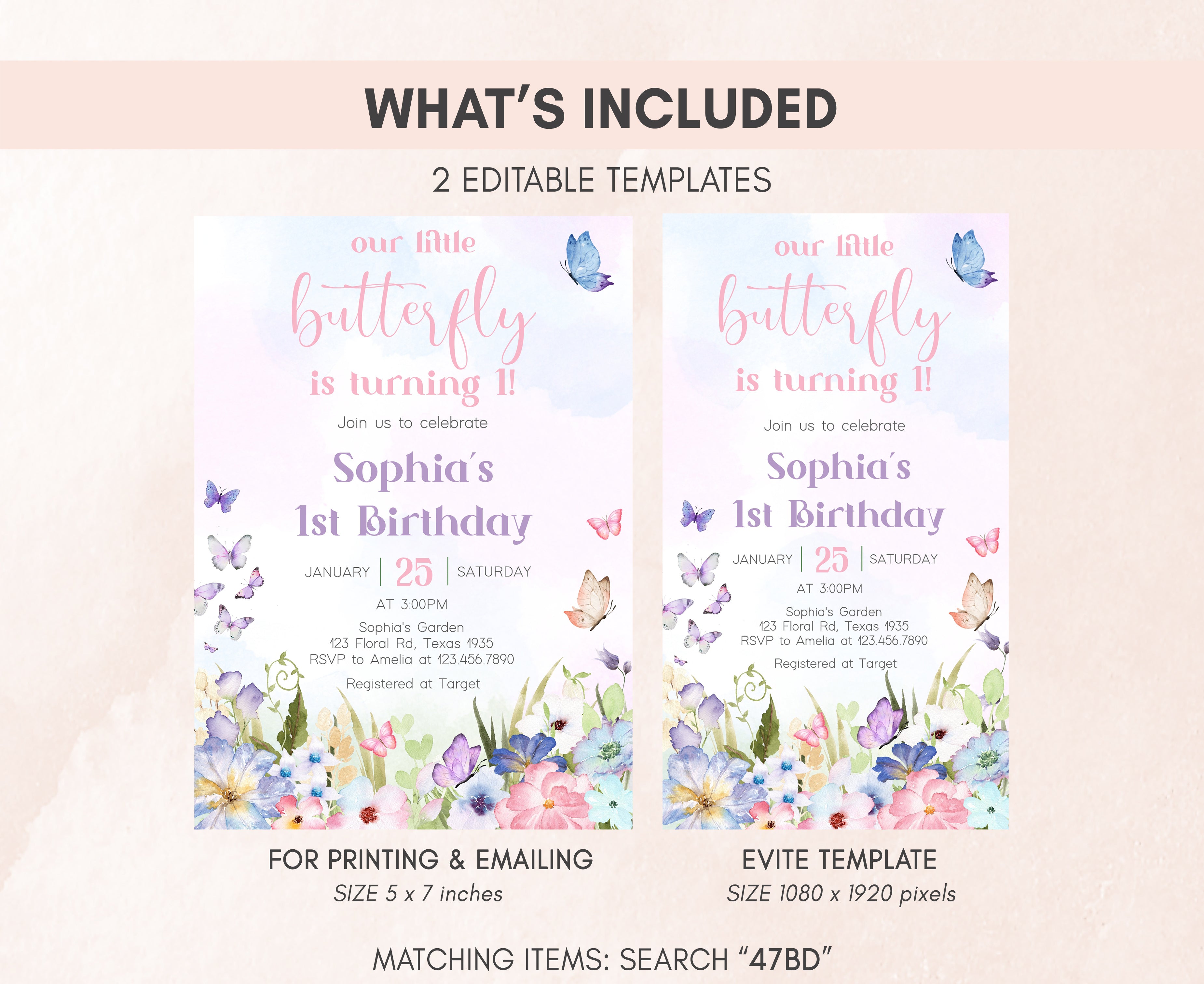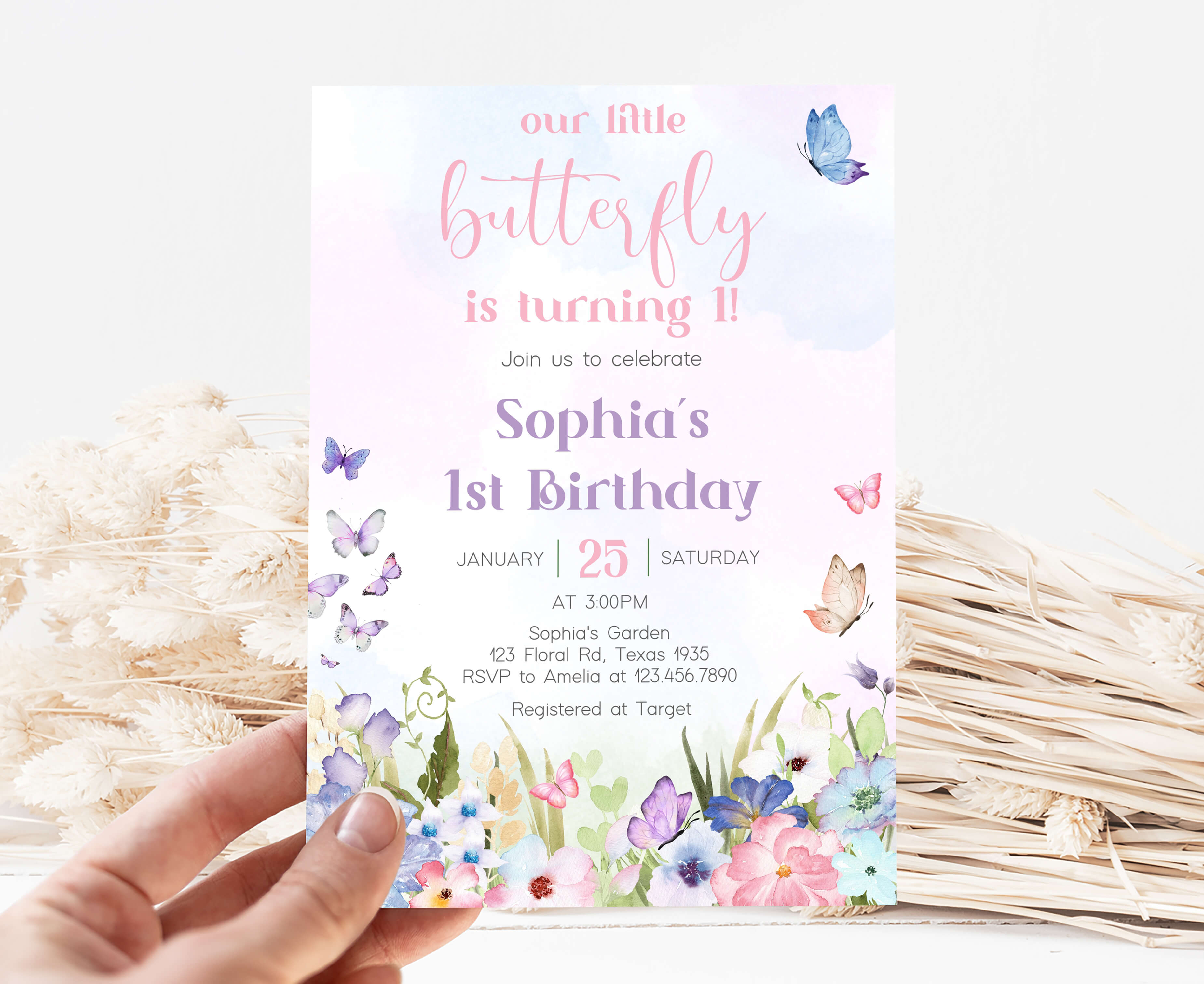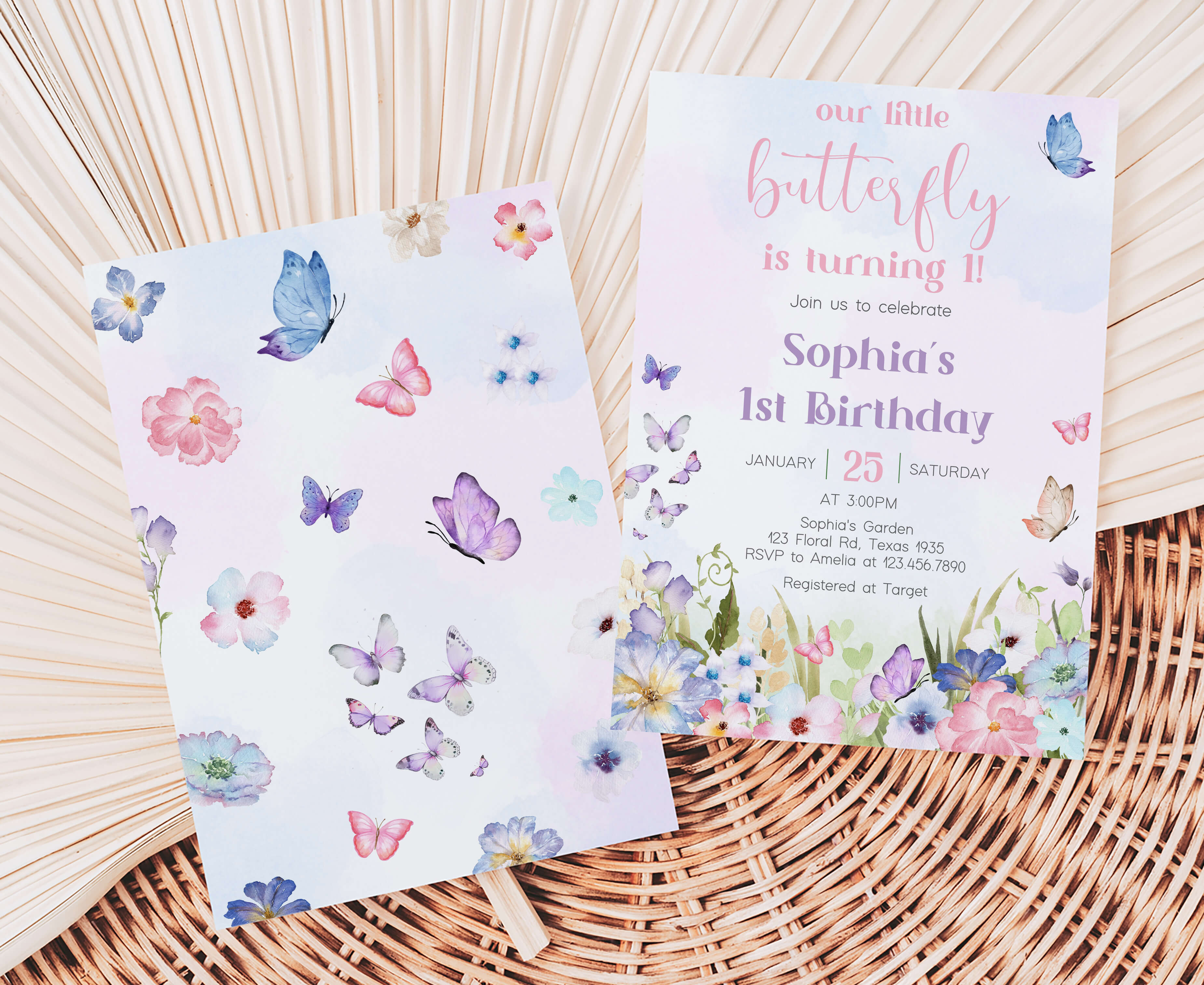 Celebrate with your guests at your Floral Garden Birthday Party using our delightful Spring Butterfly First Birthday Invitation. This Pastel Butterflies Birthday Invite is the ideal choice to tone for a Spring-themed celebration.