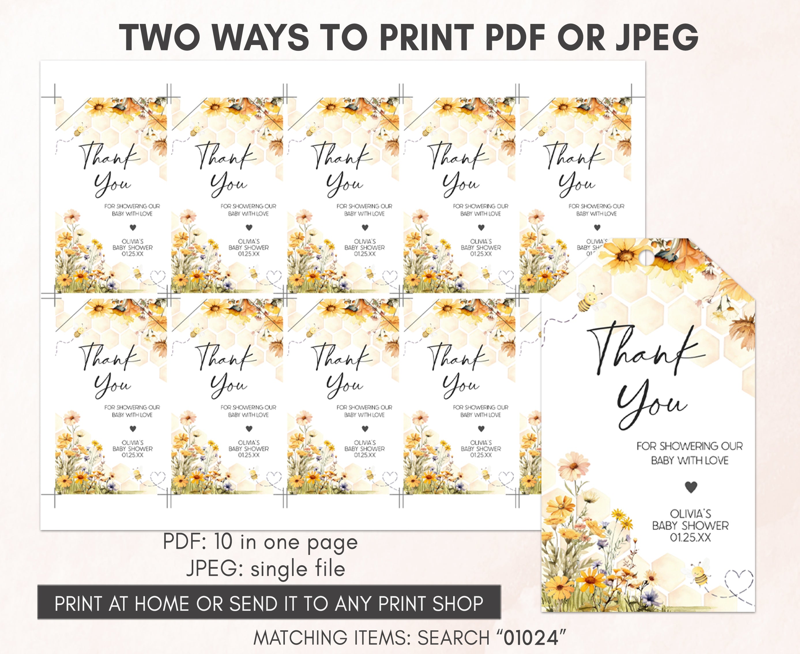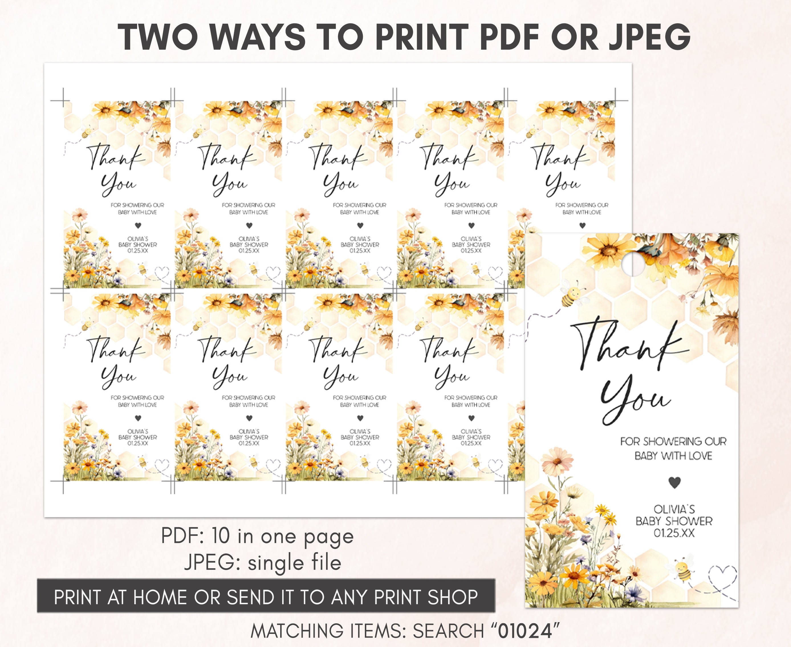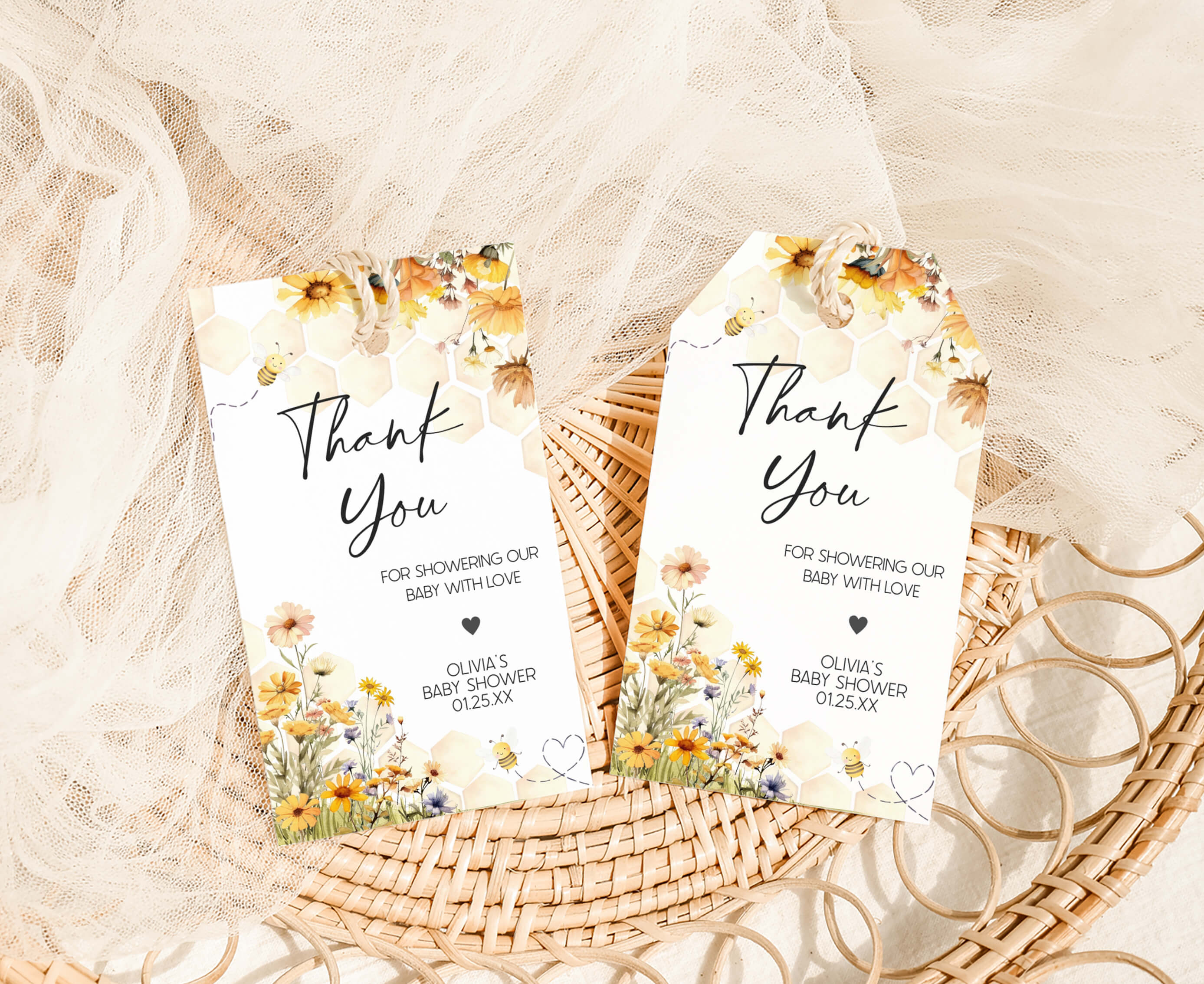Amplify the charm of your Floral Bee Baby Shower party favors by adding a personal touch with our delightful Spring Honey Bee Baby Shower Gift Tags. These Gender Neutral Honeycomb Thank you Tags are the perfect way to express your gratitude to your guests in a special and heartfelt manner.