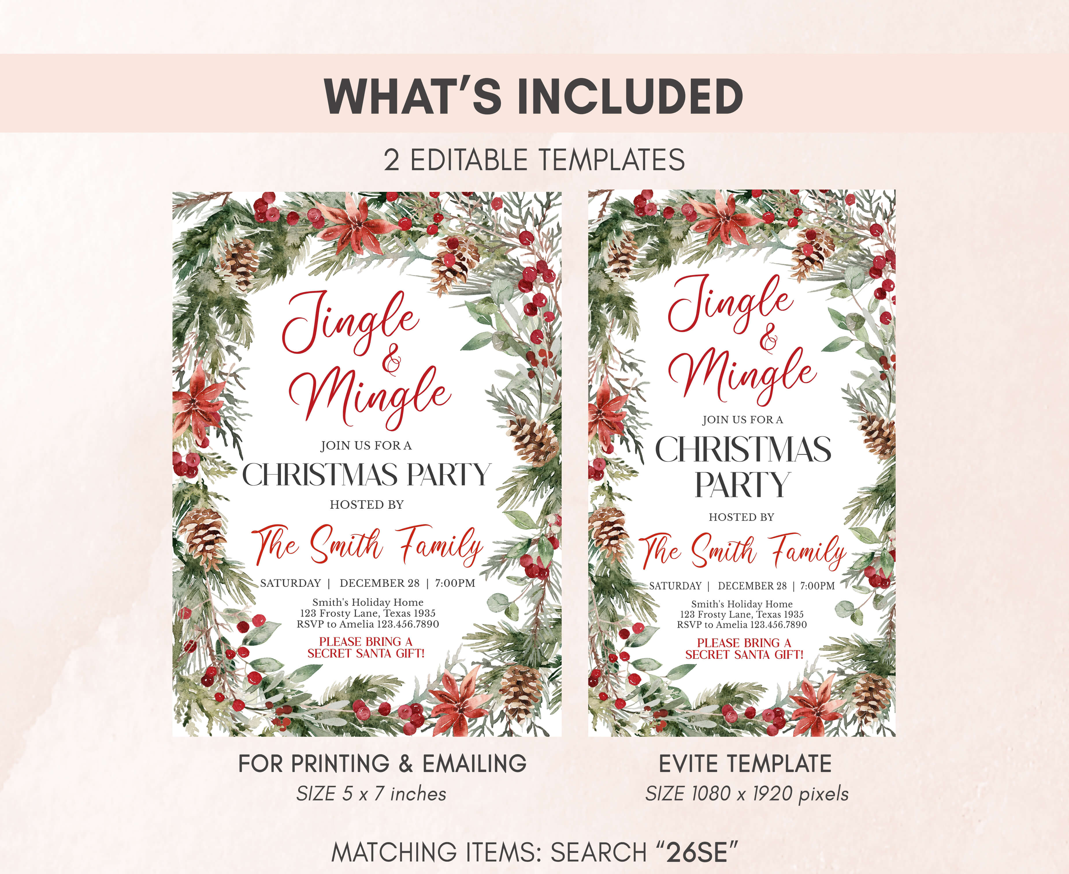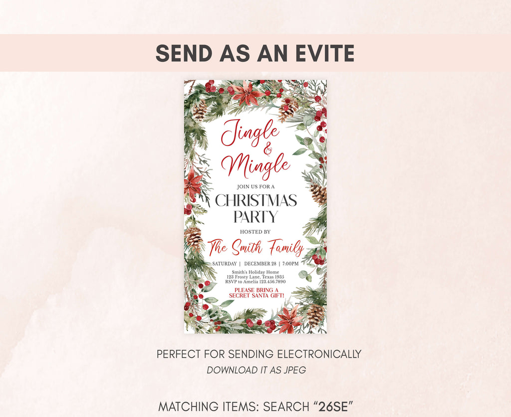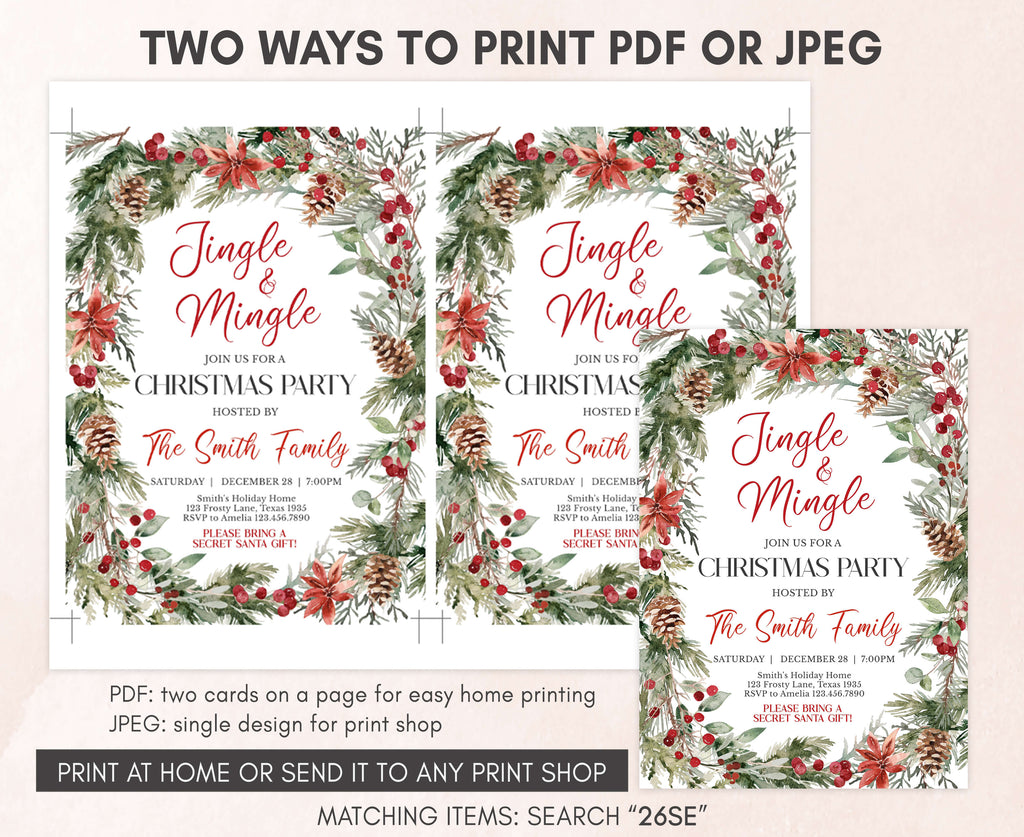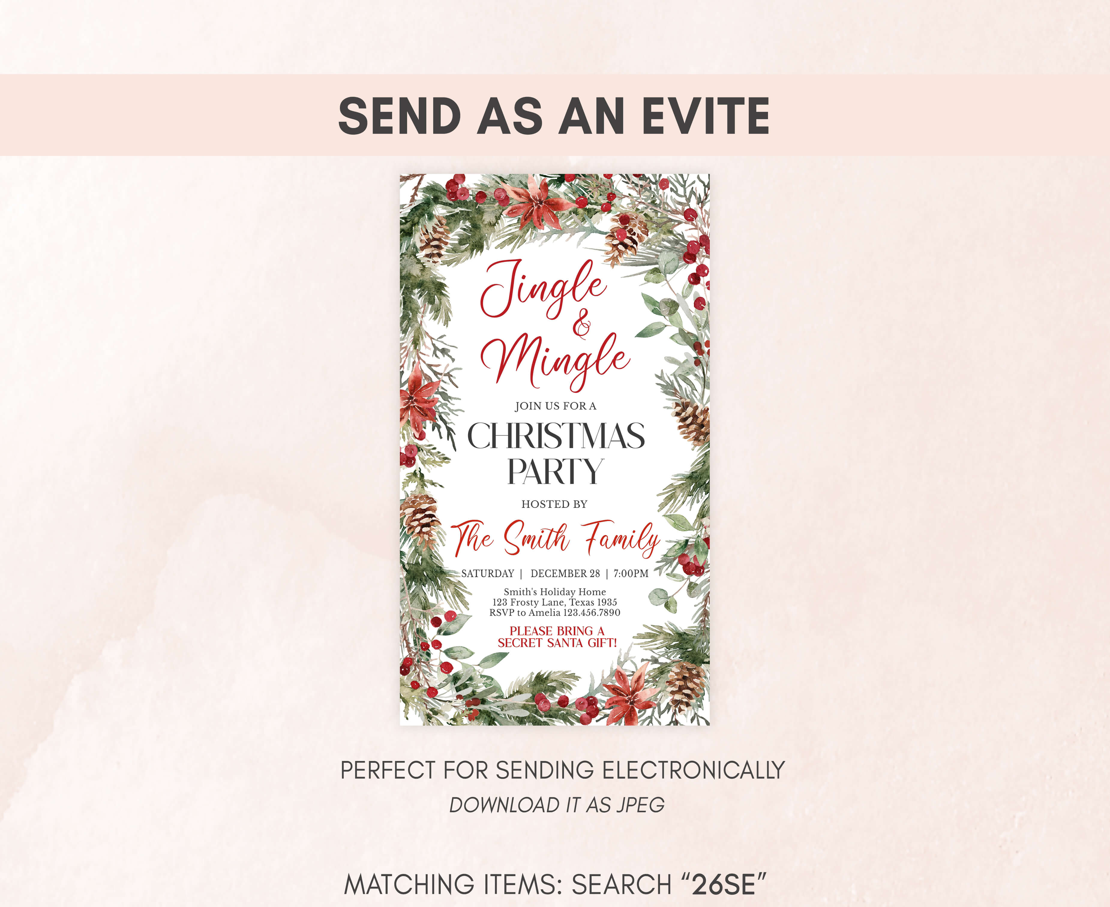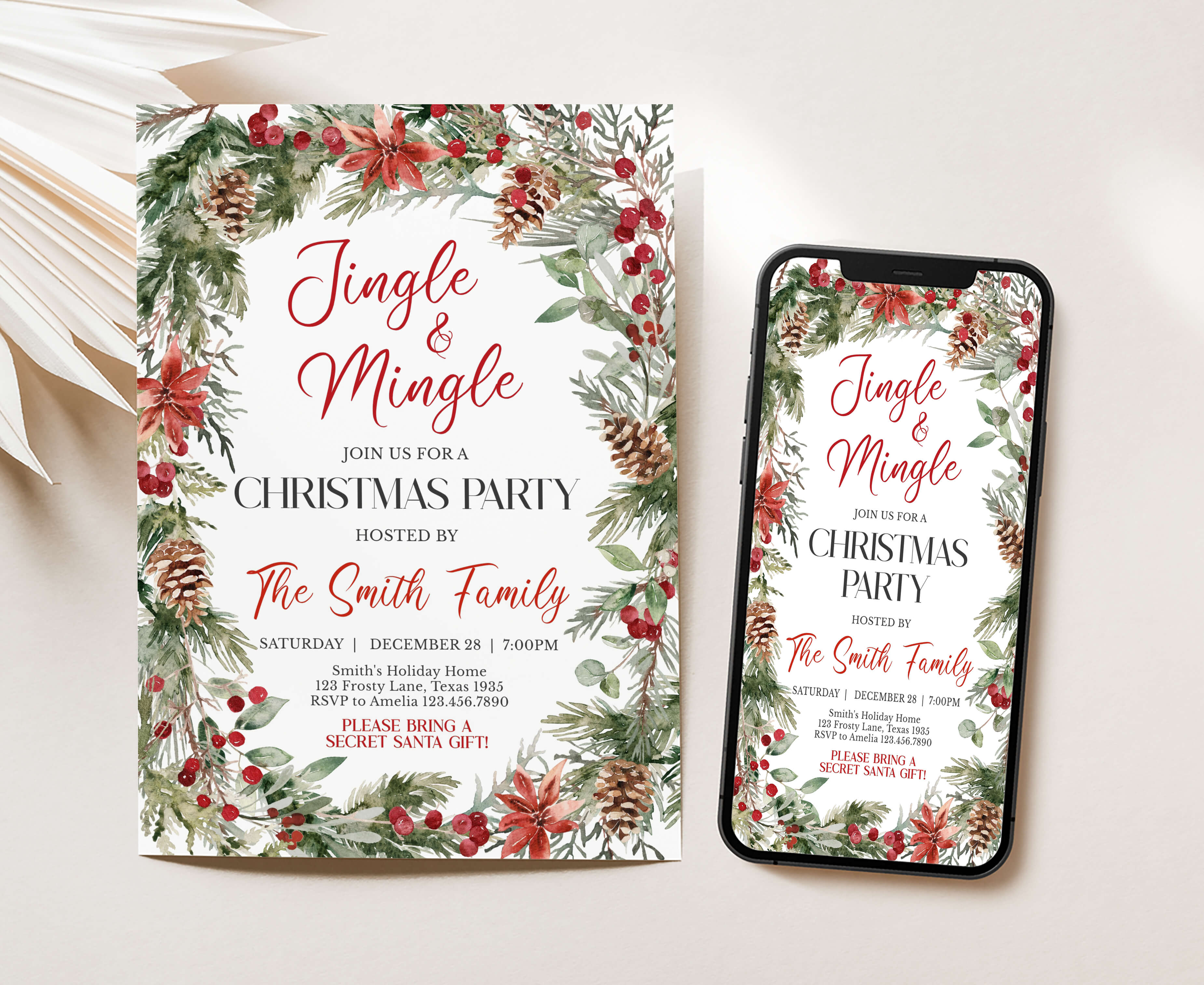 Celebrate with your guests at your Jingle and Mingle Party using our delightful Christmas Pinecone Invitation. This Festive Holiday Wreath Invite is the ideal choice to tone for a Christmas-themed celebration.