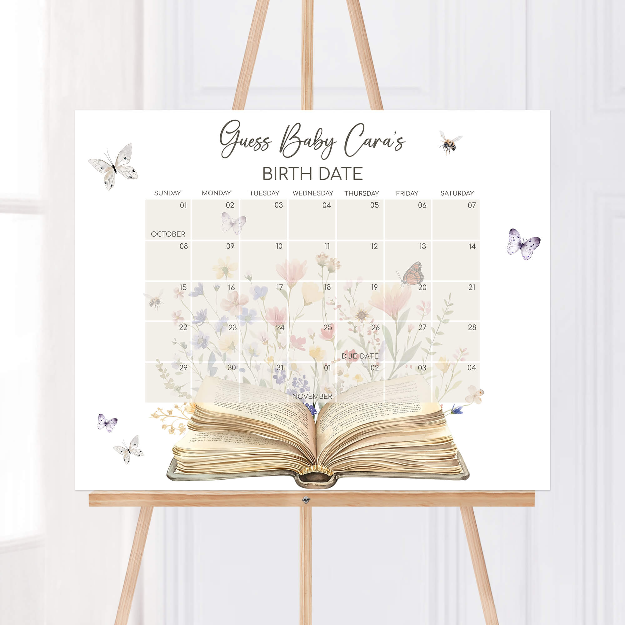 Partake in the excitement of your Spring Flowers Baby Shower Party with our Floral Storybook Due Date Game! Embrace the adorable spirit of the Butterfly Spring Book Baby Shower party as guests make their predictions for the due date, coming together to share in the anticipation of the upcoming arrival. Complete the joy and fun with this Spring Baby Shower Birthday Predictions.