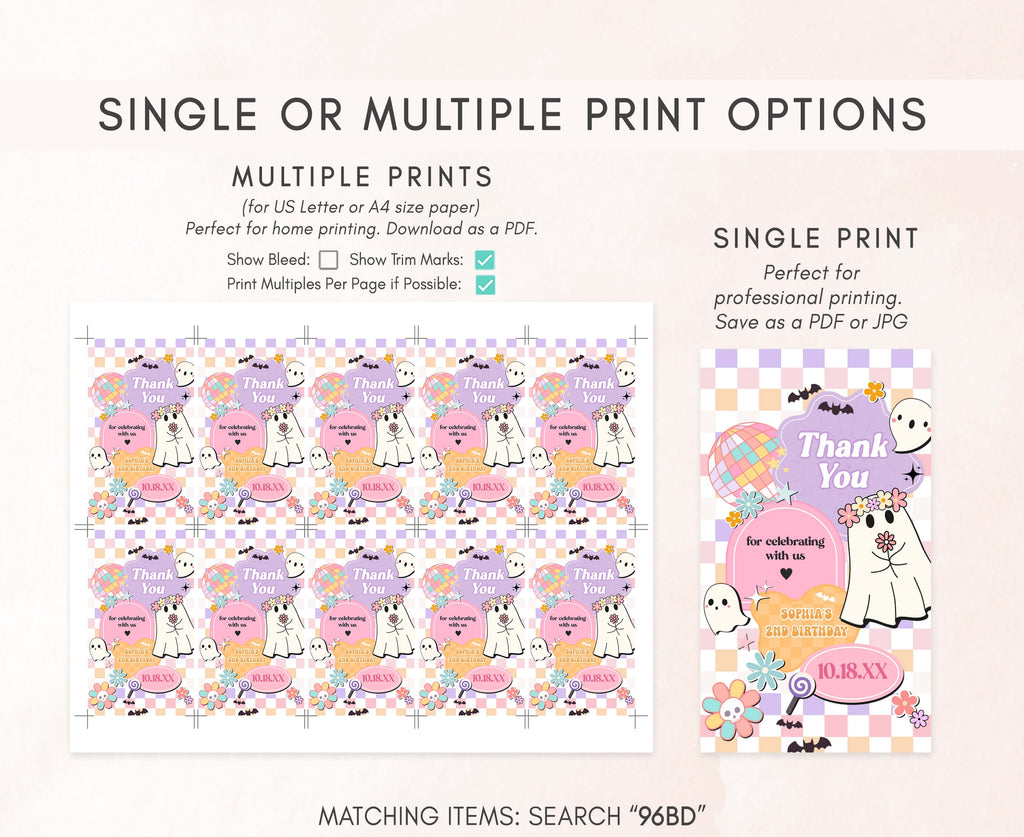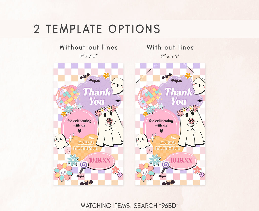 Amplify the charm of your Pastel Halloween Birthday Party favors by adding a personal touch with our delightful Cute Ghost Birthday Gift Tags. These Halloween Disco Thank you Tags are the perfect way to express your gratitude to your guests in a special and heartfelt manner.