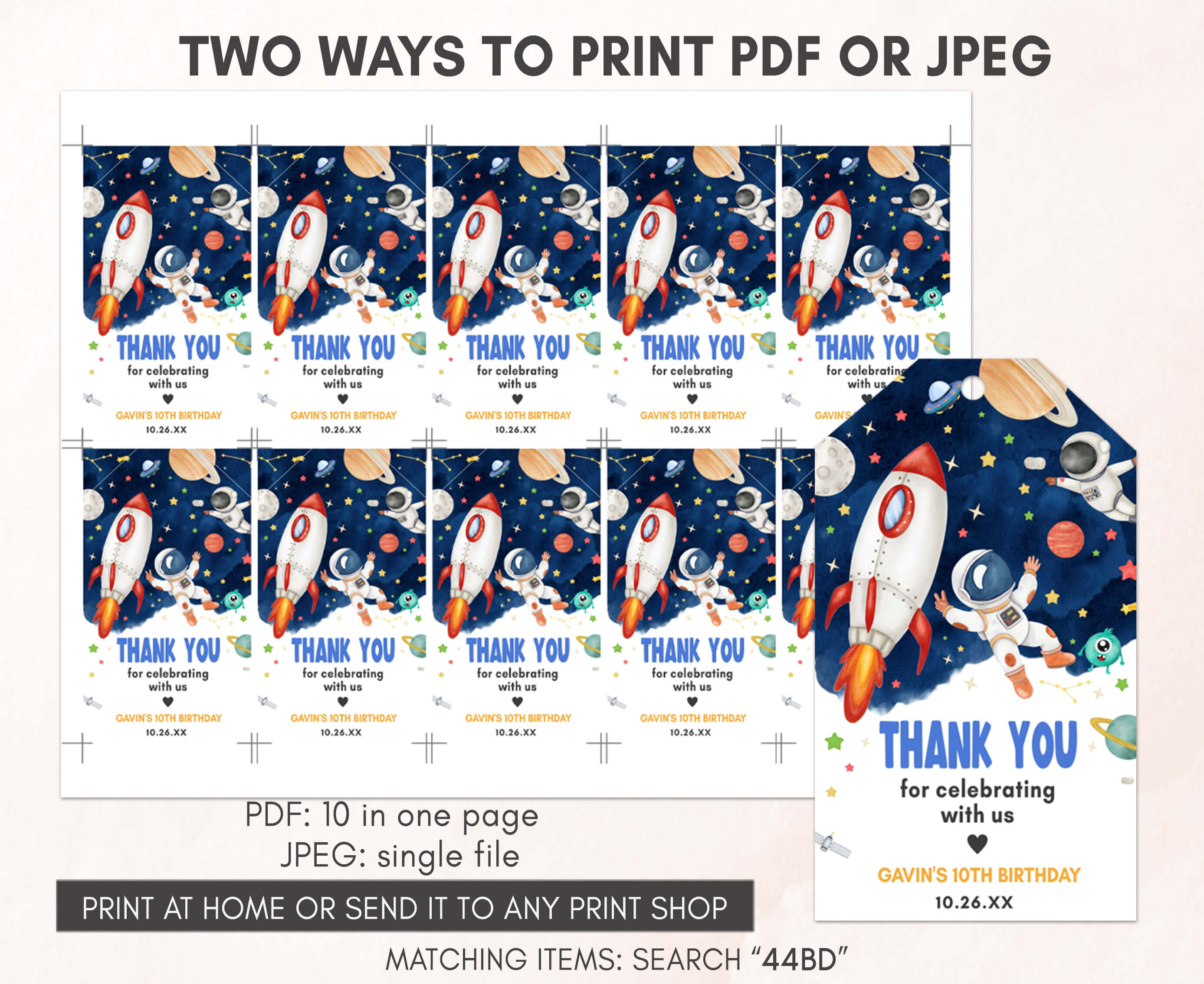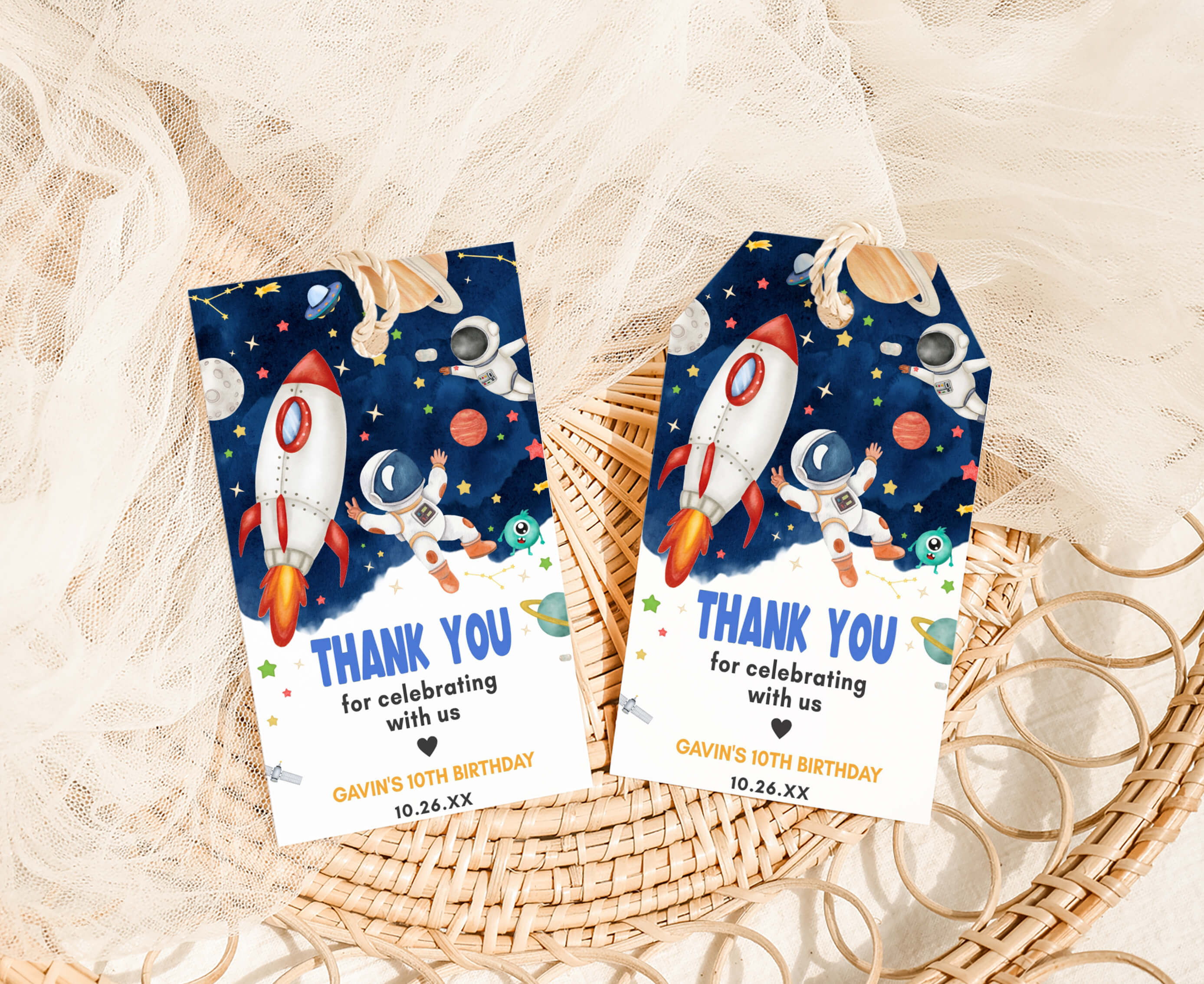 Amplify the charm of your Blast Off Birthday Party favors by adding a personal touch with our delightful Galaxy Astronaut Birthday Gift Tags. These Rocket Ship Thank you Tags are the perfect way to express your gratitude to your guests in a special and heartfelt manner.