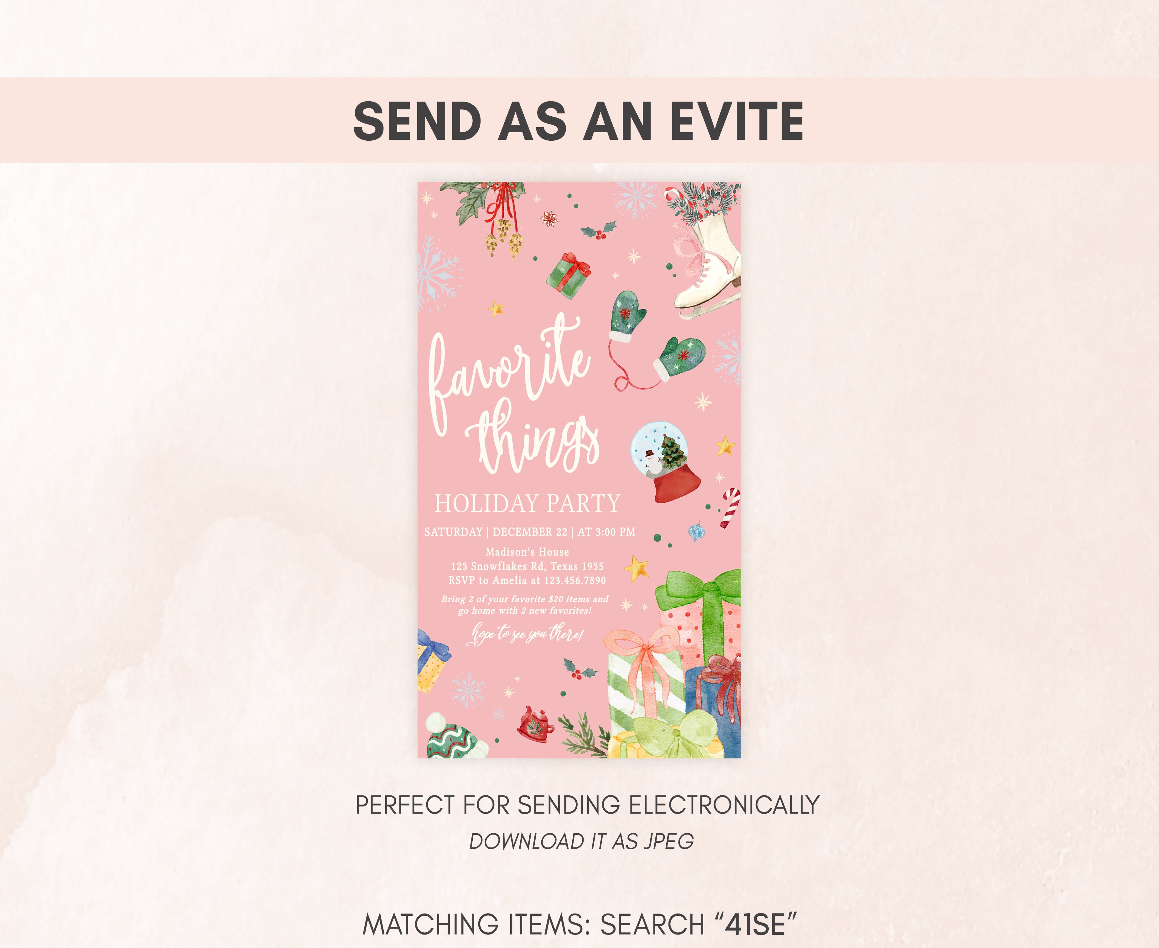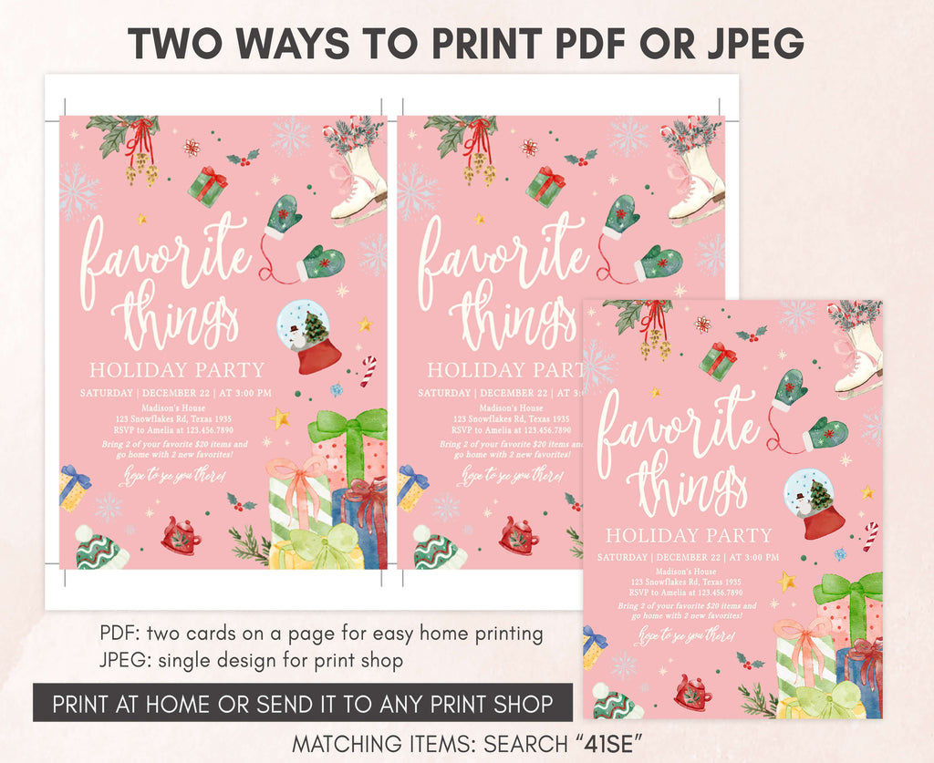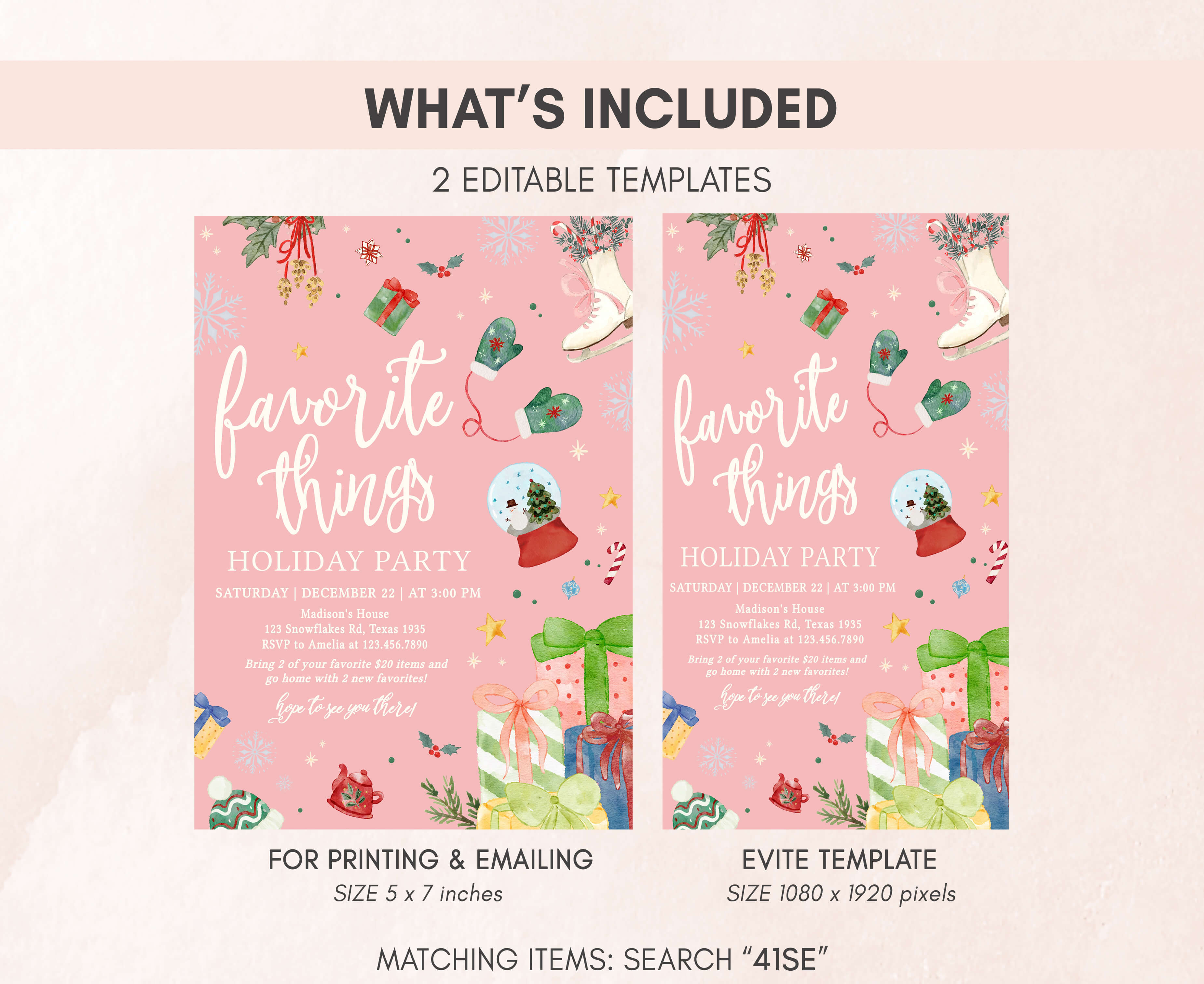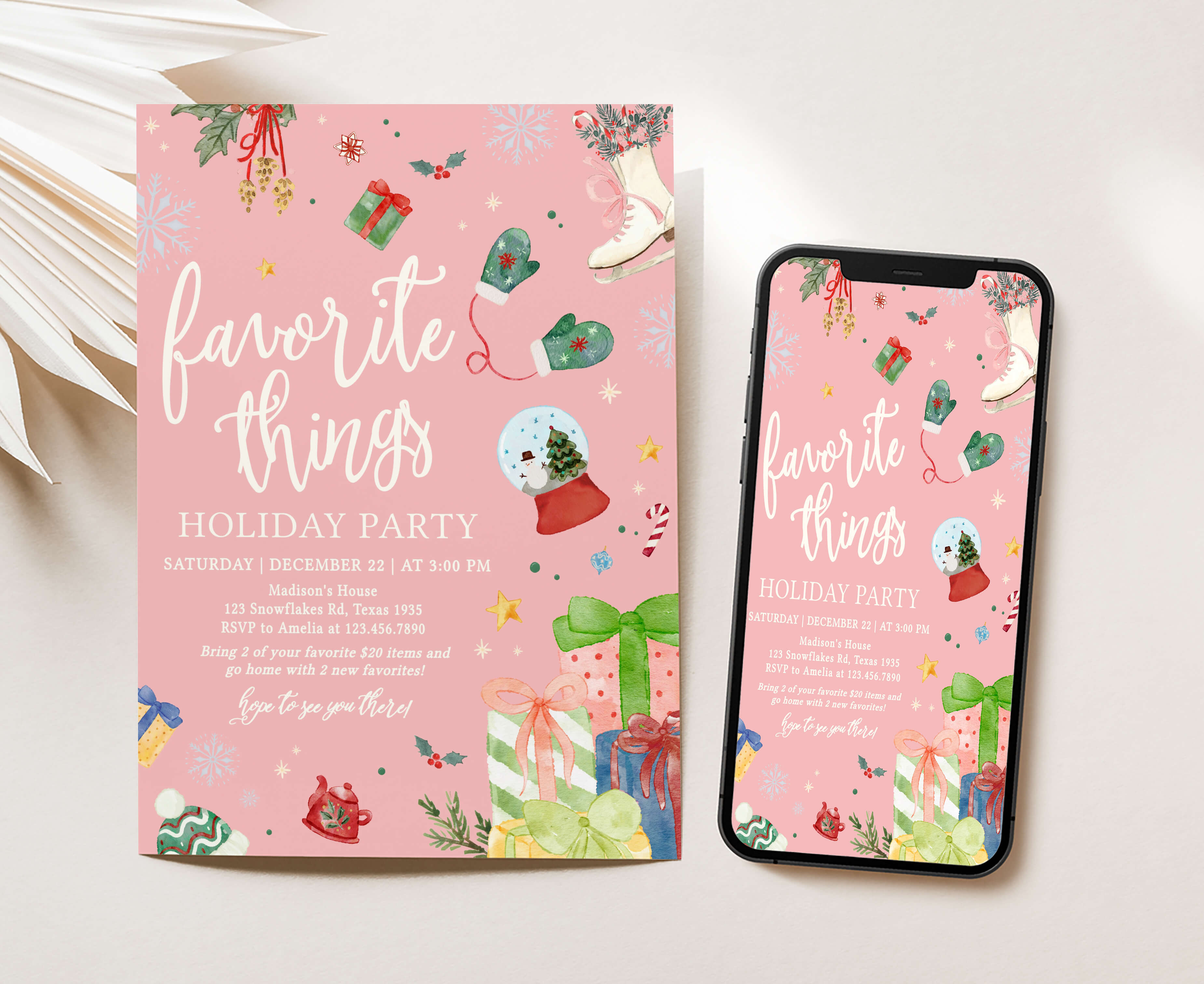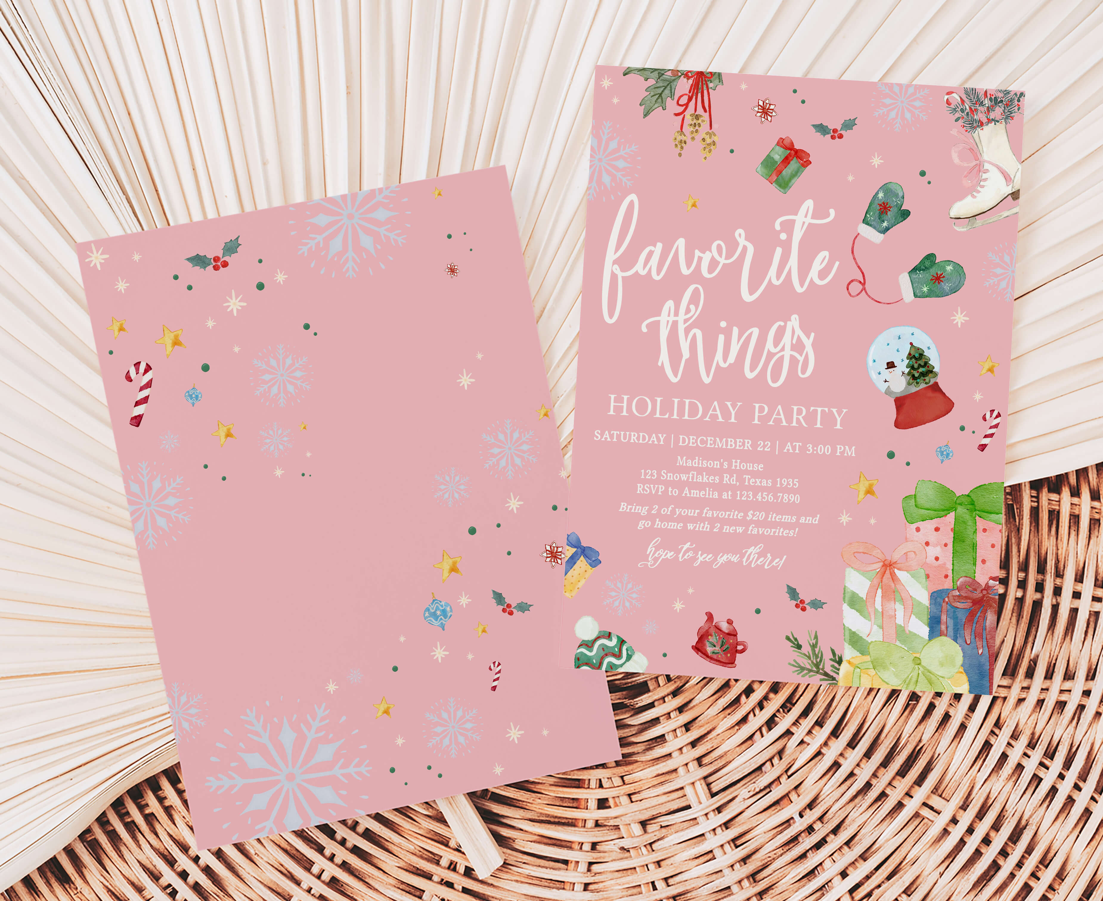 Celebrate with your guests at your Pink Holiday Party using our delightful Christmas Gift Exchange Invitation. This Favorite Things Holiday Invite is the ideal choice to tone for a Christmas-themed celebration.