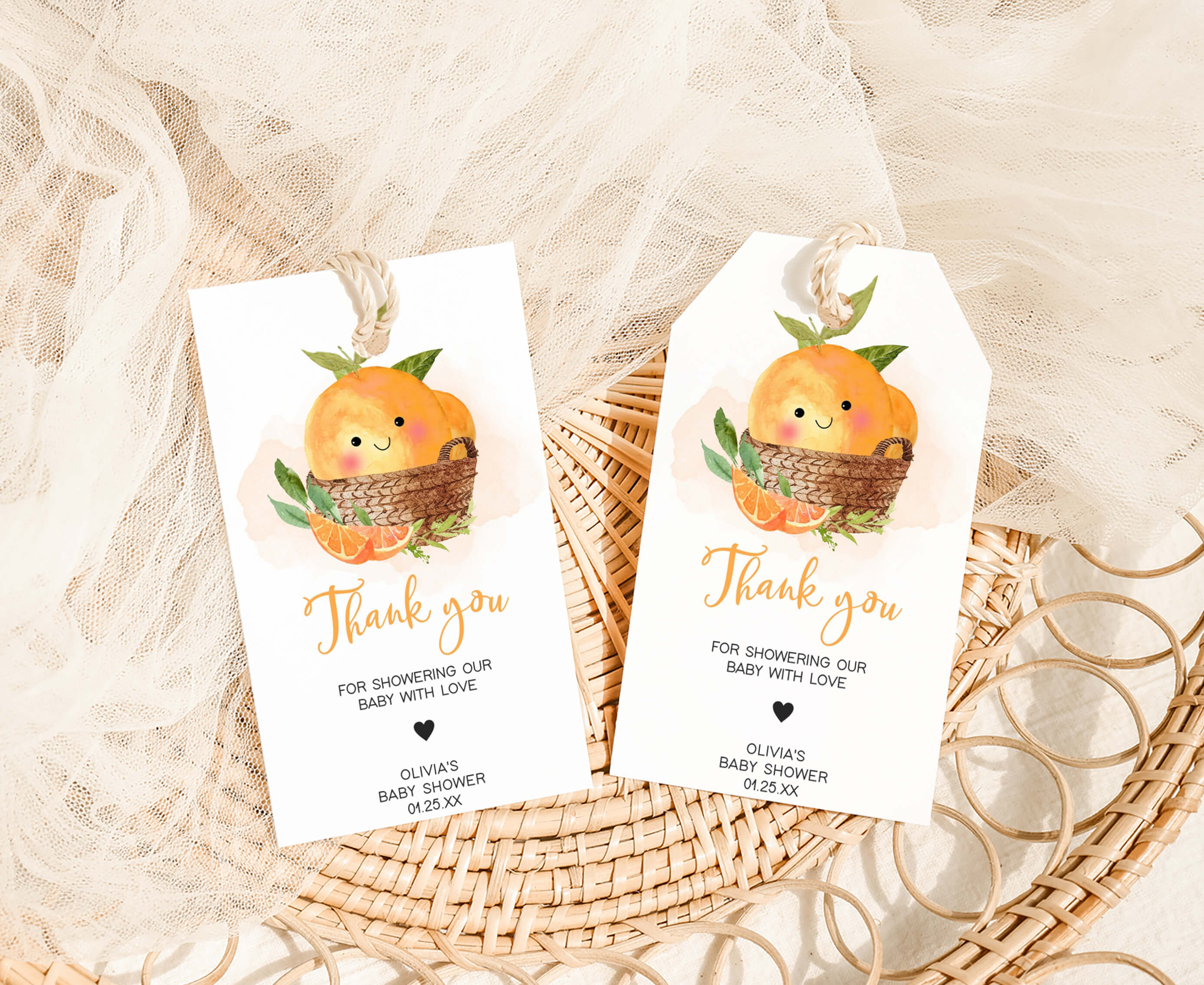 Amplify the charm of your Orange Basket Baby Shower party favors by adding a personal touch with our delightful A Little Cutie is on the Way Baby Shower Gift Tags. These Gender Neutral Orange Thank you Tags are the perfect way to express your gratitude to your guests in a special and heartfelt manner.