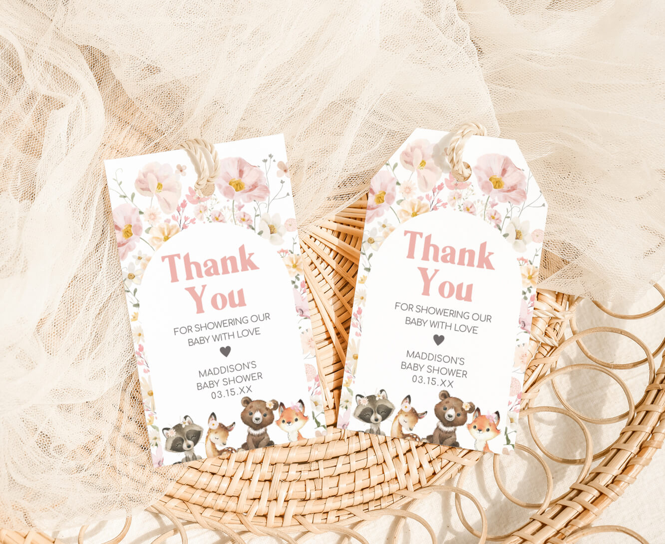 Amplify the charm of your Spring Forest Baby Shower party favors by adding a personal touch with our delightful Floral Woodland Creatures Baby Shower Gift Tags. These Girl Forest Animals Thank you Tags are the perfect way to express your gratitude to your guests in a special and heartfelt manner.